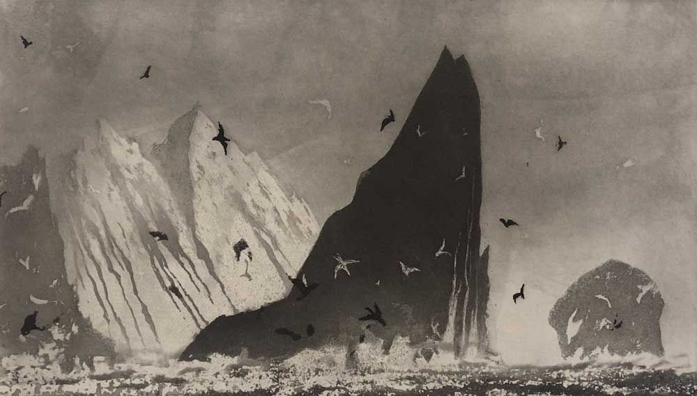 “Expeditions for the past year have been few or delayed and non-existant since March 2020. I have found myself delving deeply into my library of watercolour notebooks from over 50 years of exploring our islands. Contained within over 40 standard sized books (that fit snugly into my jacket pocket) are well over a thousand plein air notes and drawings from all over the British archipelago. In addition there are several hundred loose sheets (6”x12”) from watercolour blocks, containing a wide variety of papers, that I have designed myself and that I have been using increasingly over the last 15 years. Lockdown offers much time for dreaming and the drawings trigger wonderful memories of people, places and extraordinary events and adventures, often in hostile seas. Most of the drawings are produced with etching in mind. For me etching and watercolour are deeply symbiotic.”