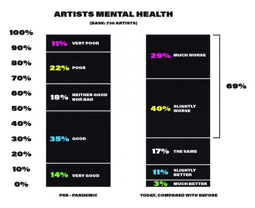 Just published, a new research paper, WhitePaper, reveals “shocking facts on the state of UK artists’ mental health, optimism and finances, impacted by COVID-19. Independent research company IRN Research was commissioned by multidisciplinary artist Stuart Semple to interview UK artists to provide a deep insight into the impact of the pandemic upon professional visual artists in the UK. A total of 730 artists took part in the study”.