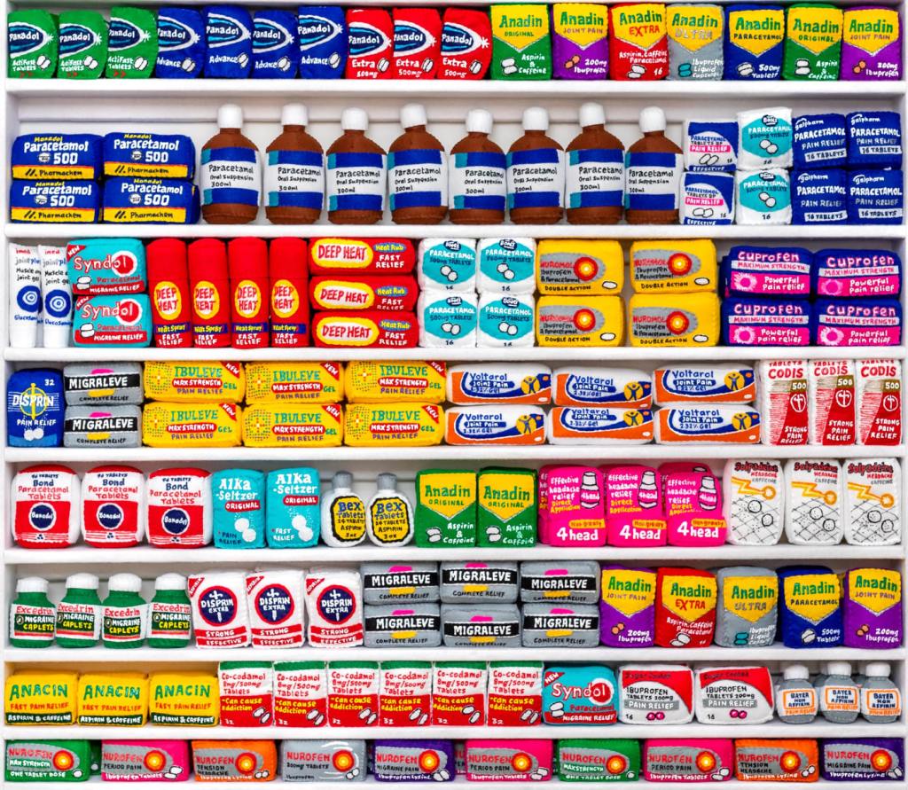 “Created with Sparrow’s characteristic painstaking research and attention to detail, the walls of this Mayfair gallery are transformed into a fully-stocked chemist, handmade completely in felt. In this interactive performance-art piece each and every hand-painted artwork is sold straight off the felted shelf to customers who can purchase the full range of felt pharmaceuticals by the white-coated Sparrow herself”.