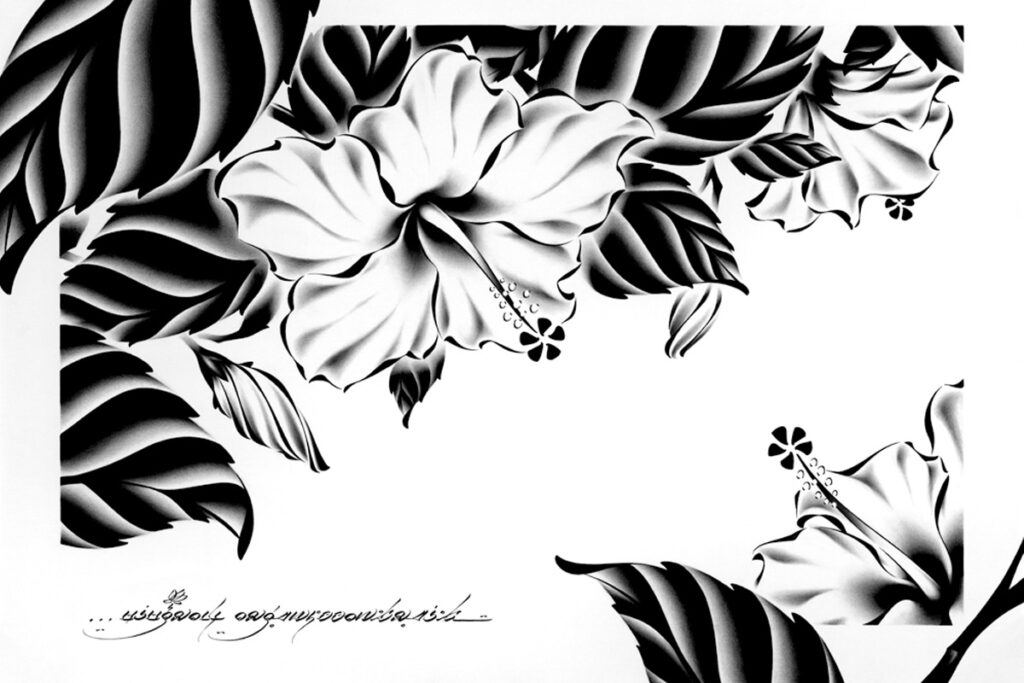 Heavily influenced by Los Angeles ‘Cholo’ style graffiti, fused with the spiritual skills of Asian calligraphy, Usugrow started drawing in 1993 by creating punk rock flyers. He soon became hugely successful as a commercial designer for album covers, fashion brands & skate companies. He has been exhibiting his art in galleries all over the world, and his black and white illustrations have become instantly recognisable”.
