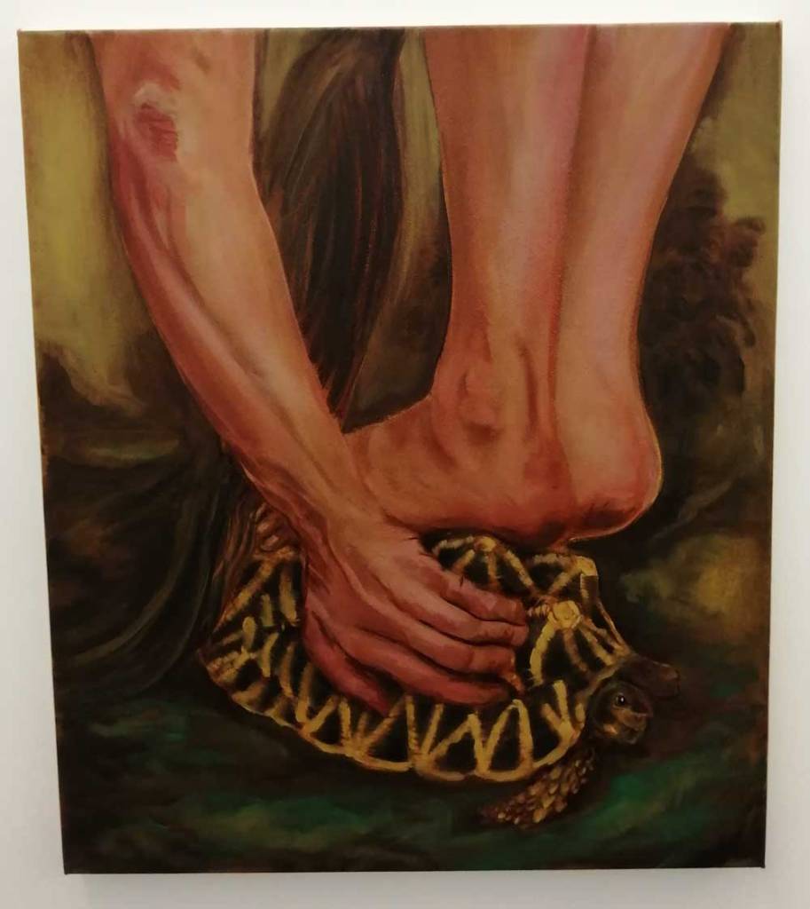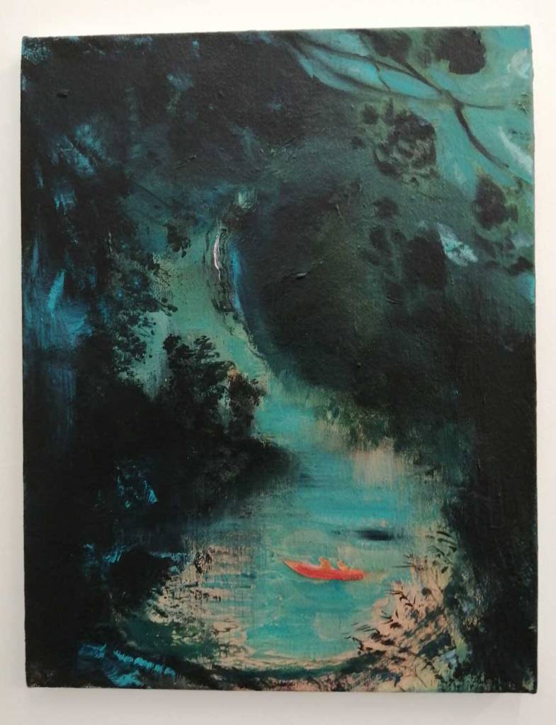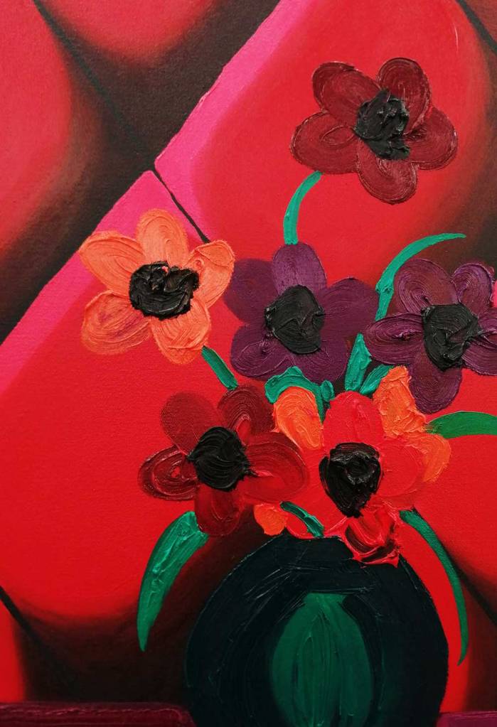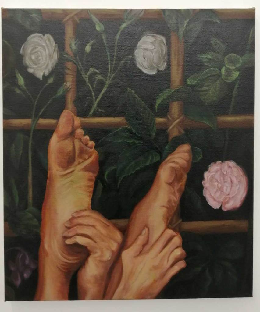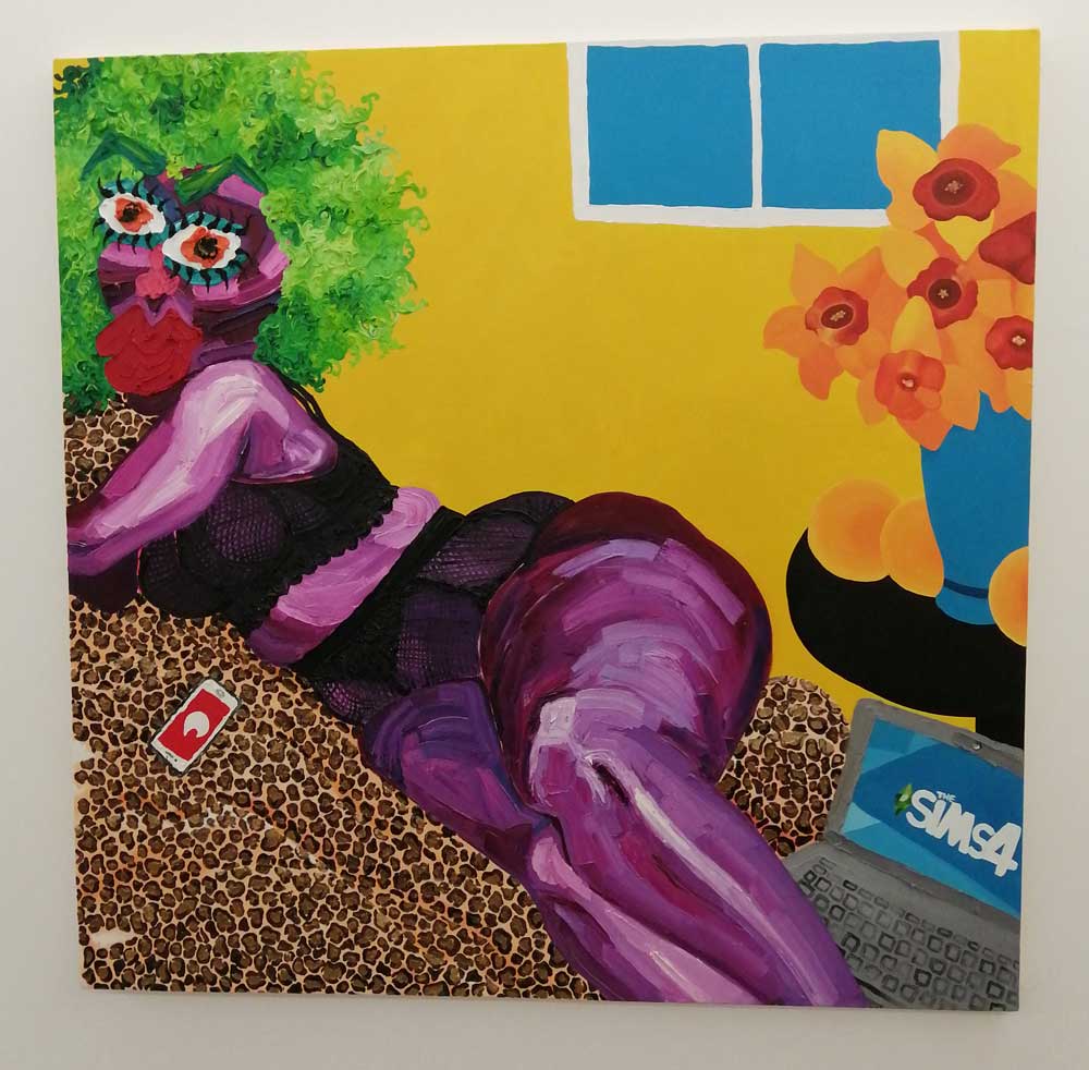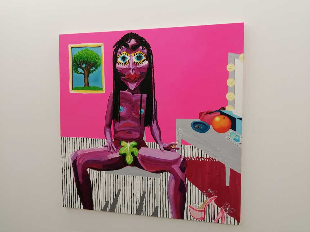 Her paint demands your attention, her figures certainly do, everything here says strong – strong paintings, strong artist. Her palette is certainly alive, a whole world of slightly strange colour, purples arguing with bright yellows and dayglo greens and even brighter brushstrokes, paint thick with intent, strange, maybe even disturbing? Unsettling? No, just controlling the narrative, just doing it on their terms, on her terms, oh bondage, up yours! everything here appears to be on Hattie Malcomson’s, this promises to be interesting and yes, now i re-run it all in my head, maybe I have already been to an exciting show as we ease our way towards a new normal? Need to go back, art excites, good thing? Nah, way more than that….