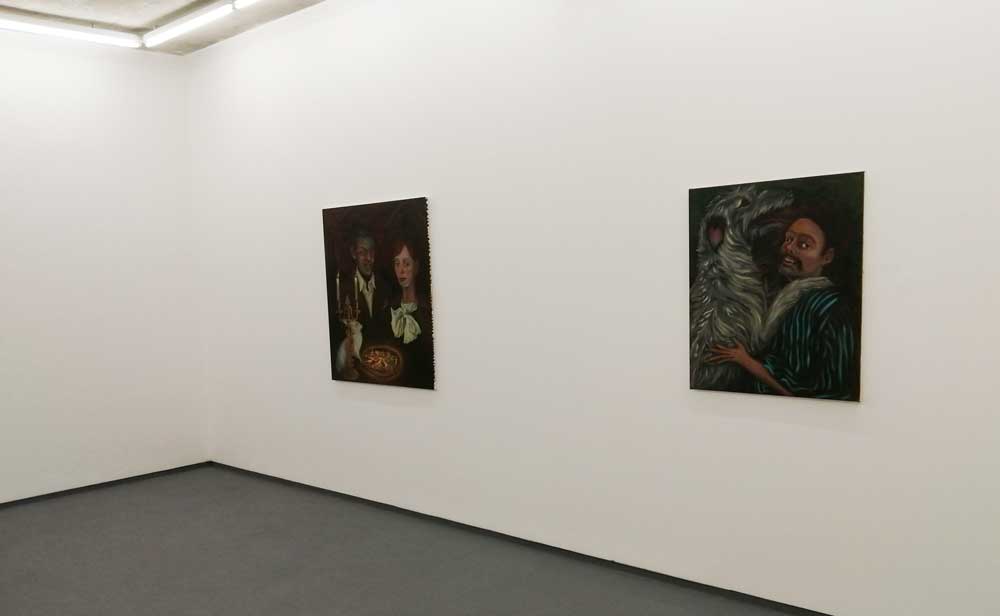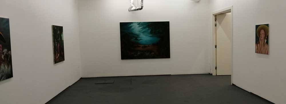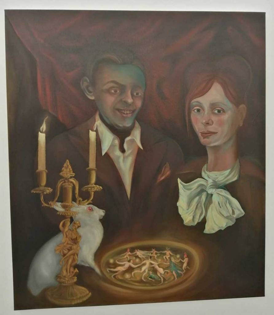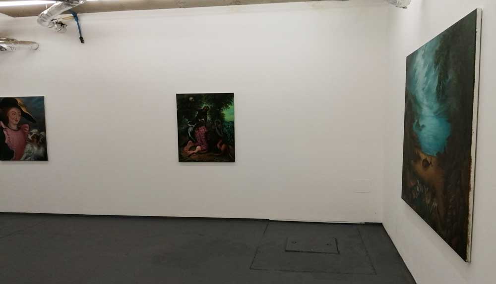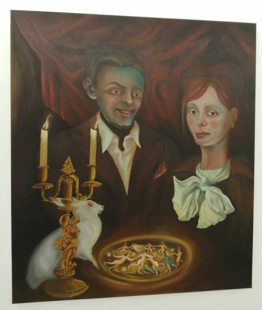 Right now Hattie Malcomson is sharing the building with a show that openrf a few days before hers, sharing the interlocking rooms and the walls with the paintings of Alex Hudson, and as is almost always the case at Fred Mann’s big white basement gallery, it all works together. Alex Hudson’s paintings are something far more “traditional”, deliberately so. Once again the curation and the two artists sharing the space (rooms to themselves) is spot on – surely they really shouldn’t work together but they do, almost perfectly so. Alex Hudson’s work celebrates tradition, the paintings feel deliberately Northern European, playfully so – hints of fantasy, slightly tongue-in cheek magic, otherworldness, hints of William Blake? Maybe even a Gregory Jacobsen hint or two next to the hints of Brueghel? Shakespeare references? Dutch Masters? Plato, there’s lots to read in these paintings, they’re strange, I don’t know if I like them or not? I certainly like the way they’re painting, the playing with tradition, do they disturb in the right way? Are they uncomfortable? Are they wonderful? Am I sitting on the fence?