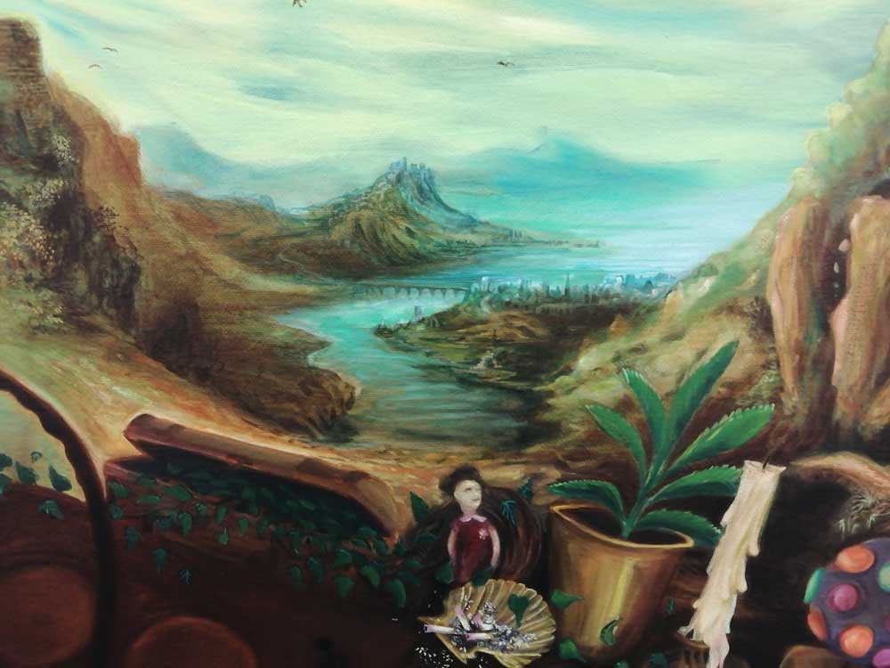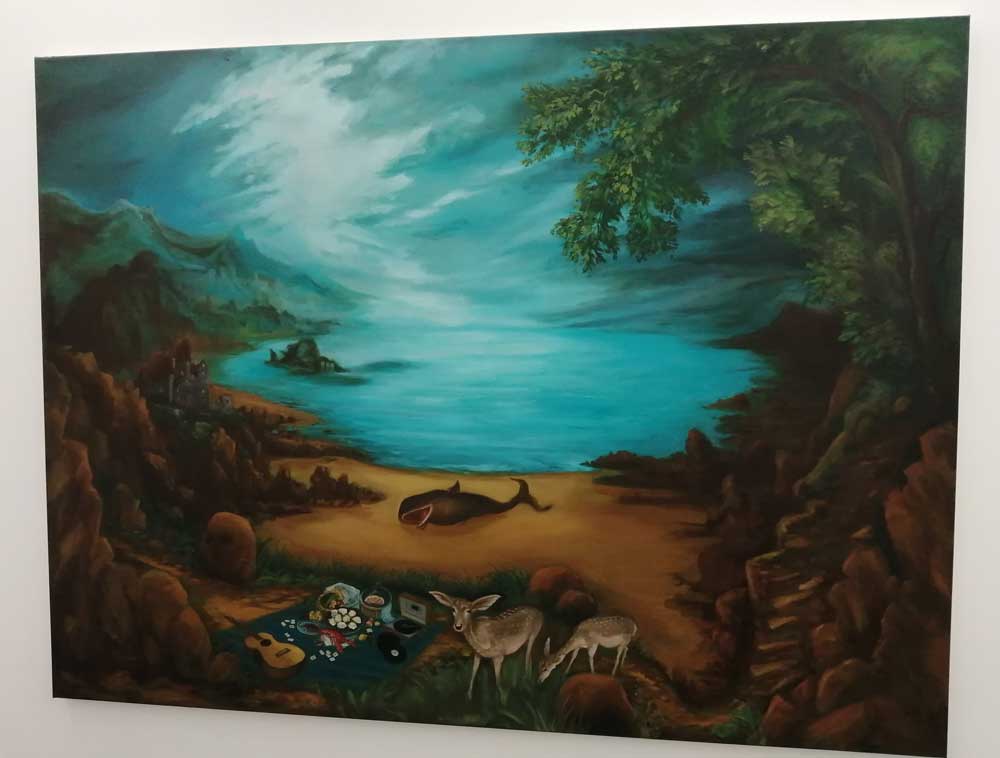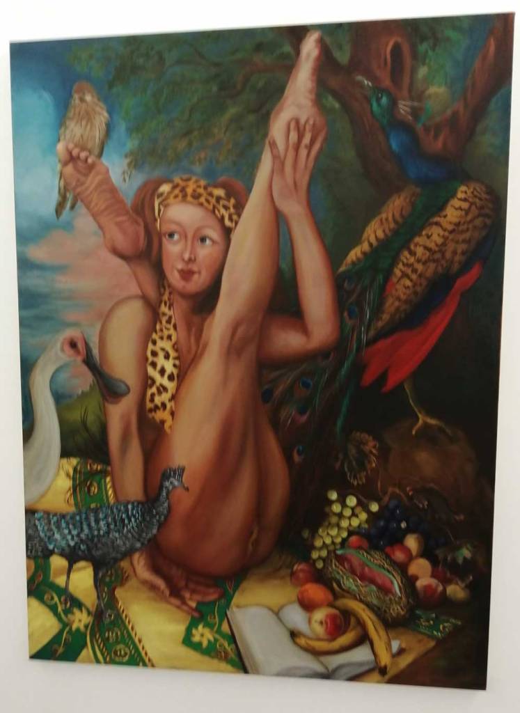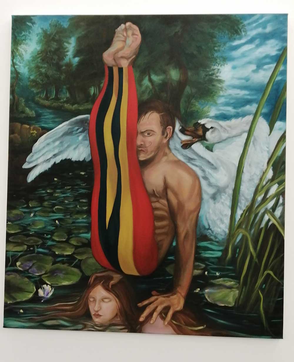Right now Hattie Malcomson is sharing the building with a show that openrf a few days before hers, sharing the interlocking rooms and the walls with the paintings of Alex Hudson, and as is almost always the case at Fred Mann’s big white basement gallery, it all works together. Alex Hudson’s paintings are something far more “traditional”, deliberately so. Once again the curation and the two artists sharing the space (rooms to themselves) is spot on – surely they really shouldn’t work together but they do, almost perfectly so. Alex Hudson’s work celebrates tradition, the paintings feel deliberately Northern European, playfully so – hints of fantasy, slightly tongue-in cheek magic, otherworldness, hints of William Blake? Maybe even a Gregory Jacobsen hint or two next to the hints of Brueghel? Shakespeare references? Dutch Masters? Plato, there’s lots to read in these paintings, they’re strange, I don’t know if I like them or not? I certainly like the way they’re painting, the playing with tradition, do they disturb in the right way? Are they uncomfortable? Are they wonderful? Am I sitting on the fence?