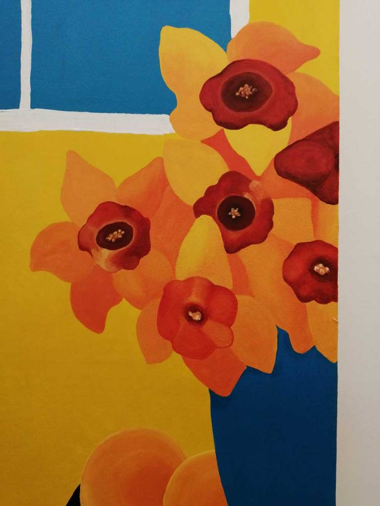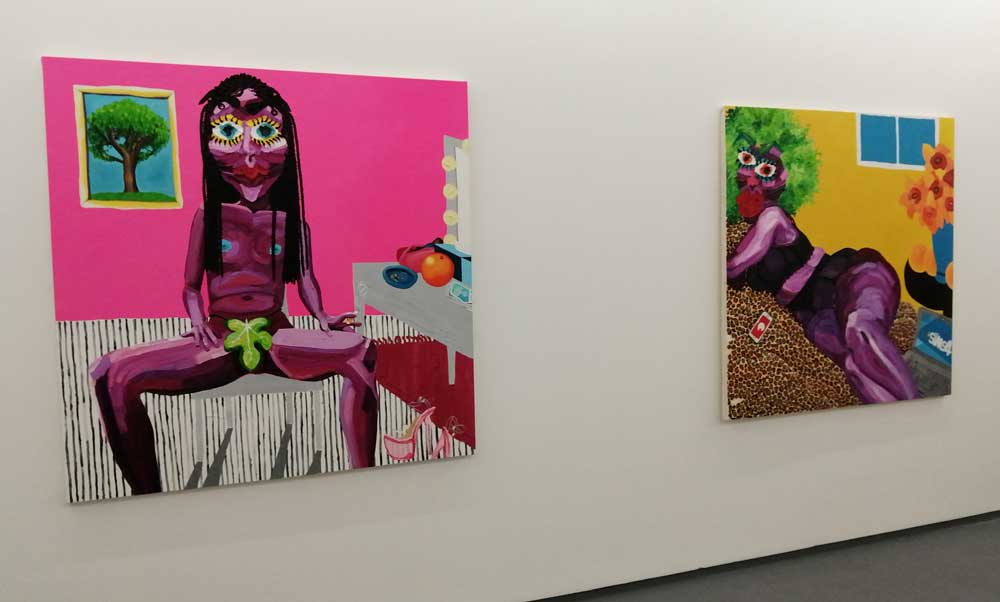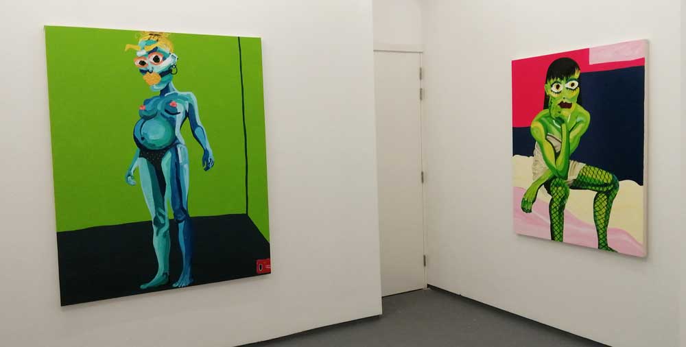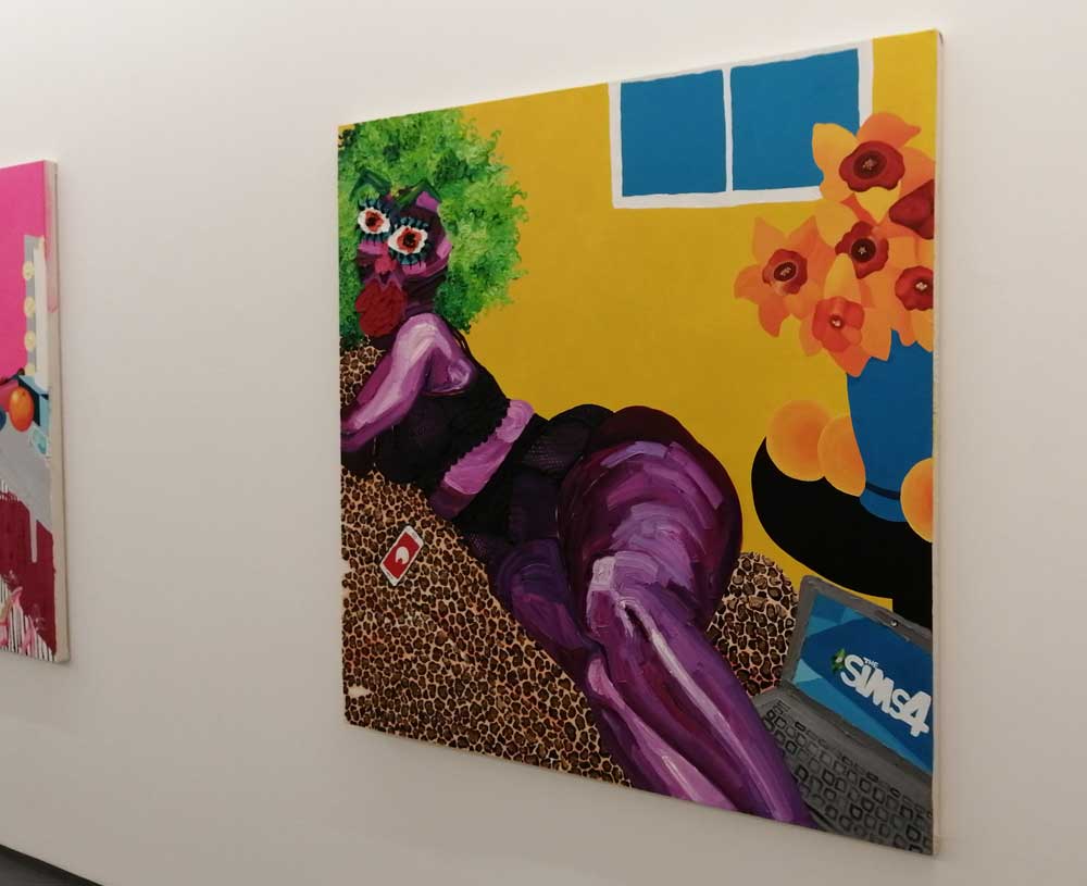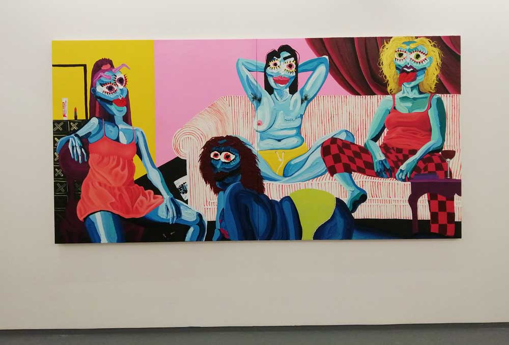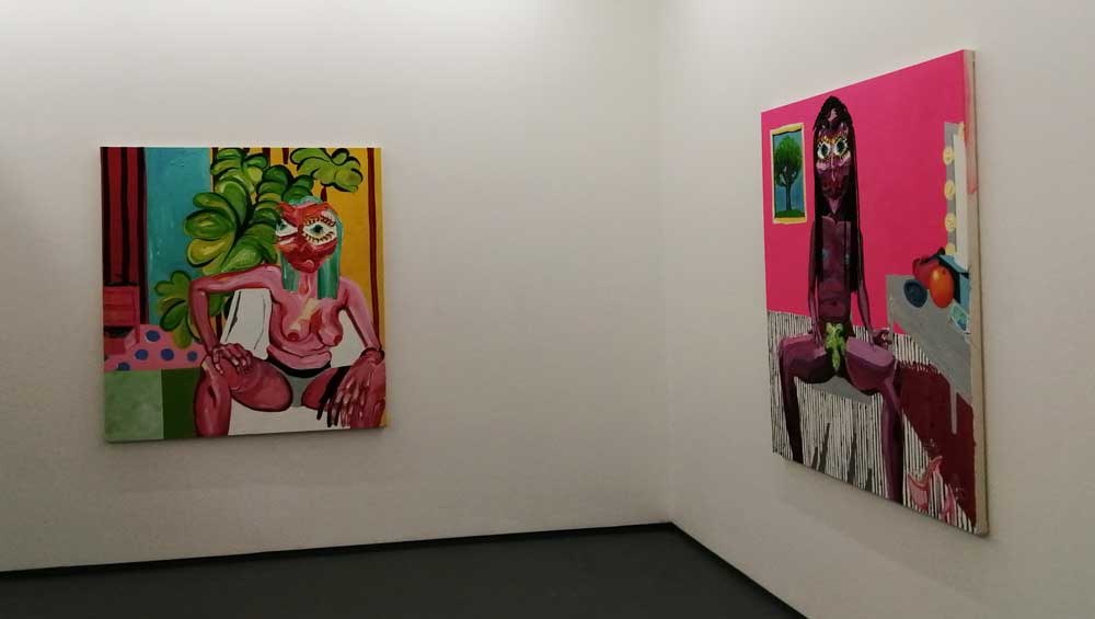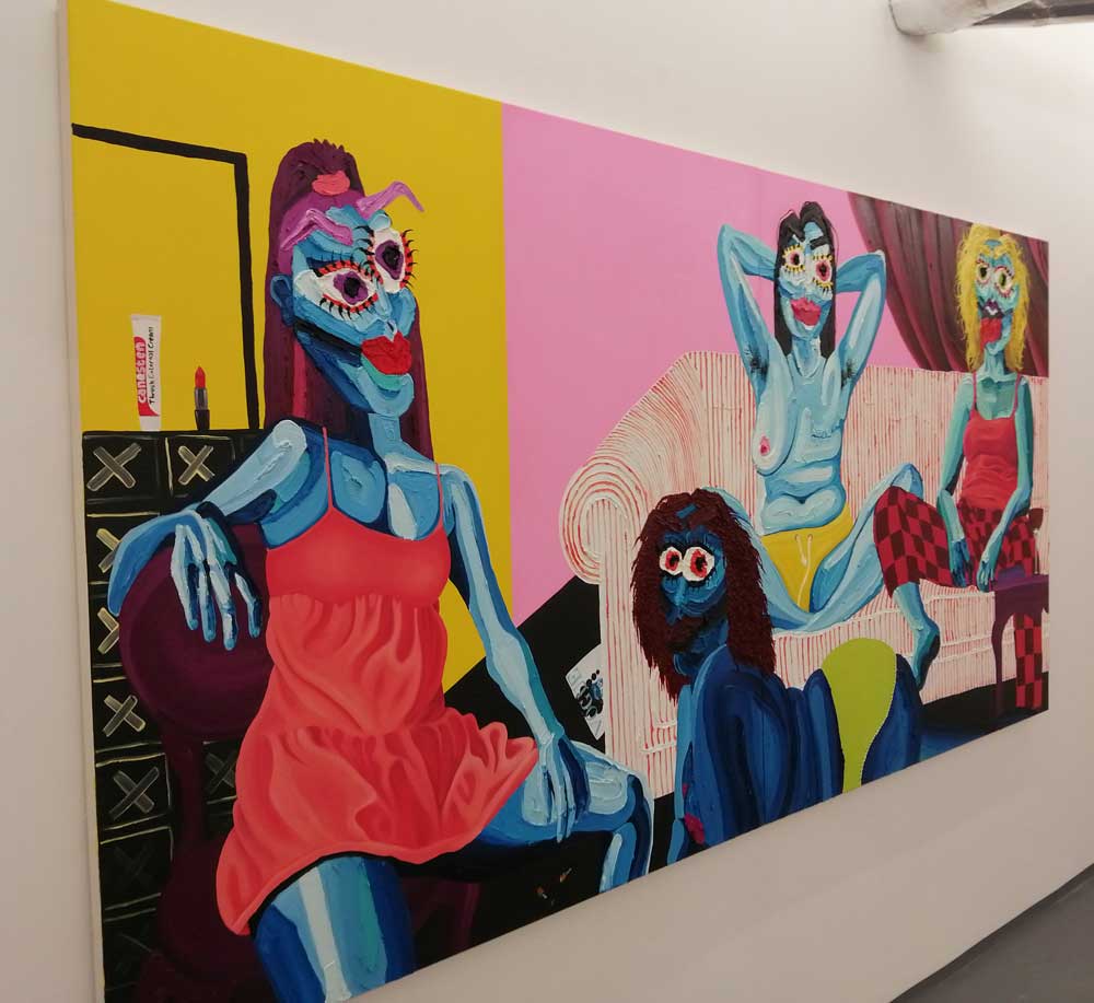 Yes, her paintings certainly are very much here and now, nothing safe and polite about Hattie Malcomson’s rather demanding rather exuberant, extremely bright demanding pieces of art – there might even be some floating anarchy in there – and yes, there is something defiant happening on those canvases up there on the gallery walls. Who are these creatures with the big big eyes? What kind of planet do these women live on? Who are they? Who is Hattie Malcomson? You certainly get the idea that she’s in control of the narrative playing out on these white East London walls