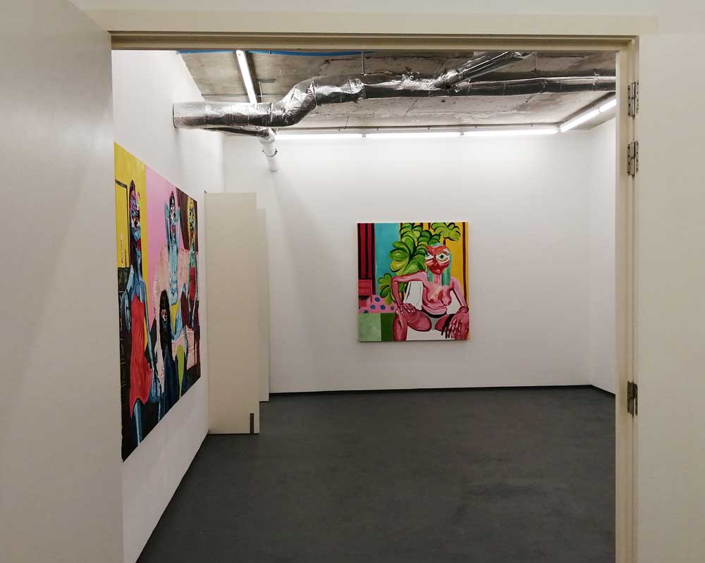Good things like Hattie Malcomson‘s rather vivid debut solo show “Sisters, Sisters, Sisters” at East London’s New Art Projects. Is “good things” the right turn of phrase, her paintings certainly challenge, there might be something exciting about them? Something bold, big, confident, strident, paint that jumps off the wall and demands attention, nah, “good things” is not quite the right turn of phrase. Hattie Malcomson’s paintings are something that stick around in your head just a little longer, there’s a need to go back and have another look, were the they really that good? Were they really that demanding? That strange? Those eyes? Those details, those flowers in the background, the packages on the shelves, this little stories on the side. Apparently she’s only just graduated, apparently this really is her first gallery show, her paintings would have you think she’s bee nshowing for years, these are bold confident statements, certainly a lot more than just “good things”…