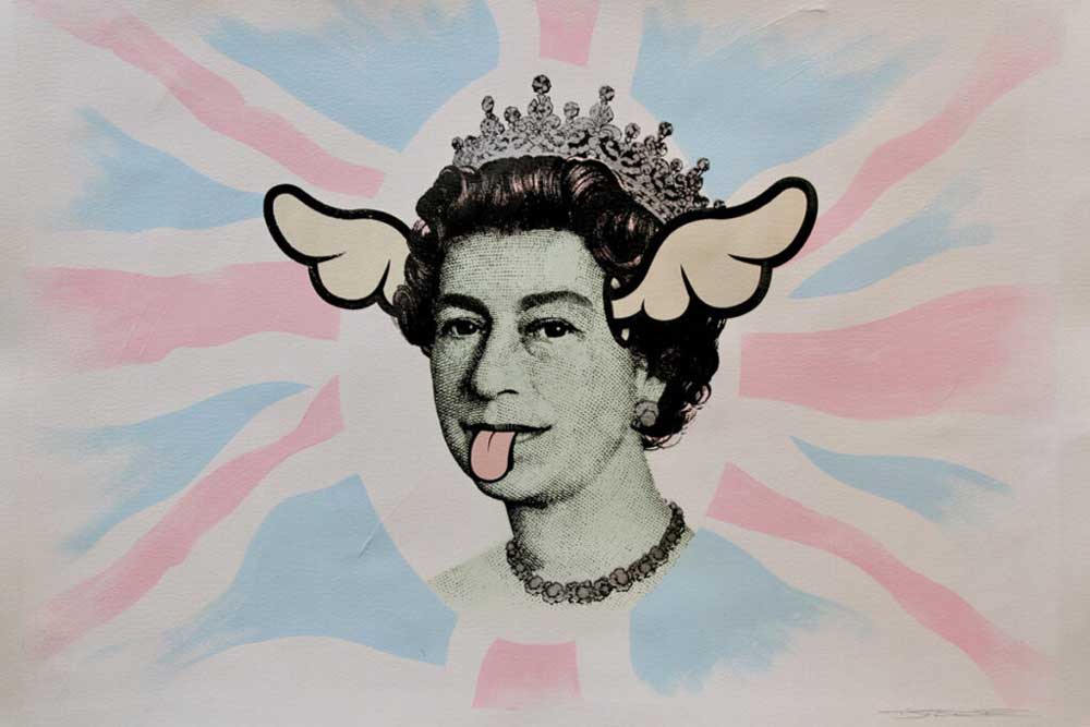 “D*Face and StolenSpace Gallery are thrilled to present, in combined celebration of her Majesty’s 95th Birthday and the UK’s newly restored social freedom (spoke to soon there didn’t you, did you really trust Johnson not to spaffle it up again?), ‘A Right Royal S#!t Show’. The gallery be exhibiting her ‘Winged Highness’ across a variety of mediums, from D’s very earliest 2000 screen-prints to his upcoming digital artworks. Alongside the backdrop of his work, StolenSpace will also be hosting the UK release of D’s latest collaborative sculpture with Medicom Toys, ‘Dog Save The Queen’. This 40cm tall, solid stone resin bust of Queen ‘Liz will be available in limited quantities fresh from the box, as well as a small number of hand customised busts by D as part of the show”.