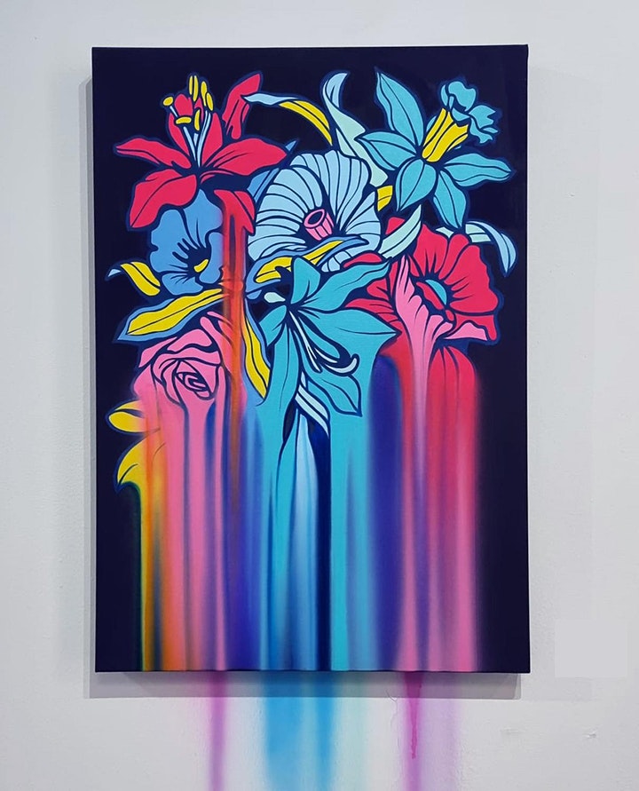 Nerone‘s is a french artist based in London. London’s vibrancy and nightlife inspire many of his paintings. His more organic work represents unique colourful flowers mixed with the surreal lighting of fluorescent tubes. As he is aware of the various ecological challenges and economic problems of today’s world, Nerone constantly insists on spreading a positive message through his art.