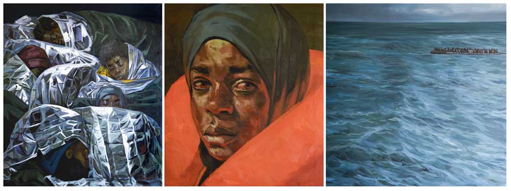 Amongst the most devastating paintings are those that take a wider perspective, focusing on the perilous sea journey that hundreds of migrants make every day in search of better living conditions. In one work, a dangerously overcrowded boat floats towards the front of the canvas while in the background a second boat is enveloped in flames, smoke billowing into the sky in huge plumes. Another painting depicts life jackets floating emptily on the waves, once again underlining the potentially fatal risk that such a journey presents. As with all of the works in the series, the paintings possess a haunting sense of stillness that reflects the historic impact of the crisis and appeals to our shared sense of humanity”.