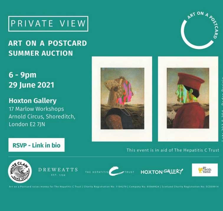 “The Hepatitis C Trust’s incredible fundraising event, Art on a Postcard returns with a superb line up for their 2021 Summer Auction. The Art on a Postcard auctions have raised over three quarters of a million pounds to date, making an enormous difference to the lives of those living with Hepatitis C. This year the trust is celebrating its twentieth anniversary, and the amazing achievements they have made over the years. Taking an innovative approach to charity work, it is a patient-led and patient-run organisation: most of their board, staff, and volunteers have had hepatitis C and have cleared it after treatment. The Hepatitis C trust works with individuals in the community, those in prison and those with addiction, providing all manner of counselling, medical and personal support. Alongside this, they are working to eliminate the illness by 2025. They have also managed to galvanise over 190 countries to commit to Hep C elimination by 2030. Furthermore, their tireless work led to NHS England announcing an elimination deal with the aim of meeting a 2019 deadline.