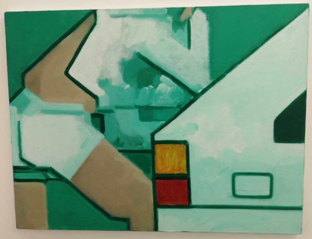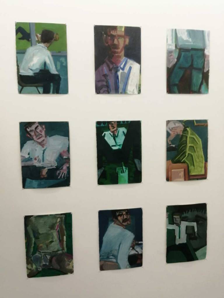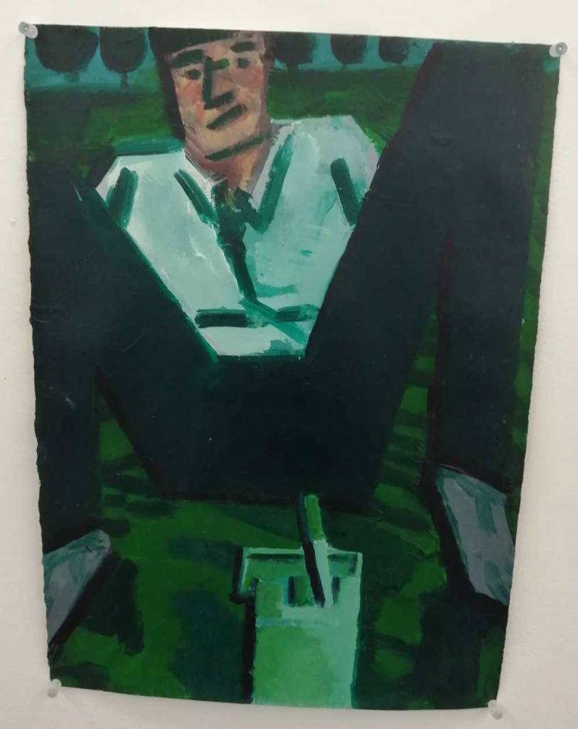 Adam Hennessey’s paintings are in the first and second rooms, there’s plenty of space for each piece to breathe, the first thing that strikes you in the colour, the power of the pieces all together, the strength of the turquoise, the blue, the minty greens, and then you focus on the edges of the subjects, the squareness of the car, the (block)heads, the lines and you don’t immediately cotton on to the fact that you know his work from previous shows here – those smiles of 2017, and yes it is so obviously the same artist once the coin finally drop. This whole body of new work is something really different and at the same time as obvious as it could be that it could only be from Adam Hennessey. And it is surely hard to not like the way Adam paints? To not like the joy – joy rather than fun, this isn’t throwaway fun. This is a celebration of something or other, of a time and place, of floppy discs, Austin Alegro lights (is it an Alegro? Of a time of very square cars at least). There’s a dialogue here, a commitment to the paintings, to himself as an artist, to the viewer, not a challenge, just a commitment, something wholehearted, something that matters to him and us. They are blocky, almost but never quite cartoony, or maybe they are panels from a cartoon strip? Whatever they are I really like them, love the colour, the size, the ambition, love the angles, the relationship between the pieces, the conversations the relatively big pieces have with each other from one wall to another. It is wrong to say this is fun, but it is fun, and I love that floppy disc! Who paints as floppy disc like that?