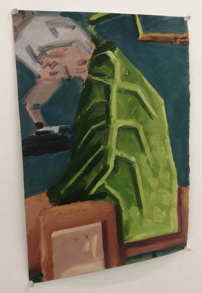 For Adam Hennessey’s third solo show at New Art Projects ‘Adam and Steve’ he looks back to his awkward teenage years growing up gay in the 1990’s. Hennessey describes his new paintings as “memory fantasies”. He uses a reduced palette of greens, to create an artificial light that helps to set the scenes in them, in the past. Like watching an old film or discoloured home movie the figures move through a distorted green haze acting out his teenage dreams and desires.