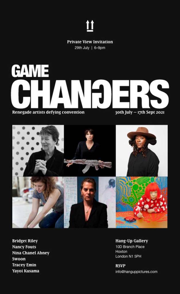 2: Hang-Up presents Game Changers – Renegade artists defying convention – The show runs from 30th July until 17th September2021 with a private view on the evening of 29th July 6-9pm. “Hang-Up’s first exhibition of 2021 is a celebration of women in contemporary art. Presenting works by Bridget Riley, Tracey Emin, Yayoi Kusama, Nancy Fouts, Swoon and Nina Chanel Abney, the show highlights women who are and were true artistic game changers, playing on a field that was rigged against them”. Hang-Up is now at, 10D Branch Place, Regents Canal, Hoxton, London, N1 5PH