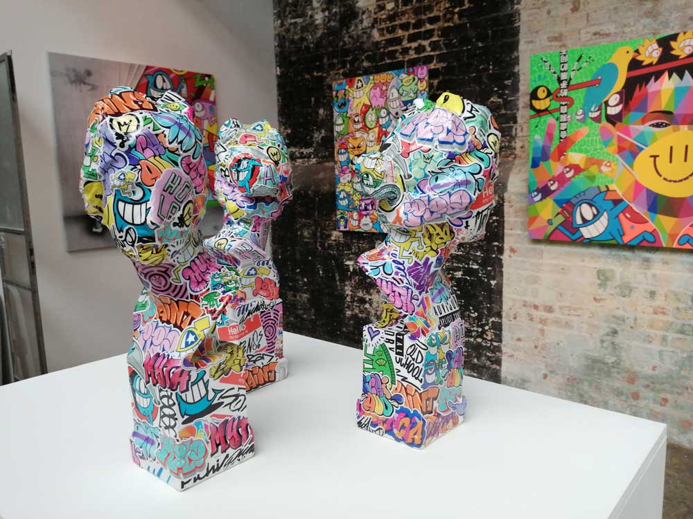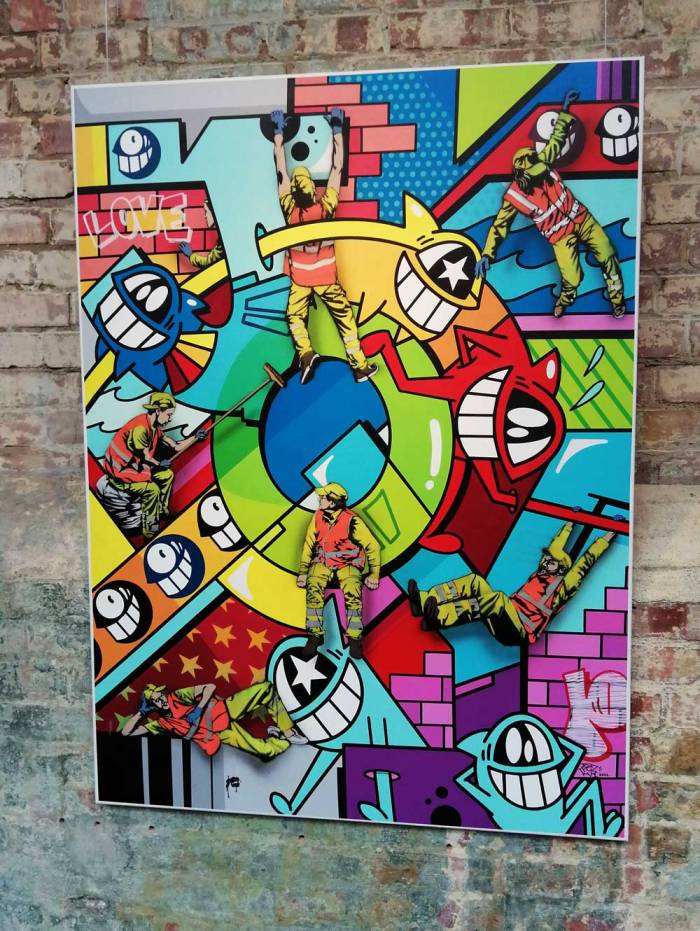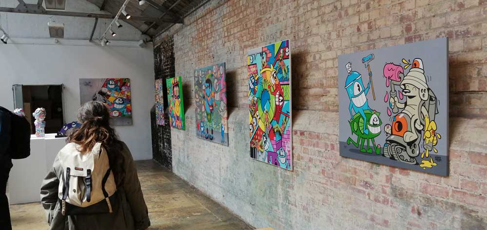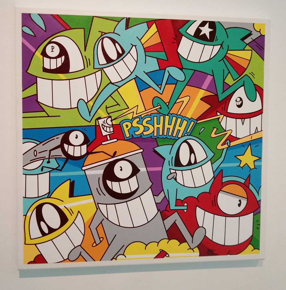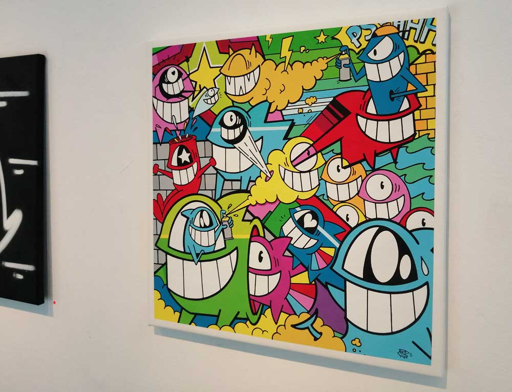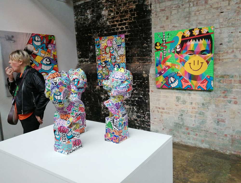 We passed a Pez on the way to the show, pretty hard not to pass a Pez on the streets of London, there’s been a lot of smiling out there, they’ve been documented often enough of these fractured pages over the years. “StolenSpace is excited to present the new summer group exhibition” so trumpets the East London gallery that you still find at the very top of Brick Lane and just around the corner from the stale smells of the tired old Whitechapel Gallery. “22 Years Smiling with Friends” – the show is billed as a group show and features the work of street art stars such as D*face, Buff Monster, Okuda , FlyingFortress, Cranio, Jauneart , Martin Whatson, PichiAvo, Chanoir, Chicadania, Annahita Hessami, Fark, Fanakapan, Mr Cenz, Mau Mau, Mighty Mo, Otto Schade, Ponk, Eject, Ronzo, Cheeba, Jaykaes, Discreet, Malarky, BRK18 – familiar names, instantly recognisable but really this is a Pez solo show – Pez and friends, smiling together but this is very much a solo show. And it is about smiling – “Pez is now celebrating his 22 years of painting on the streets, sharing it with his street artist friends. This show will feature collaborations on canvas, prints and sculptures”. A new Pez piece encountered on the street does demand a smile, that distinctive smile-style does demand you do indeed grin back, yeah, okay, so you could point at the one trick pony street artist thing once again, – get yourself one strong graphic idea, repeated it again and again (and again) on every street corner, have a show in a slick urban art gallery, bring out the coffee table book, but that would be a very cynical way of smiling, and anyway, isn’t the art of repetition a rather fine one? High end brightly coloured pop art? Repeat after me, what’s wrong with that?