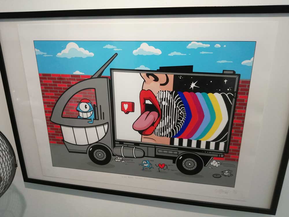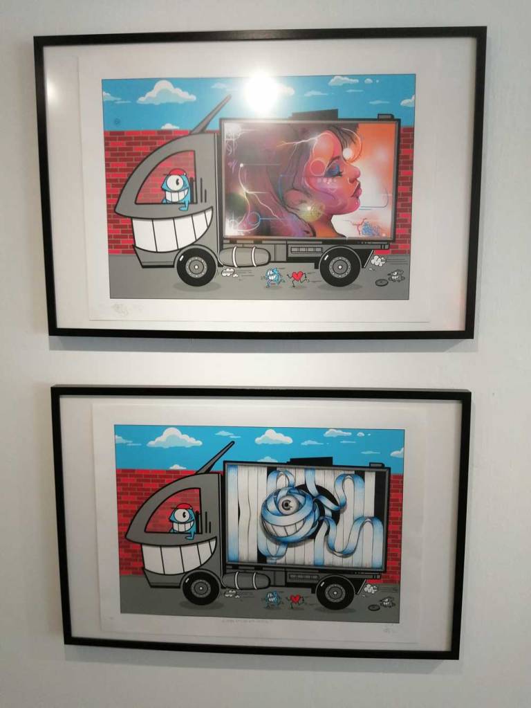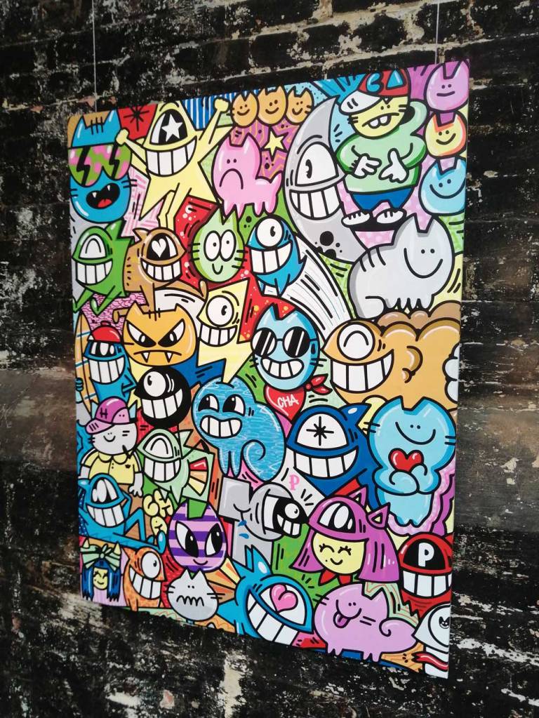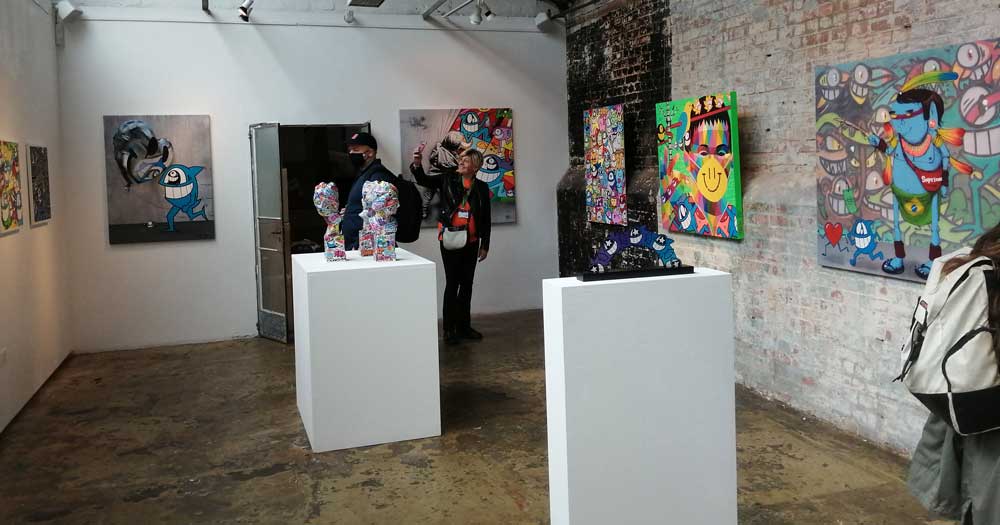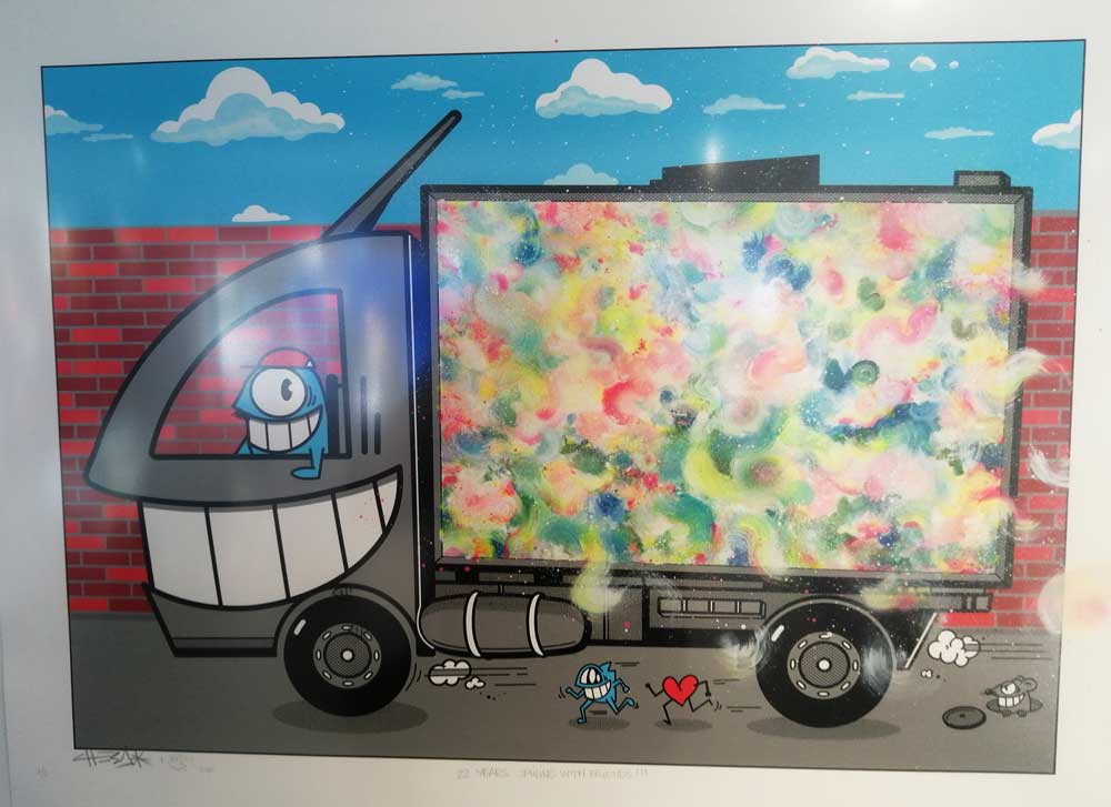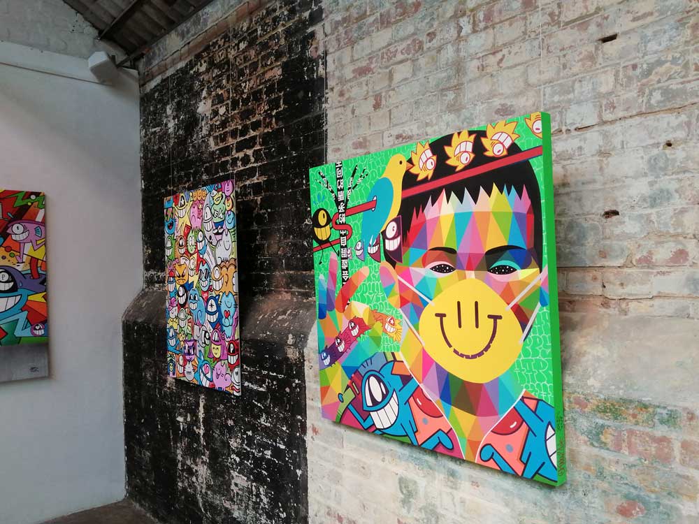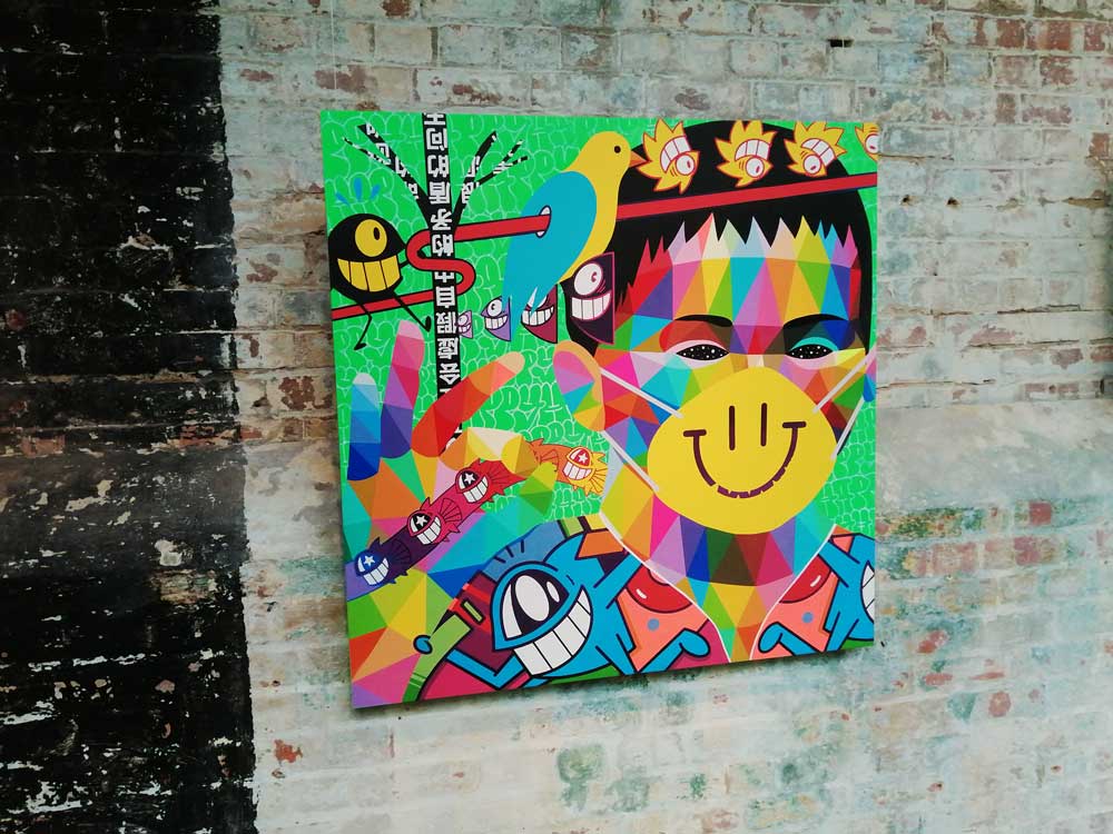 We passed a Pez on the way to the show, pretty hard not to pass a Pez on the streets of London, there’s been a lot of smiling out there, they’ve been documented often enough of these fractured pages over the years. “StolenSpace is excited to present the new summer group exhibition” so trumpets the East London gallery that you still find at the very top of Brick Lane and just around the corner from the stale smells of the tired old Whitechapel Gallery. “22 Years Smiling with Friends” – the show is billed as a group show and features the work of street art stars such as D*face, Buff Monster, Okuda , FlyingFortress, Cranio, Jauneart , Martin Whatson, PichiAvo, Chanoir, Chicadania, Annahita Hessami, Fark, Fanakapan, Mr Cenz, Mau Mau, Mighty Mo, Otto Schade, Ponk, Eject, Ronzo, Cheeba, Jaykaes, Discreet, Malarky, BRK18 – familiar names, instantly recognisable but really this is a Pez solo show – Pez and friends, smiling together but this is very much a solo show. And it is about smiling – “Pez is now celebrating his 22 years of painting on the streets, sharing it with his street artist friends. This show will feature collaborations on canvas, prints and sculptures”. A new Pez piece encountered on the street does demand a smile, that distinctive smile-style does demand you do indeed grin back, yeah, okay, so you could point at the one trick pony street artist thing once again, – get yourself one strong graphic idea, repeated it again and again (and again) on every street corner, have a show in a slick urban art gallery, bring out the coffee table book, but that would be a very cynical way of smiling, and anyway, isn’t the art of repetition a rather fine one? High end brightly coloured pop art? Repeat after me, what’s wrong with that?