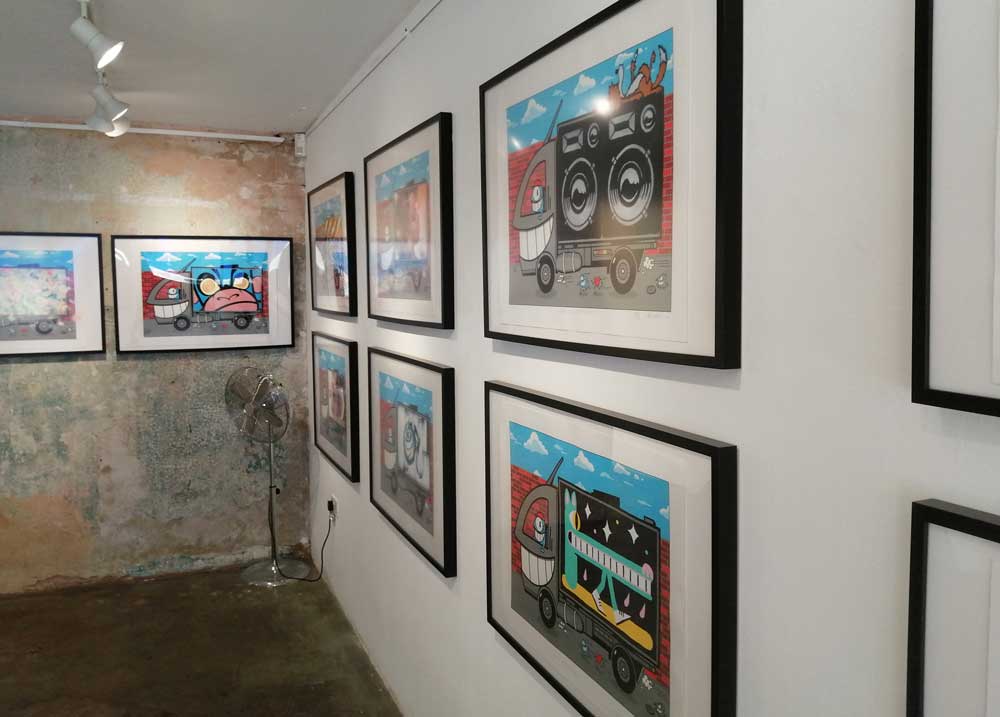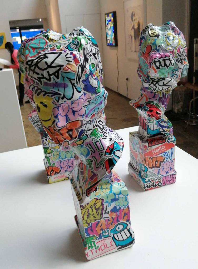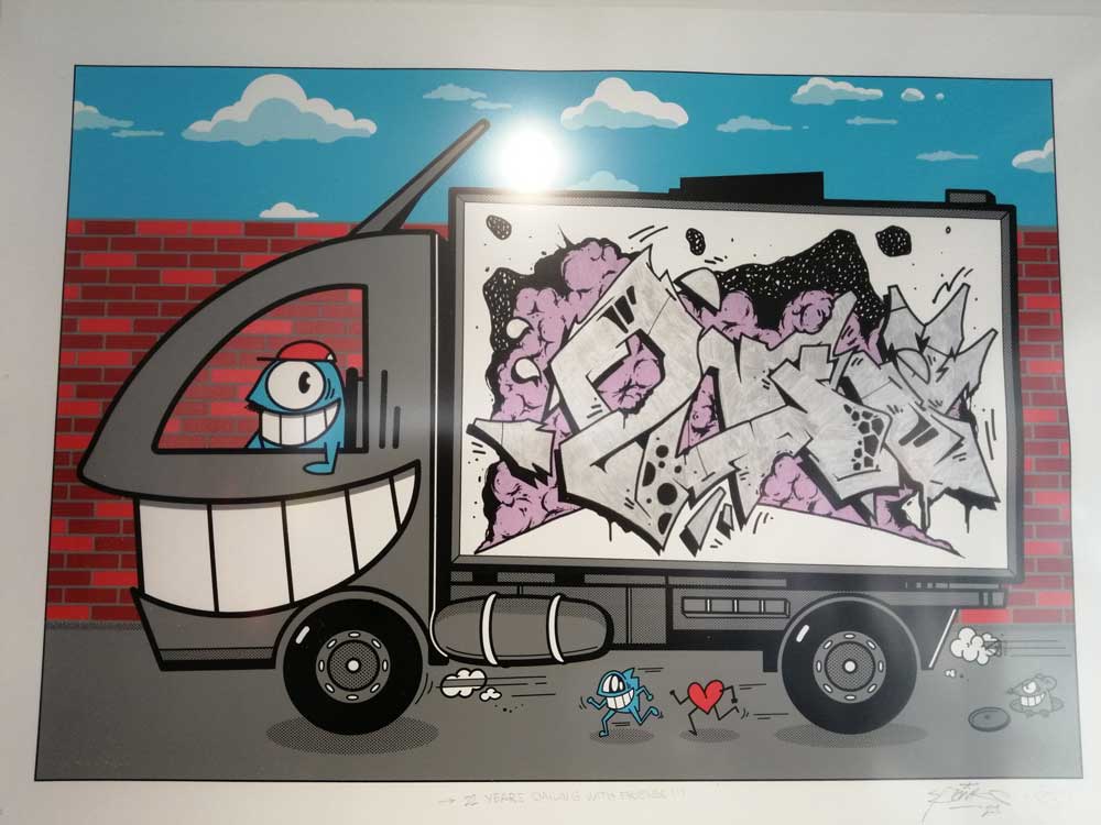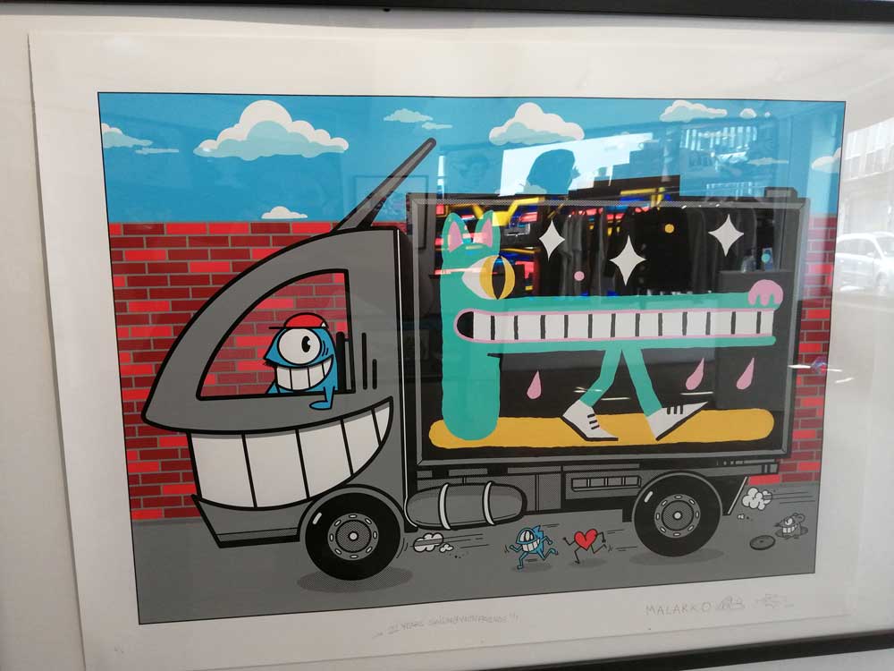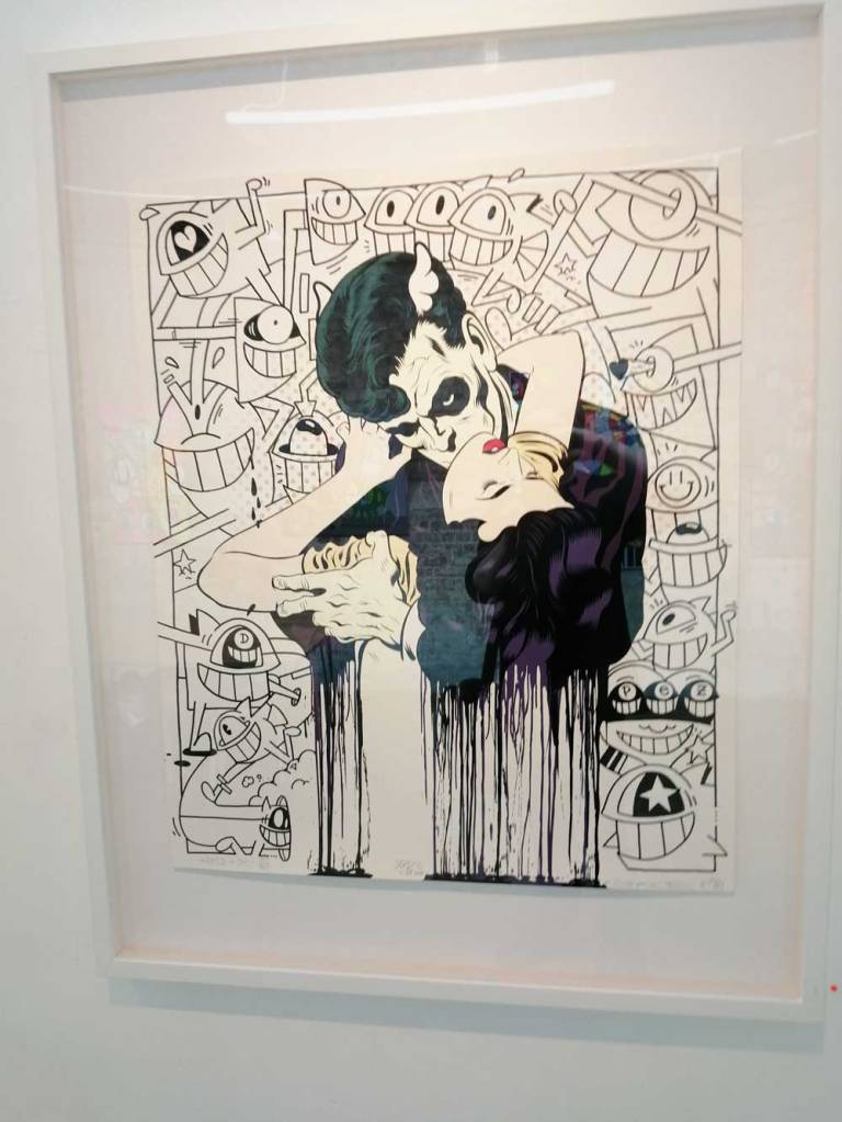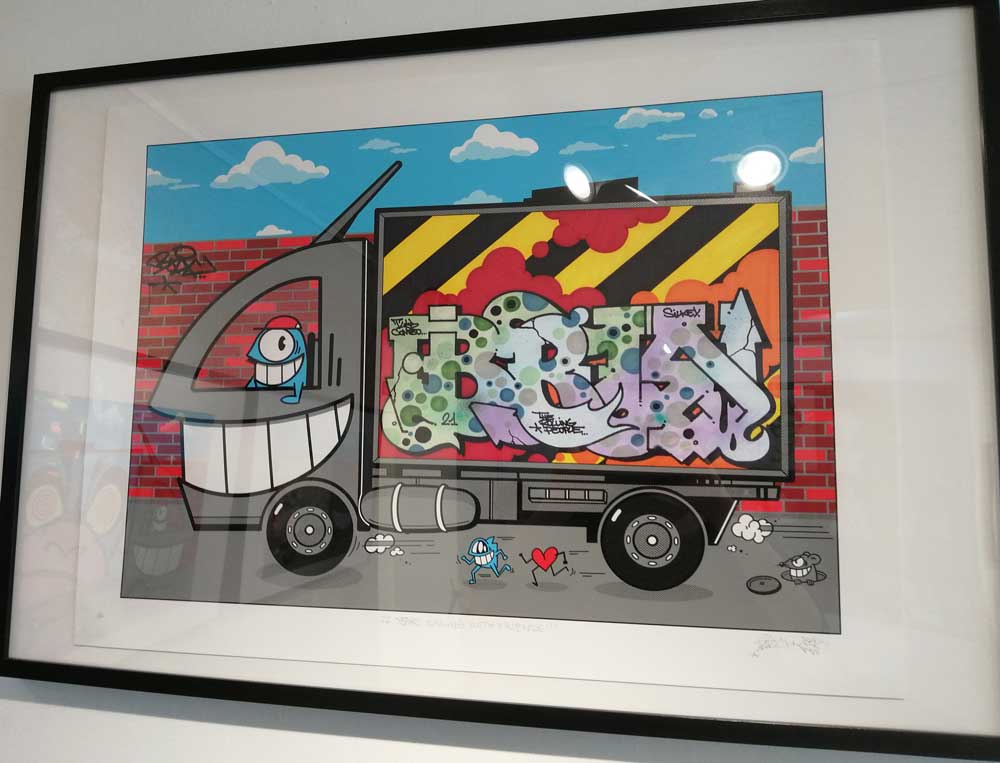 We passed a Pez on the way to the show, pretty hard not to pass a Pez on the streets of London, there’s been a lot of smiling out there, they’ve been documented often enough of these fractured pages over the years. “StolenSpace is excited to present the new summer group exhibition” so trumpets the East London gallery that you still find at the very top of Brick Lane and just around the corner from the stale smells of the tired old Whitechapel Gallery. “22 Years Smiling with Friends” – the show is billed as a group show and features the work of street art stars such as D*face, Buff Monster, Okuda , FlyingFortress, Cranio, Jauneart , Martin Whatson, PichiAvo, Chanoir, Chicadania, Annahita Hessami, Fark, Fanakapan, Mr Cenz, Mau Mau, Mighty Mo, Otto Schade, Ponk, Eject, Ronzo, Cheeba, Jaykaes, Discreet, Malarky, BRK18 – familiar names, instantly recognisable but really this is a Pez solo show – Pez and friends, smiling together but this is very much a solo show. And it is about smiling – “Pez is now celebrating his 22 years of painting on the streets, sharing it with his street artist friends. This show will feature collaborations on canvas, prints and sculptures”. A new Pez piece encountered on the street does demand a smile, that distinctive smile-style does demand you do indeed grin back, yeah, okay, so you could point at the one trick pony street artist thing once again, – get yourself one strong graphic idea, repeated it again and again (and again) on every street corner, have a show in a slick urban art gallery, bring out the coffee table book, but that would be a very cynical way of smiling, and anyway, isn’t the art of repetition a rather fine one? High end brightly coloured pop art? Repeat after me, what’s wrong with that?