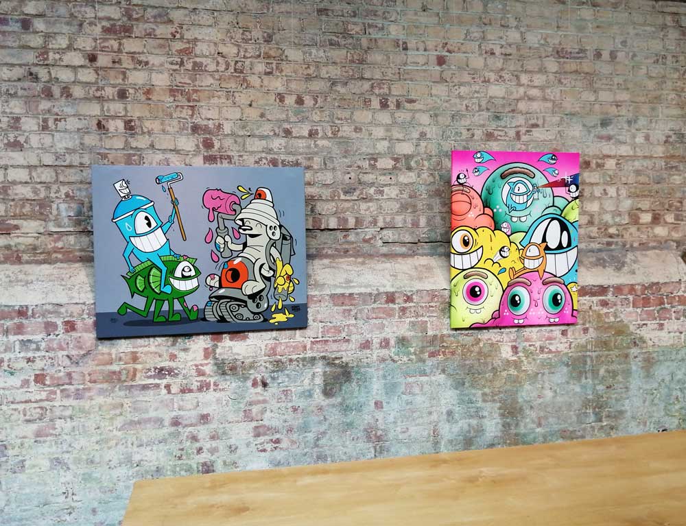An art gallery show then, a slick one, a collection of collaborations, familiar motives, a mash up of familiar street art trademarks, characters, and surely everyone loves pop art? It feels good in here, slick can be occasionally be a good thing, StolenSpace never dress it up as anything more than the reality of it all, if nothing else they’re a very honest gallery and this ain’t no cynical smile on my part. I like Pez, I’ll admit I secretly like what they do in this space and as there often is, there’s everything to like in here and really very very little to be cynical about. A piece of Pez is a cool thing, you don’t need us to tell you that, this is a happy show, an uplifting show, a positive show, some great collaborations in the back room, not going to pick out a favourite, make your own mind up, I like them all, there’s some I personally like more than others but you don’t need to know. This is pop art brightness, street art slickness, lots of smiling with friends, some of it maybe just a tiny bit too slick for my personal tastes, some of it maybe just a little too cartoony and maybe taking the safe option when it might have dared to be a little more dangerous, but hey, when it comes down to it, really what is there not to like about a Pez smile or a Pez show? It feels good in Srolen Sapce, it makes you smile. (sw)
