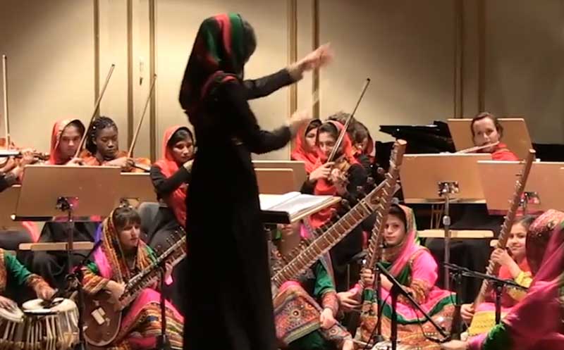 Zarifa Adiba, conductor. The Afghan Women’s Orchestra “Zohra” performs at the Tonhalle in Zurich, Switzerland along with students from the Orchestre du College de Geneve. Sakina is arranged by Allegra Boggess.