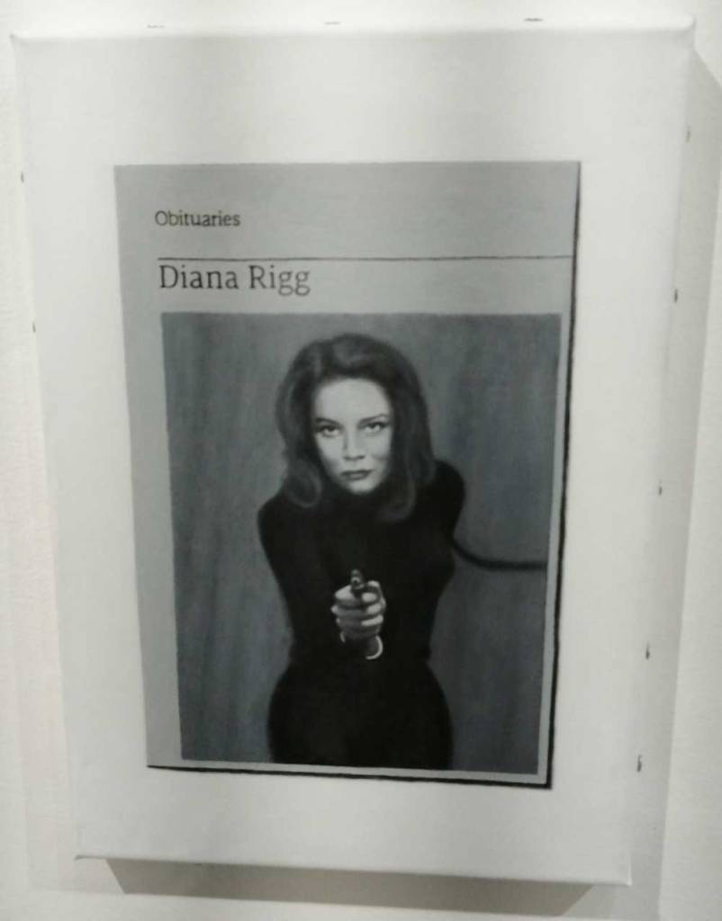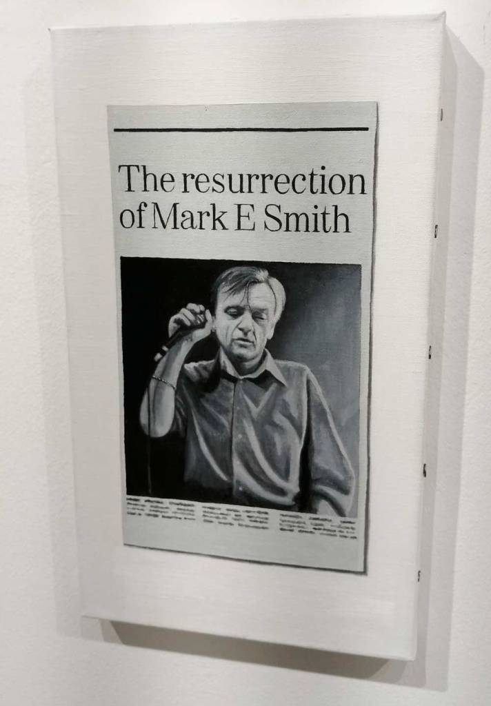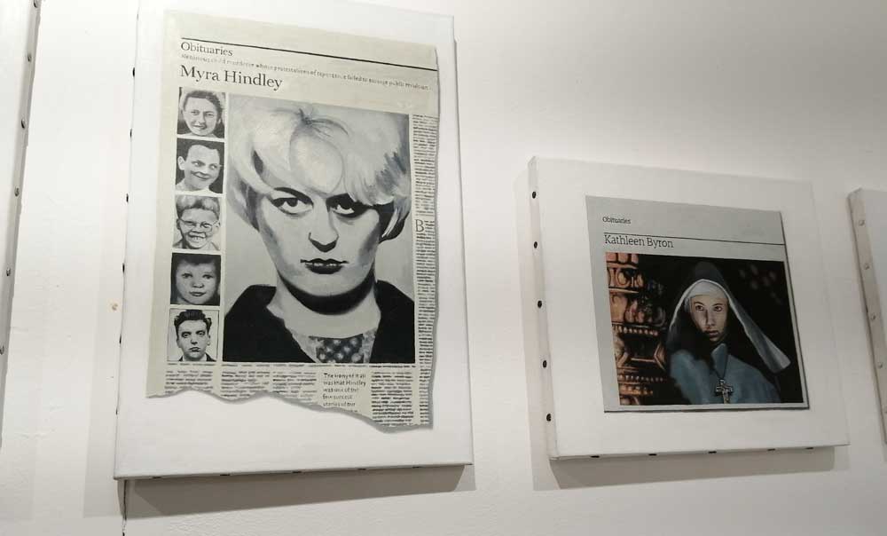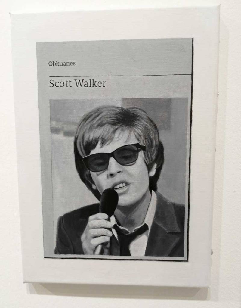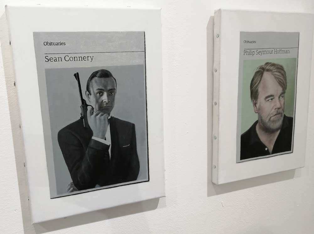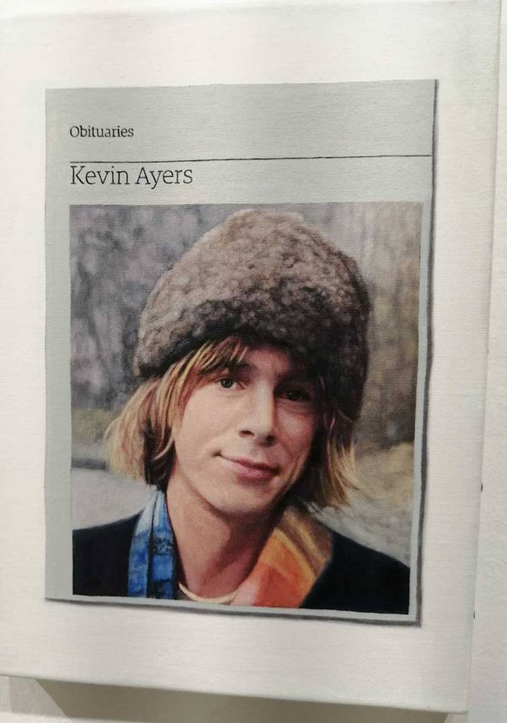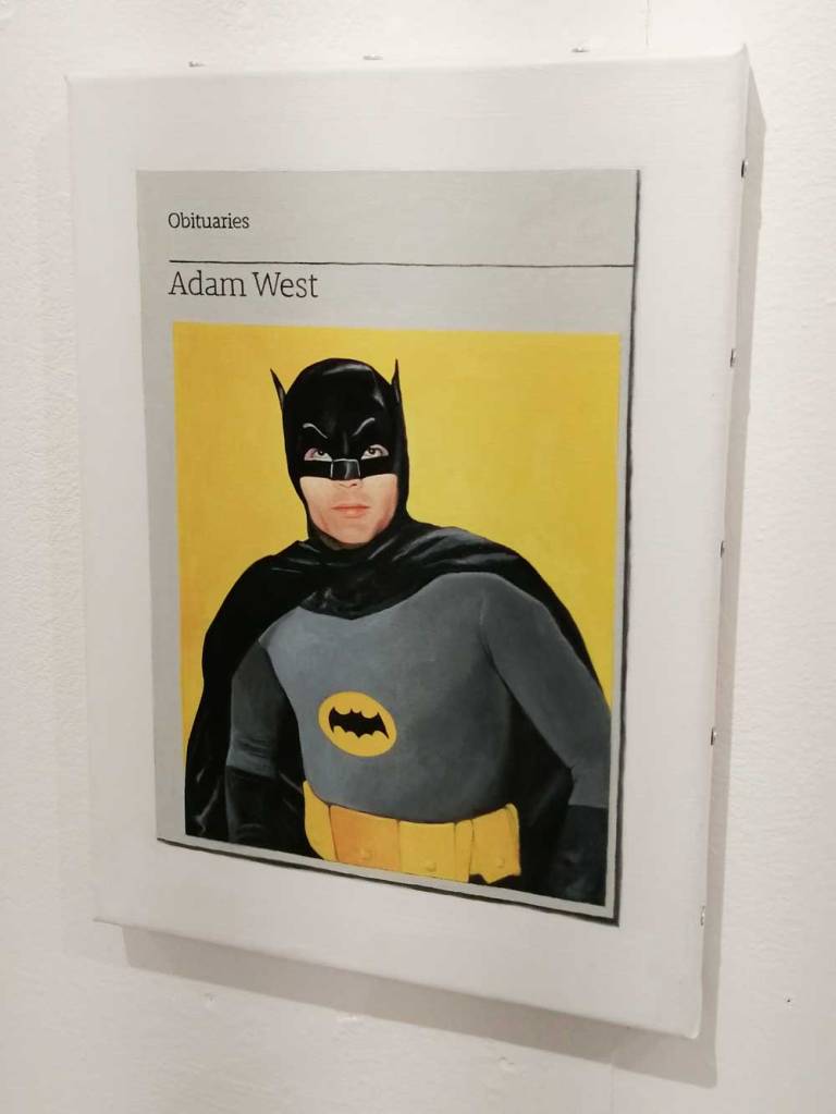 Okay, it might be a little strange to stand there on a sunny September Evening (twenty years on from 9/11), cold beer in hand, politely chatting with the person standing next to you (over hearing conversation of conspiracy theories), looking at the faces of some rather evil people alongside some rather beautiful people. Actually are there any beautiful people? Are these the flawed? And there’s the Moors Murder again, that almost pop art 60’s looking face and did Adam West really want his obituary to be him masked as Batman? Of course there are heroes, or at least people admired, flawed genius? There’s Muhammad Ali, Francis Bacon, there’s Kevin Ayres, (pretty sure I saw Lemmy Kilminster in Hugh Mendes’ studio a couple of years back?). These are people who fascinate, some who on the surface at least might be seen as somewhat vile, are there any beautiful people in this show? Is anyone actually that beautiful? And that is the thing, all these questions flit around your mind as you stand there in the gallery in the sunshine looking at all these lives and all these bad things that have happened – that’s the other thing, was there anything good in the last twenty years that Mendes has considered painting? And then as you’re standing there considering a second cold beer and would it be rude, you’re thinking about what is going on with the artist that actually makes him spend twenty years of his life painting all this, I mean some of us just paint flowers for twenty years.