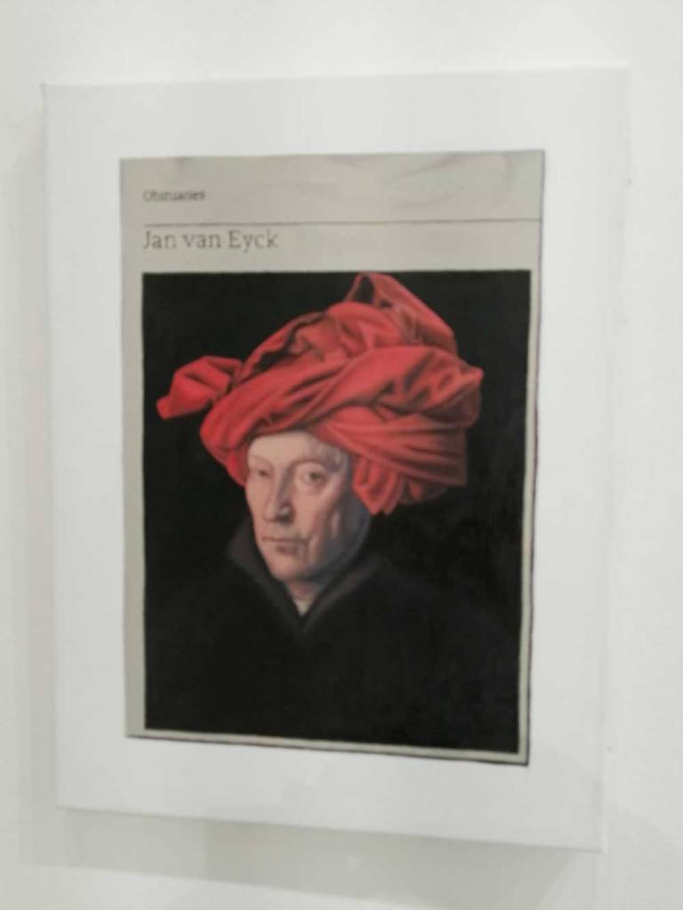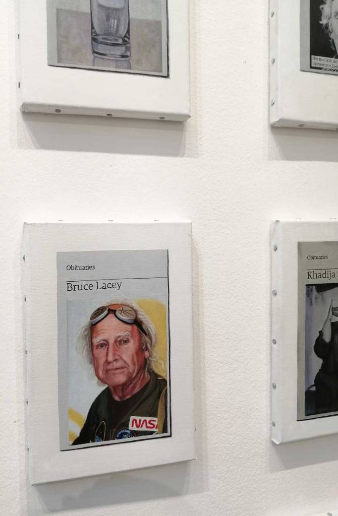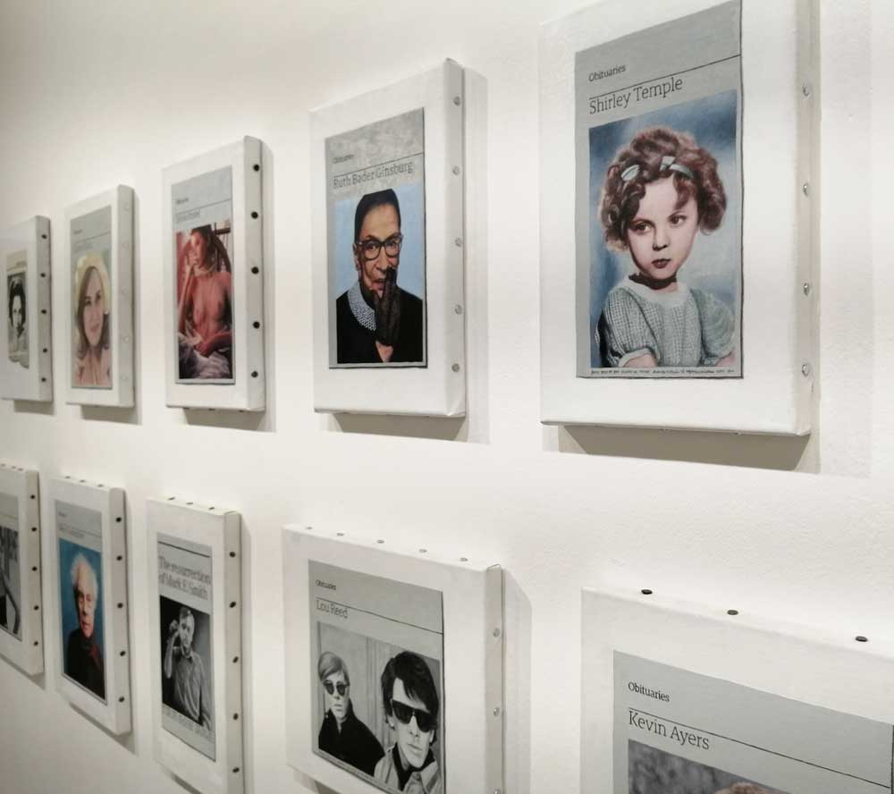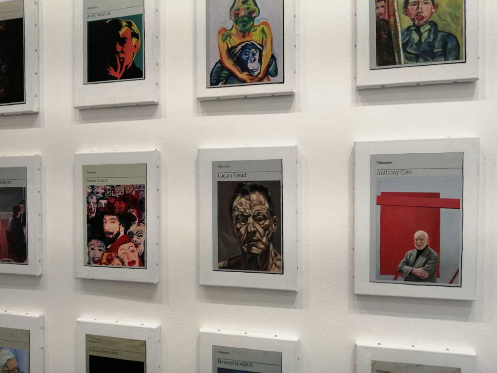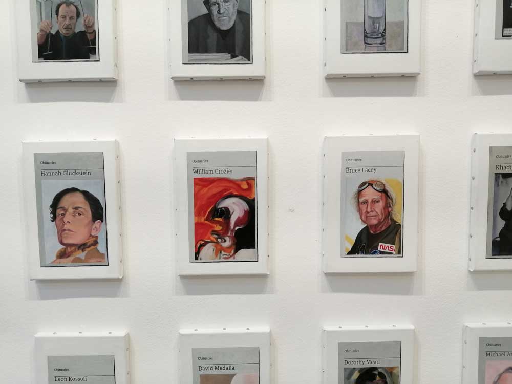 “During the last 20 years my work has continued to follow political global events, while increasingly focusing on obituaries, and especially those of artists. They epitomise a particular way of recording history, through the lives of individuals. But all referencing the world as viewed through newsprint, and subsequently through the painted image. This has led me to reflect on history through the lives of artists, and to meditate on the role of the artist in society. This necessarily includes my own role as an artist and my place in a long and glorious lineage. My artist obituary paintings have included many of my teachers, as well as mentors. The most recent development has been using and remaking the self-portraits of many of these artists as invented obituaries in a newspaper format—as if Rembrandt had an obituary in ‘The Guardian’ newspaper. It has been a particularly fascinating process to consider the styles and techniques of so many artists, as well as reconsidering how they viewed themselves. 10 years ago, I made a work on paper, where I wrote out in pencil all 3,000 names of the people who died on 9/11. This piece is now part of the Sammlung Annette und Peter Nobel in Zurich. Writing out the names took six weeks at about 6 hours per day, every day, and 75 names per day—it was perhaps the most meditative piece of work I have made”.