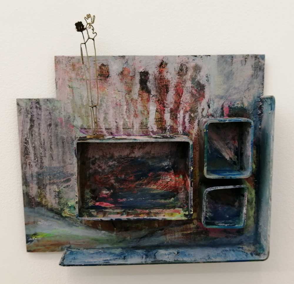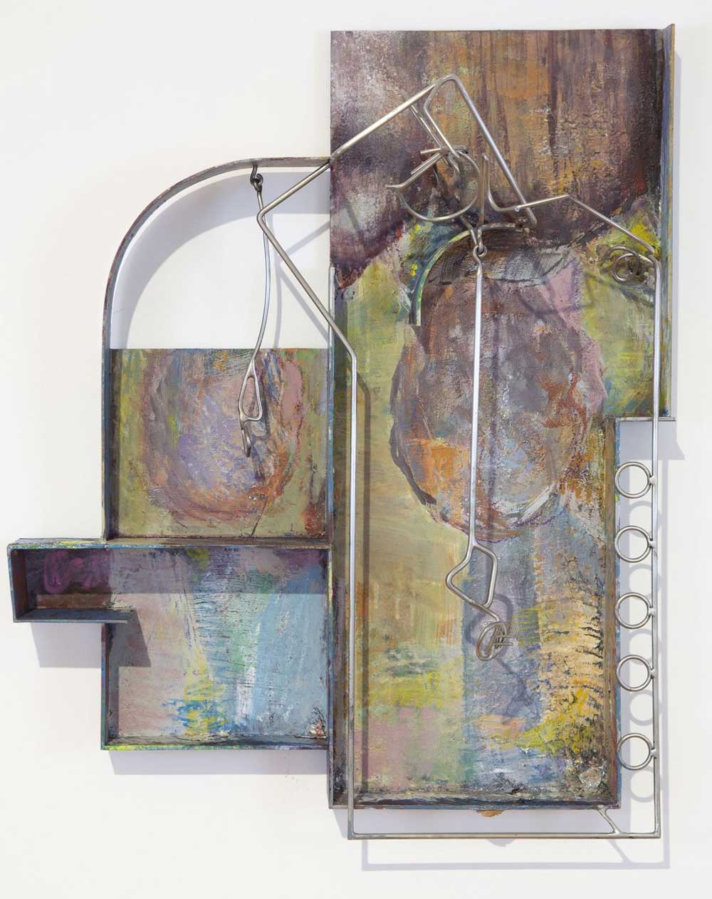 “Originally commissioned for her solo exhibition at Cample Line in Scotland, 2020, Barker’s sculptures were made during lockdown. Using the limited materials and space around her, and without access to a professional fabricator, Barker has been getting intimate with production. Working from home, moving between her kitchen, garage and attic, she has hand-crafted her series of domestically sized wall-mounted reliefs. Incorporating painted and moulded brass, steel and aluminium as well as everyday materials such as wood, cardboard and wire, Barker conjures little worlds, abstract scenes constituted from linear shapes drawn in metal. To quote Susanna Beaumont: “Barker’s reliefs are akin to pages from a diary, sketches sketched, a draft of a composition, a quickly written musical score. [In these new works] is a kind of unearthing, a reveal. A series of archaeological sites filled with the physical, the familiar and the unidentifiable, the less pin-down-able shaky dream, the half-recalled and the fast-dissolving memory. Earthy yet brittle, [hems] gives evidence of time spent, time stretched, time corrupted, ordered and disordered.”