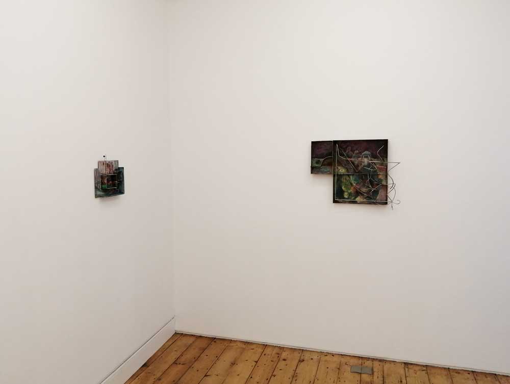 Sara Barker is in the small annexe space with a show called [hems], it is her work that has attracted us to the gallery tonight – “For [hems], Glasgow-based artist Sara Barker is showing a series of new sculptures. The title takes its inspiration from the humble edge that borders a skirt, handkerchief, or sleeve; a neat and folded trim, tucking away the messy tangles of loose thread and fabric underneath. In relation to Barker’s sculptures, the hem evokes figurative associations, making connections to the things which contain and hold the body. The hem also draws attention to the physical – as well as metaphorical – edges and borders of things: both the works themselves and the exhibition as a whole are in a capsulated form. Though smaller than much of her previous work, the pieces in this new series retain Barker’s distinctive artistic language where she blurs the thresholds between sculpture, painting and drawing. Employing these disciplines and their associated materials and techniques, Barker’s sculptures create both physical and metaphysical space, sometimes expansive, and at others, claustrophobic”.