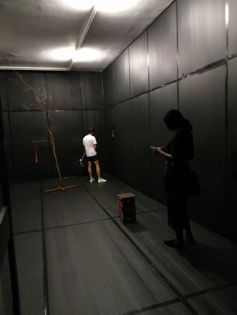 It is initially exciting, thrilling maybe? And then you let that initial “wow” drain away and start to wonder why, without at this point reading anything like a gallery statement or any on the show information, you wonder around the blackness of the gallery dropping down to see what that is almost at floor level on the wall in the corner? And then, after, I don’t know, what seems like fifteen minutes of not looking at much, it probably wasn’t that long really, you quietly leave and think well that was interesting, but was it really that exciting? Was it ever meant to be? Did it actually back up the words you’ve now read? Was it any more than just a challenge to what a gallery space should be? And as interesting or exciting it was to be in there, was it really anything more than that? Was it just an initial rush? Am I actually they bothered either way? I mean I liked being in a gallery that was head to foot in black cardboardy plasticy stuff, I did like walking on it, I know a Goth or two who would think it to be some kind of heaven, but was it anything more than just an experience? (sw)