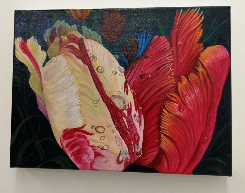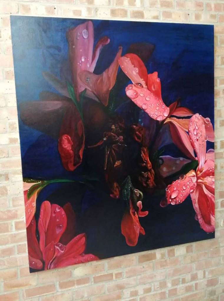 The artist’s mischievous choice of title for the exhibition really wasn’t needed, it was all there in the paintings. “In Season is at once a reference to the cyclical nature of flowering plants and the successful growing periods for crops and yet is alsosynonymous with the period when a female (mammal usually) indicates it is ready to mate” so reads the gallery press release