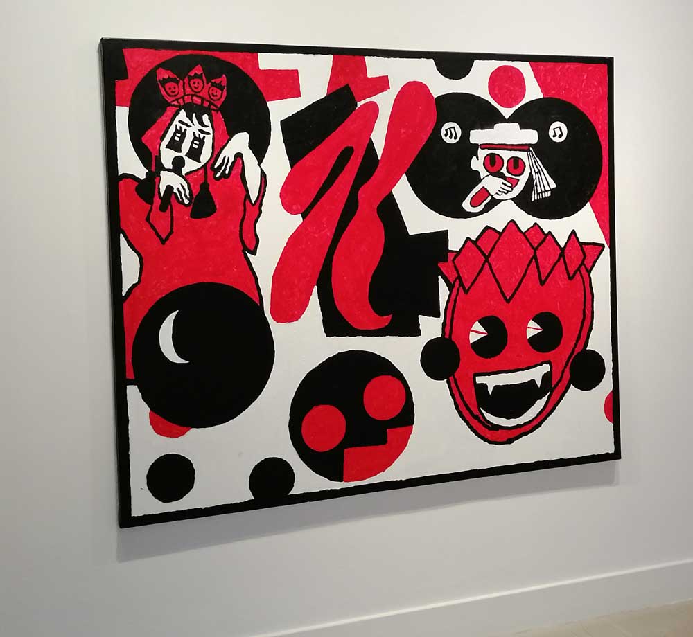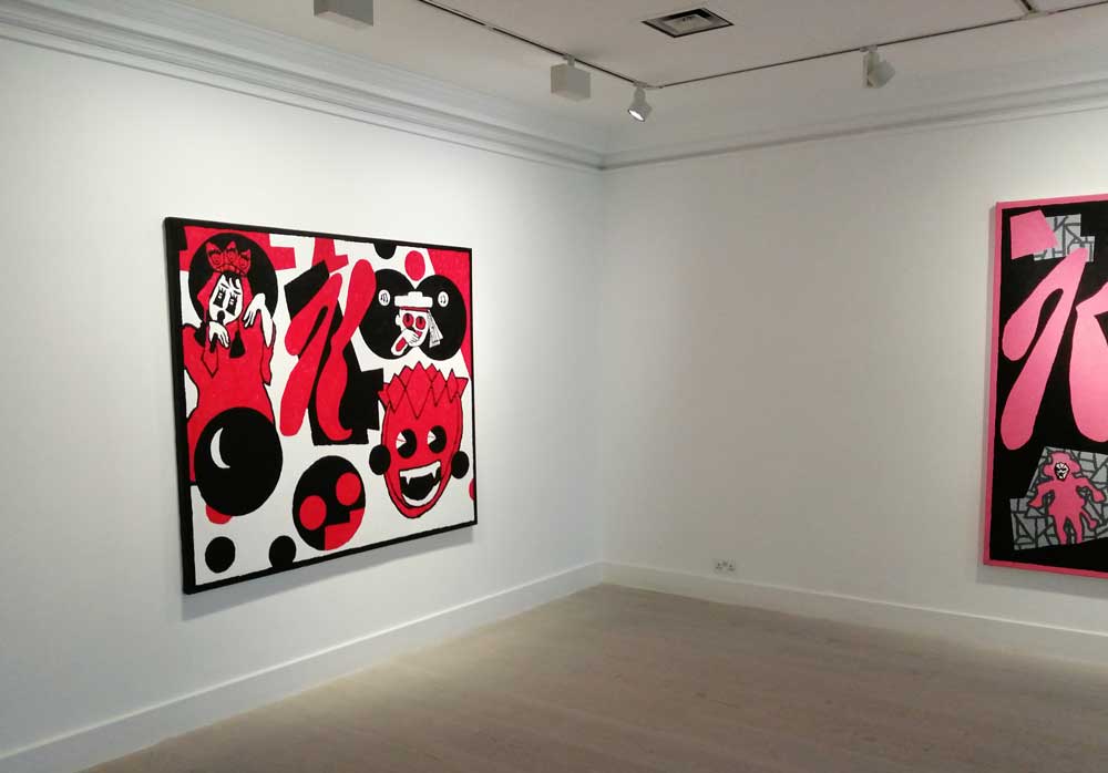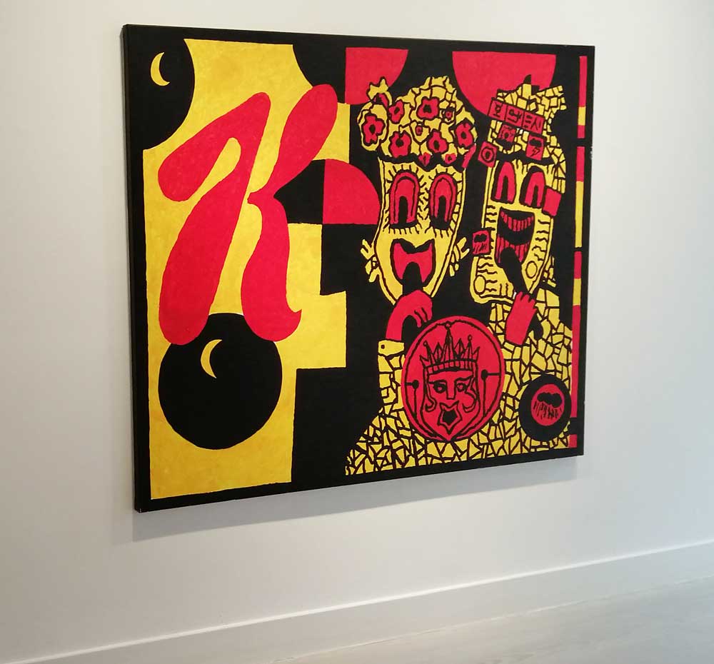 “Blending Greek mythology with South Korean mainstream entertainment, Icarus and K Pop features two series made of vibrant acrylic paintings on canvas as well as black and white drawings on paper. Continuing the artist’s exploration into the function of images, the show orchestrates an unlikely conversation between consumerist imagery, cartoon-like motifs, and pencil renditions of 19th – century paintings including William Blake’s The Ghost of a Flea and Eugène Delacroix’s Liberty Leading the People. The exhibition offers a critical and playful commentary on global contemporary culture…”