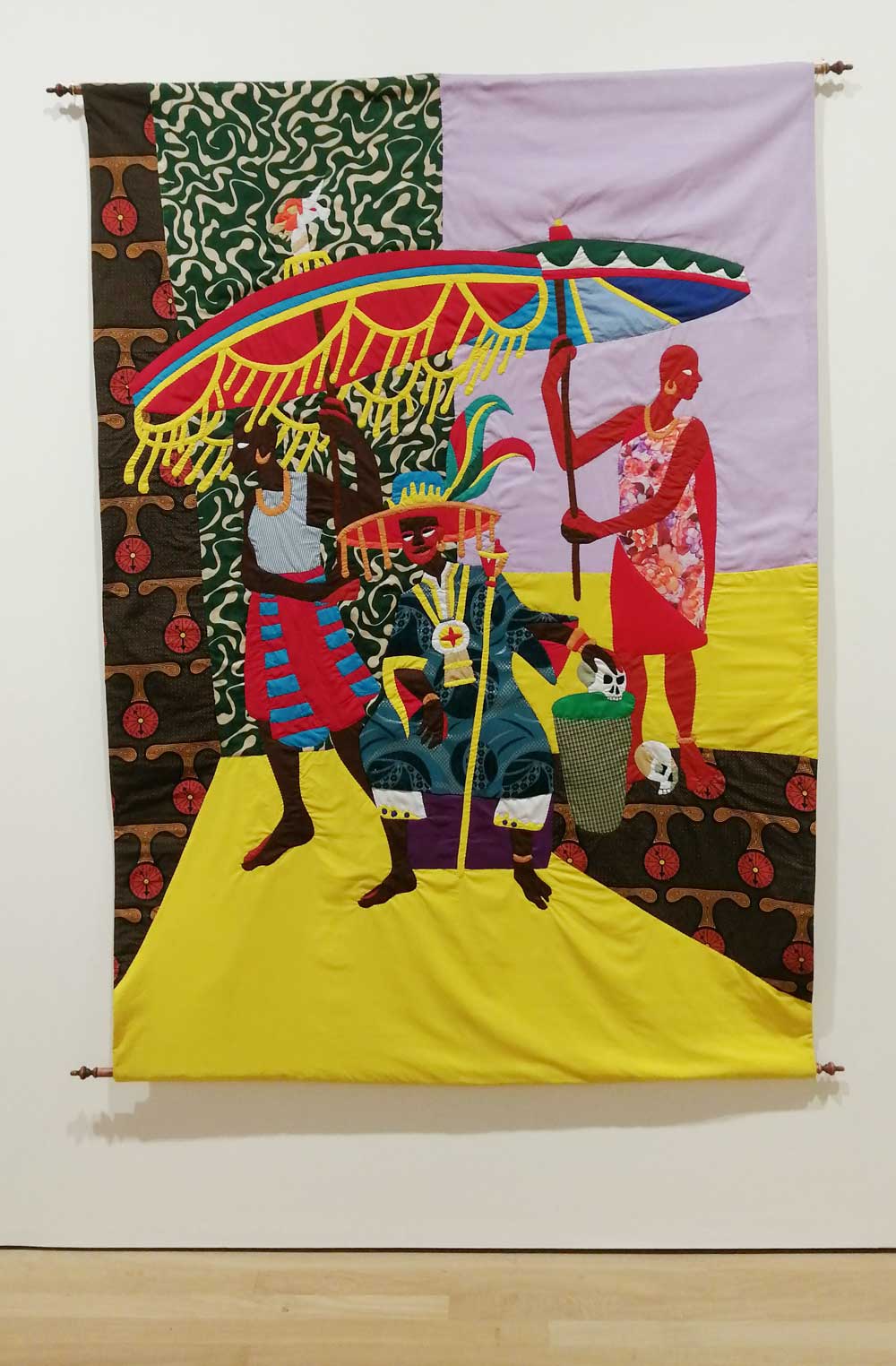 We arrive a fashionable ten minutes after the time stated, there’s already quite a healthy invited crowd in at ten past nine, this is not a natural hour for an artist like me to be up and about and this is not a natural place for a mouthy East London based painter like me to be. New York-based gallery James Cohan have taken on the ground floor to present ‘I Dare Not Appear,’ a solo exhibition of new work by Christopher Myers. I know little of the Brooklyn-based Myers, his work is immediately striking, bright, bold, demanding, ambitious textile-based wall pieces, big hangings, not quite tapestries but in that style…