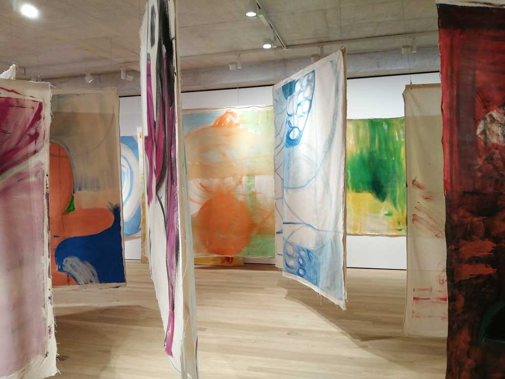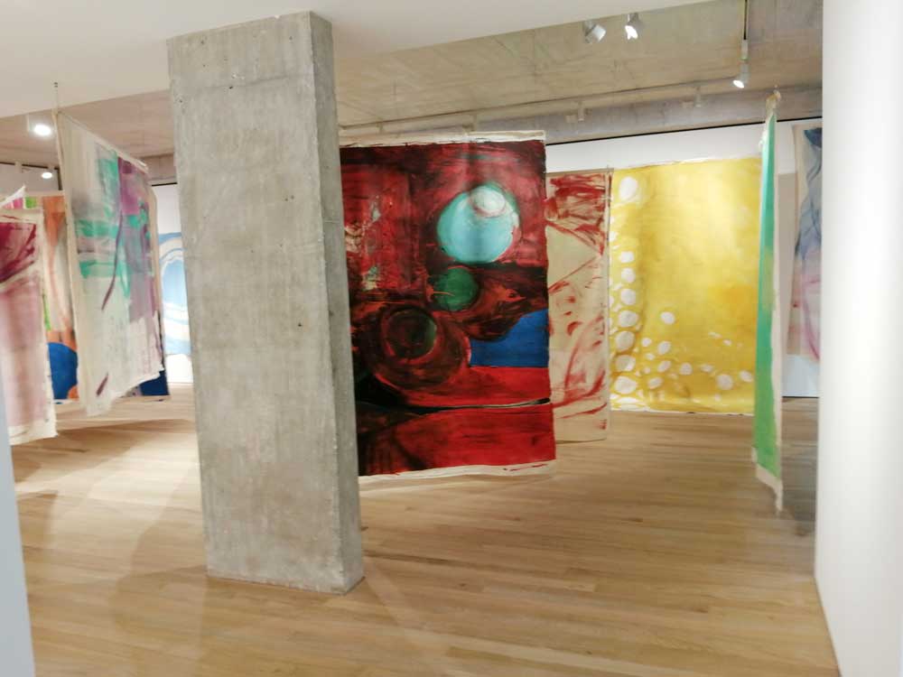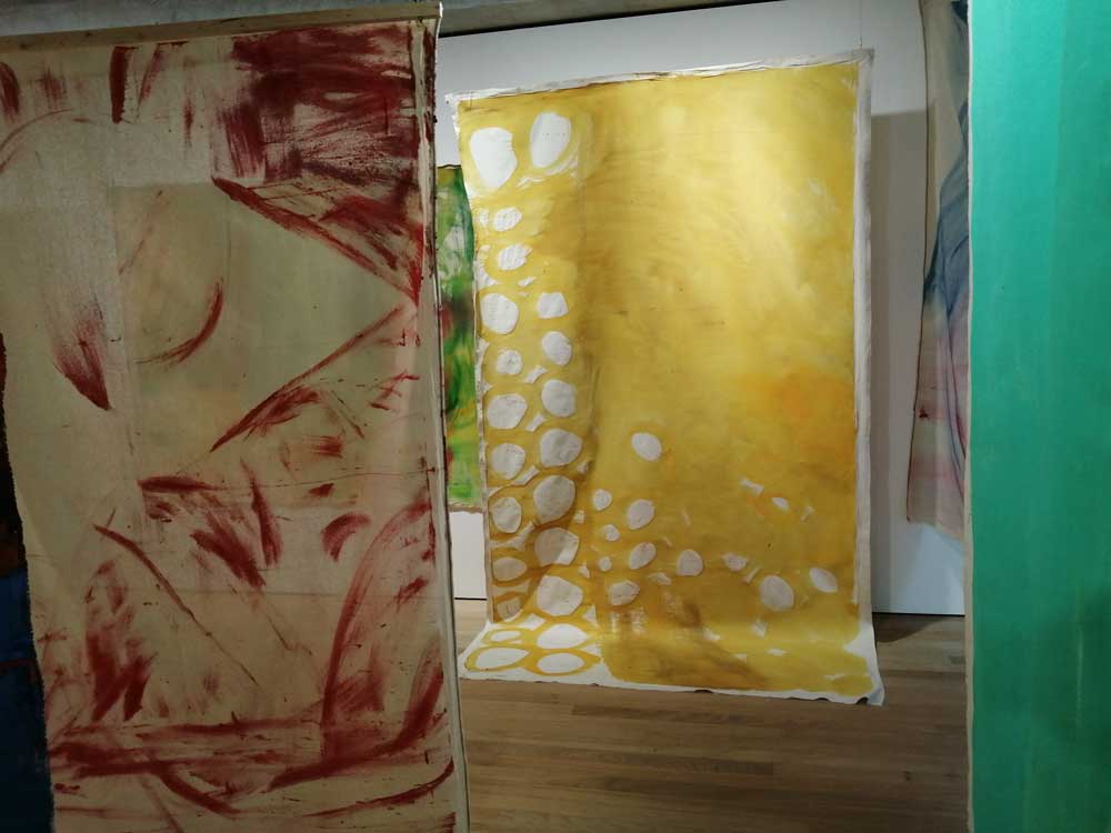 Elisabeth Wild and Vivian Suter once again immediately excite, presented by Guatemala’s Proyectos Ultravioleta Gallery (who currently have an Amalia Pica – as seen at East London’s Herald Street recently – solo show on at their own gallery). The mother and daughter team once again, as Christopher Myers did down tairs, make an instant impact, it is a wow moment when you first see it, a beautifully hung set of paintings, an installation almost, hung like textiles, more textile art (are you watching Fanham art school?). On closer examination they are unstretched canvases hung like fabric, the hang is exciting, like they’re drying in the sun, it demands you walk through it, like washing on a line, you want to get lost in the layers (you so want to touch them). We’re told the artists are from the Guatemalan highlands, the outskirts of Panajachel, I’m no expect here, I rarely get further than Bethnal Green tese days. Suter, who we learn is 70, is responsible for framed collage on the walls, the big hanging pieces that delight so so much, are the work of her mother, 97 year old Vivian Suter, once again I admit to knowing little of either artist