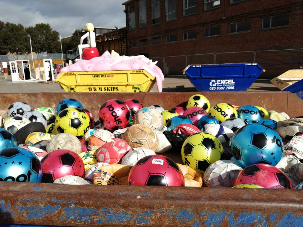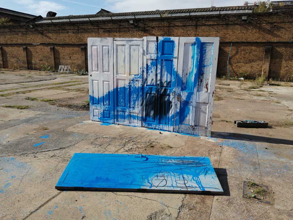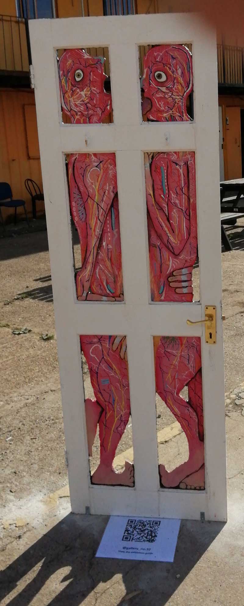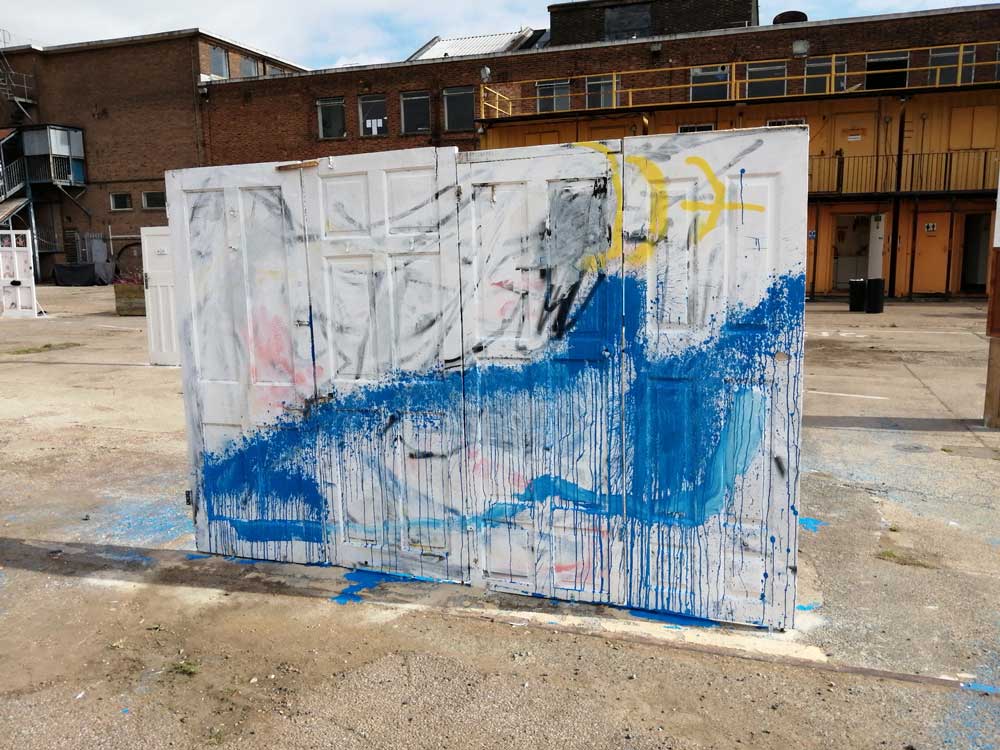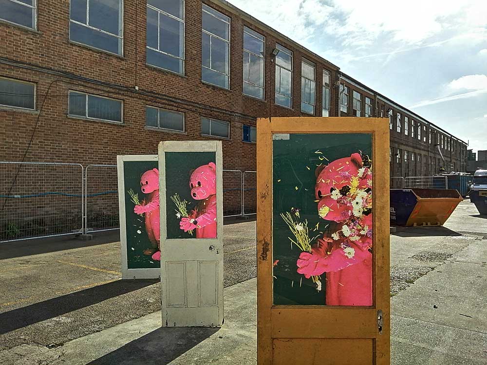 The Factory Project is essentially a three-headed beast, part one and two feel a tiny little bit underwhelming, an empty office area that has one or two interesting pieces and a space that doesn’t feel like it has had the attention it deserves, a little haphazard and bits scapptered here and there without using the lines of the building, one or two interesting pieces, couple of great paintings we can’t put a name to, is it that hard to put a label next to a piece of work? There’s not even a bloody QR code with that one there! The space feels like it needs more, those walls surely invite much more, as good as some of the art is, it all lack harmony, it feels disjointed is, the art feels a little lost. Similarly the big big yard feels a little scattered although some of those Skip Gallery pieces (that we might have seem before) look good in the open air – Dion Kitson’s skip full of old footballs glows in watery late morning Autumn sun (now we know why he’ been asking everyone for footballs for the last couple of months), and there’s That Pink Bear again on two or three doors – there’s lots of doors, is that skip full of rubbish part of it or just a skip full of rubbish? I;d have painted on he rubbish throughout the week. There’s a body in the skip over there, and I do detest QR codes, do we have to have our phones involved every damn time? Can’t you just put an artist’s name by a piece, just a name on a piece of paper for those of us don’t want to spend half the time at a show looking at our damn phones rather than the art? It does rather assume everyone has or wants a phone (or indeed has the eyesight to deal with it all). Put a bloody name on the art! The yard is a little disjointed, the art feels a little lost. it is fun out here, playful, but one again it feels like it could have been so much more, the event doesn’t really come to life until the warehouse is discovered..