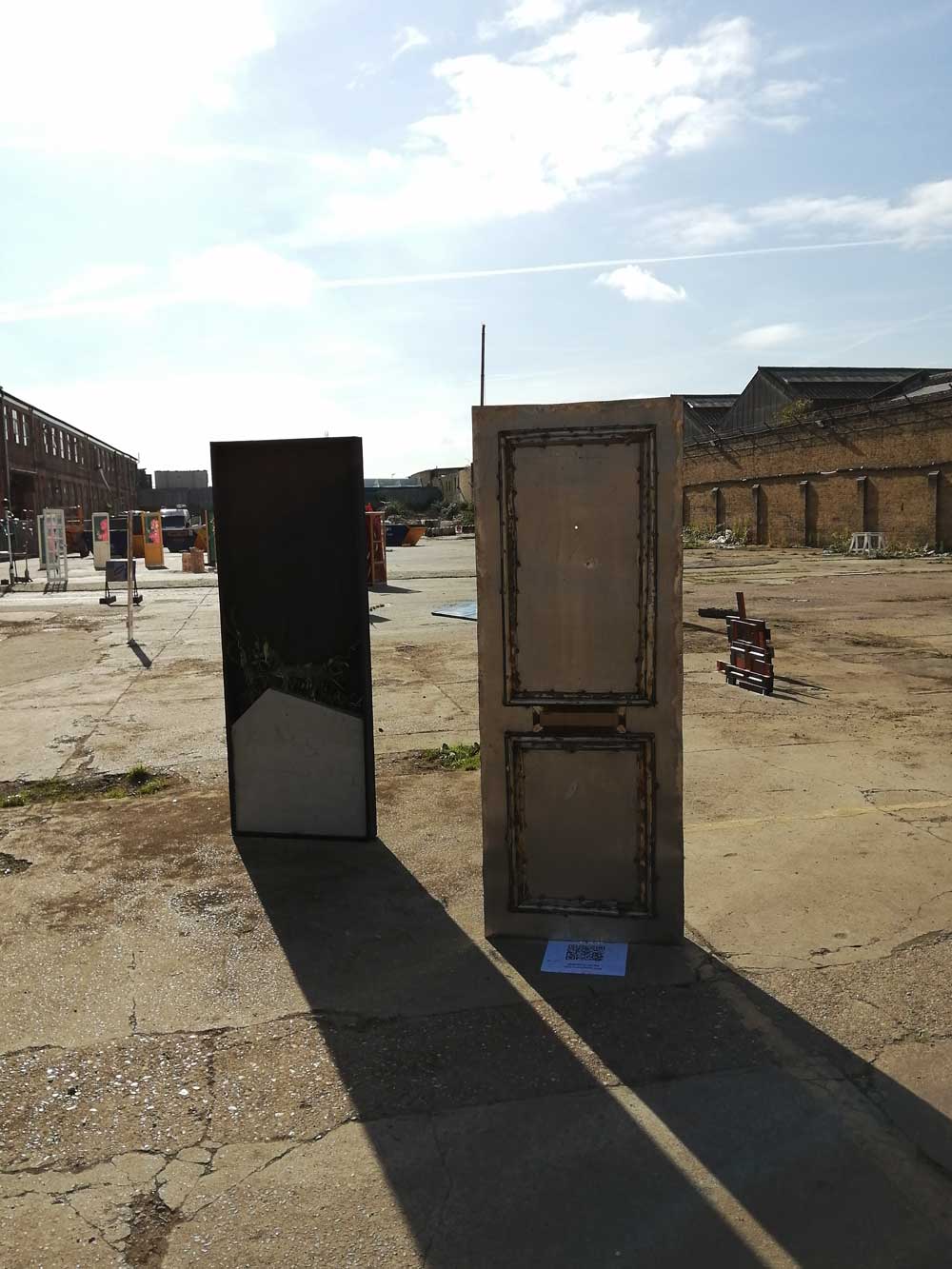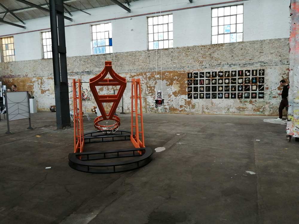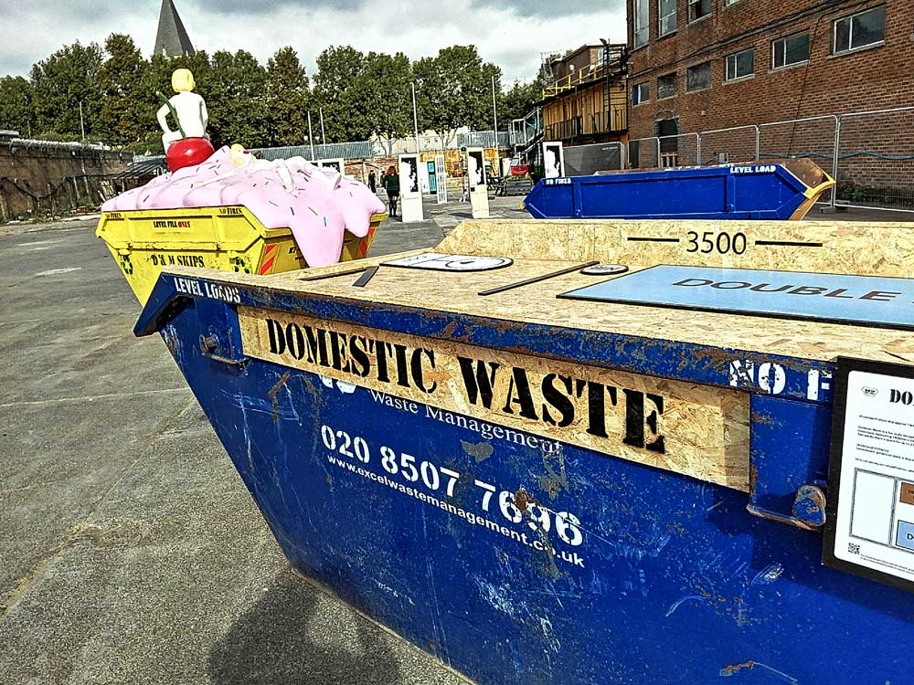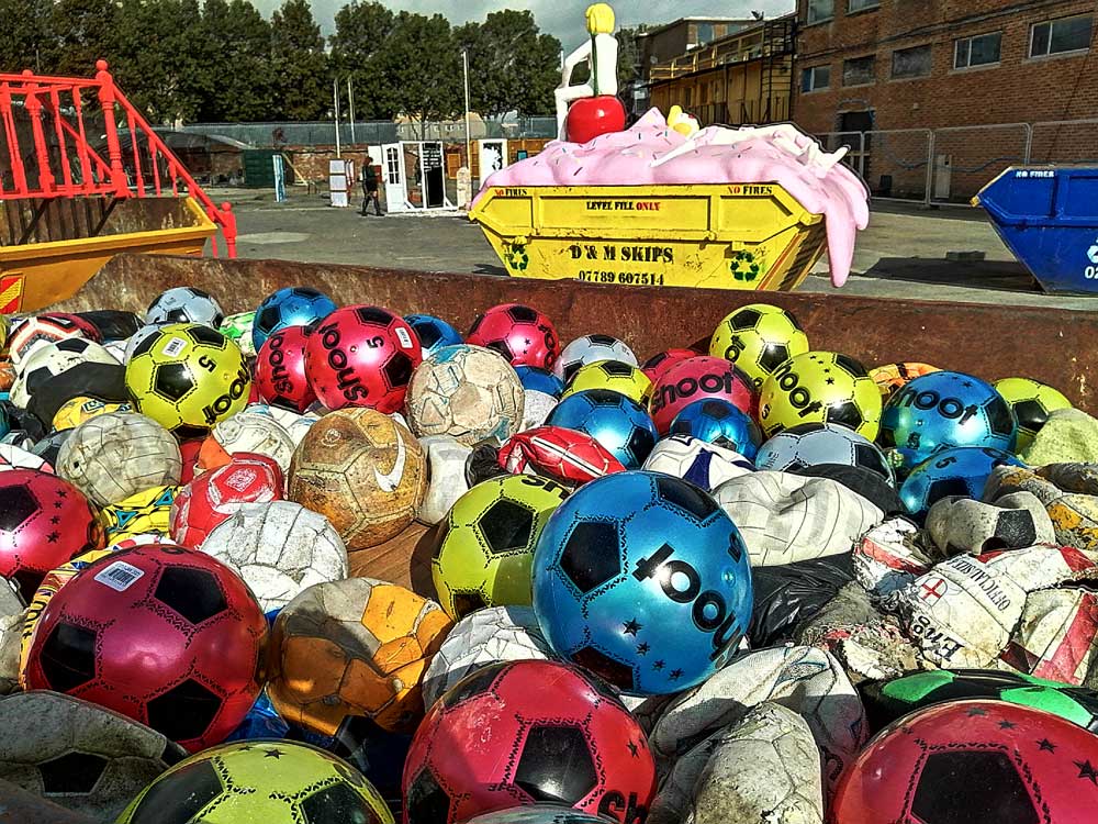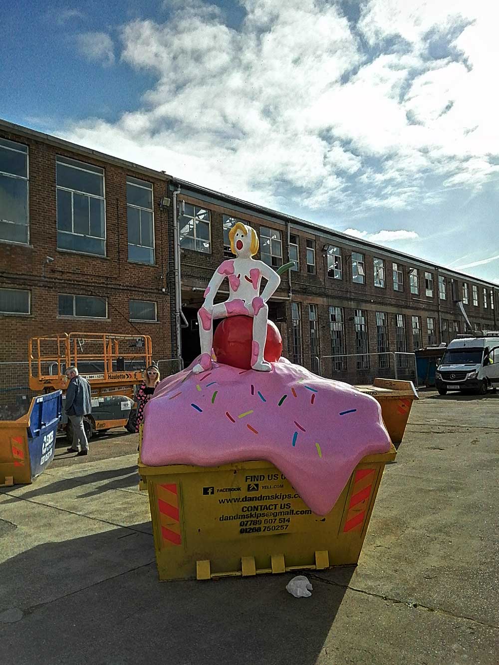 The Factory Project is essentially a three-headed beast, part one and two feel a tiny little bit underwhelming, an empty office area that has one or two interesting pieces and a space that doesn’t feel like it has had the attention it deserves, a little haphazard and bits scapptered here and there without using the lines of the building, one or two interesting pieces, couple of great paintings we can’t put a name to, is it that hard to put a label next to a piece of work? There’s not even a bloody QR code with that one there! The space feels like it needs more, those walls surely invite much more, as good as some of the art is, it all lack harmony, it feels disjointed is, the art feels a little lost. Similarly the big big yard feels a little scattered although some of those Skip Gallery pieces (that we might have seem before) look good in the open air – Dion Kitson’s skip full of old footballs glows in watery late morning Autumn sun (now we know why he’ been asking everyone for footballs for the last couple of months), and there’s That Pink Bear again on two or three doors – there’s lots of doors, is that skip full of rubbish part of it or just a skip full of rubbish? I;d have painted on he rubbish throughout the week. There’s a body in the skip over there, and I do detest QR codes, do we have to have our phones involved every damn time? Can’t you just put an artist’s name by a piece, just a name on a piece of paper for those of us don’t want to spend half the time at a show looking at our damn phones rather than the art? It does rather assume everyone has or wants a phone (or indeed has the eyesight to deal with it all). Put a bloody name on the art! The yard is a little disjointed, the art feels a little lost. it is fun out here, playful, but one again it feels like it could have been so much more, the event doesn’t really come to life until the warehouse is discovered..