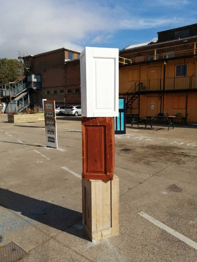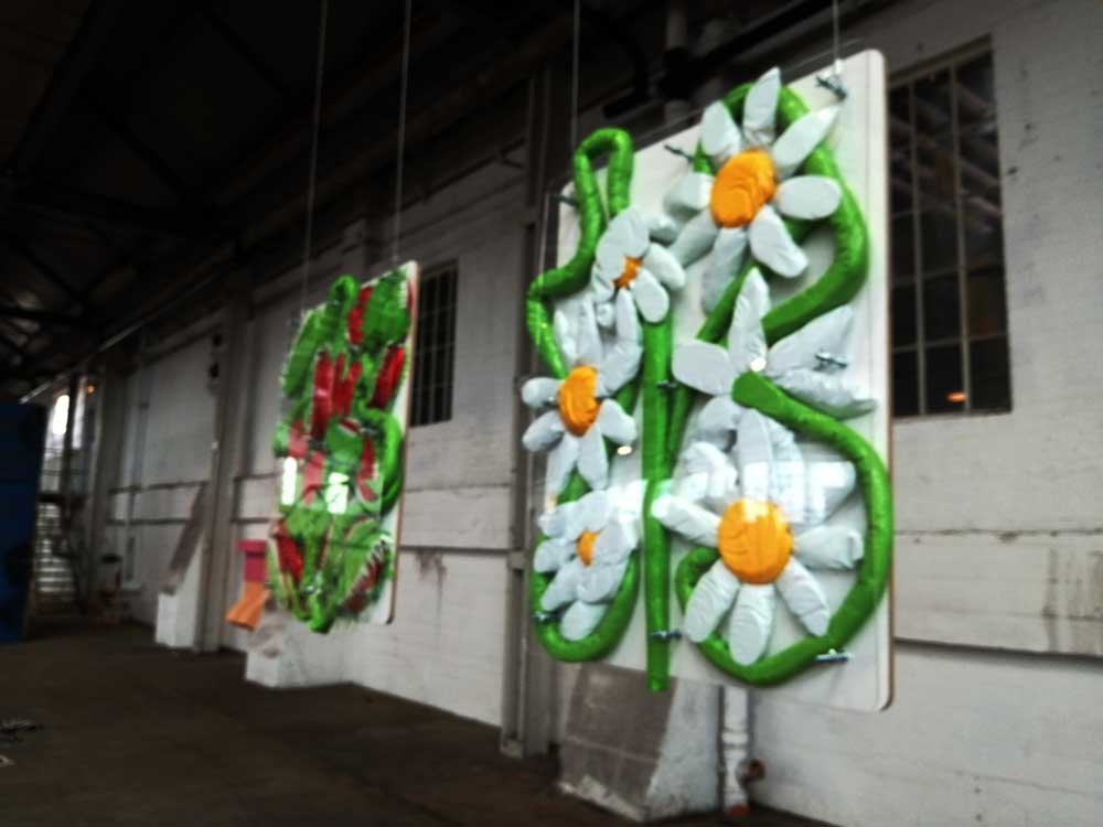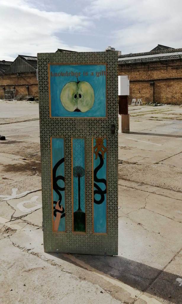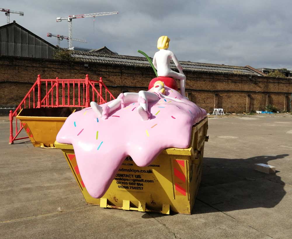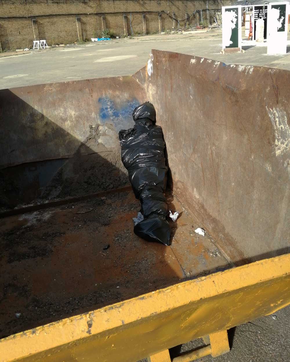 The Factory Project is essentially a three-headed beast, part one and two feel a tiny little bit underwhelming, an empty office area that has one or two interesting pieces and a space that doesn’t feel like it has had the attention it deserves, a little haphazard and bits scapptered here and there without using the lines of the building, one or two interesting pieces, couple of great paintings we can’t put a name to, is it that hard to put a label next to a piece of work? There’s not even a bloody QR code with that one there! The space feels like it needs more, those walls surely invite much more, as good as some of the art is, it all lack harmony, it feels disjointed is, the art feels a little lost. Similarly the big big yard feels a little scattered although some of those Skip Gallery pieces (that we might have seem before) look good in the open air – Dion Kitson’s skip full of old footballs glows in watery late morning Autumn sun (now we know why he’ been asking everyone for footballs for the last couple of months), and there’s That Pink Bear again on two or three doors – there’s lots of doors, is that skip full of rubbish part of it or just a skip full of rubbish? I;d have painted on he rubbish throughout the week. There’s a body in the skip over there, and I do detest QR codes, do we have to have our phones involved every damn time? Can’t you just put an artist’s name by a piece, just a name on a piece of paper for those of us don’t want to spend half the time at a show looking at our damn phones rather than the art? It does rather assume everyone has or wants a phone (or indeed has the eyesight to deal with it all). Put a bloody name on the art! The yard is a little disjointed, the art feels a little lost. it is fun out here, playful, but one again it feels like it could have been so much more, the event doesn’t really come to life until the warehouse is discovered..