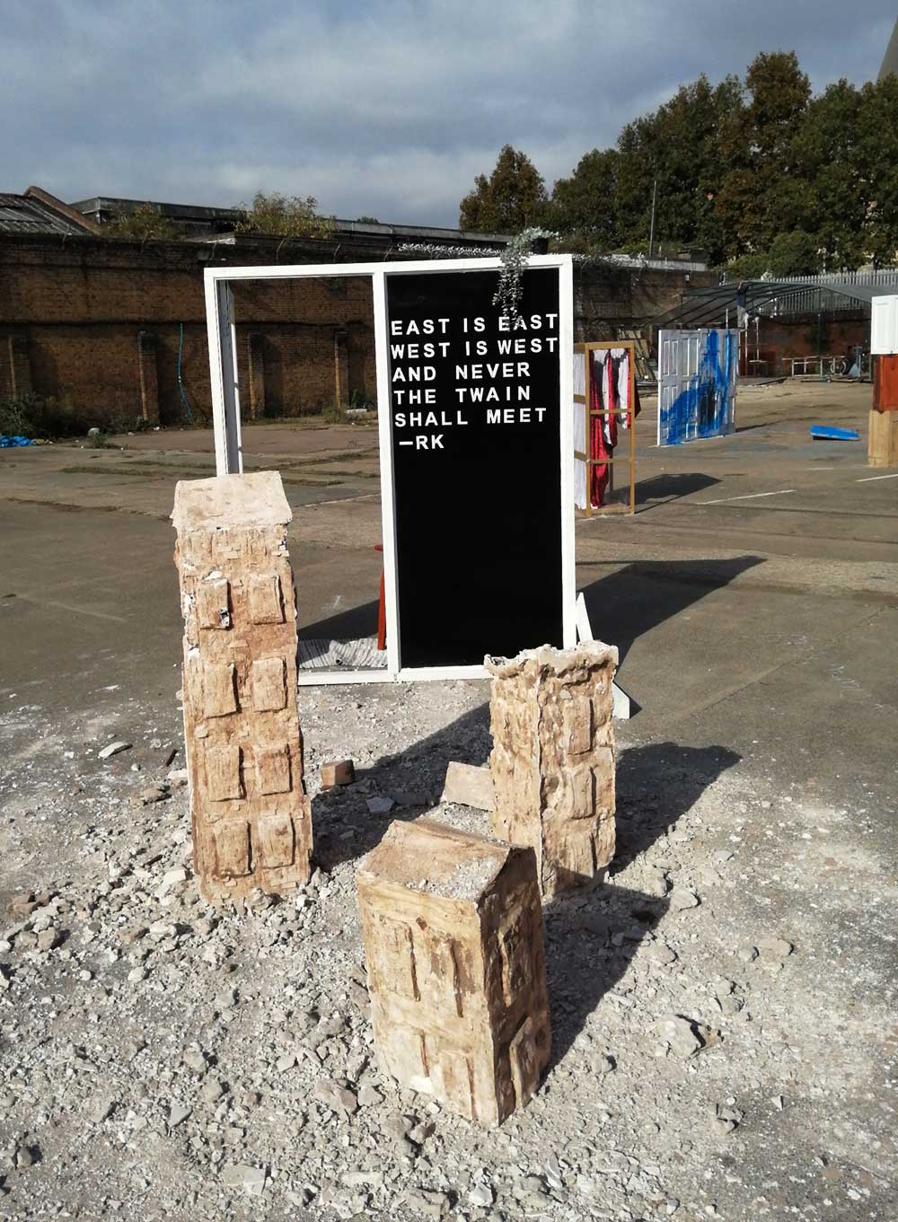 It takes a little finding, Pontoon Dock is the easiest DLR stop, the social media photos from the opening weekend looked enticing, the space is massive, it looks like an old warehouse about to be pulled down, all decayed walls and bits of fallen plaster, a beautiful wasteland. Actually it looks and feels, without blowing our own trumpets too much, a hell of a lot like that Play show we put on in a condemned Hackney warehouse a few years back. Getting tougher and tougher to find these spaces and pull artists together inside them when a space is found these days. It Feels like Play or maybe some of those Frieze Week car park shows that for a couple of years back there threatened to be more than they eventually amounted to.