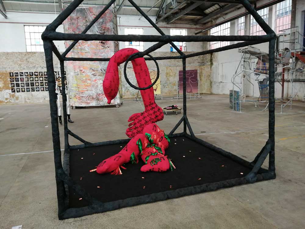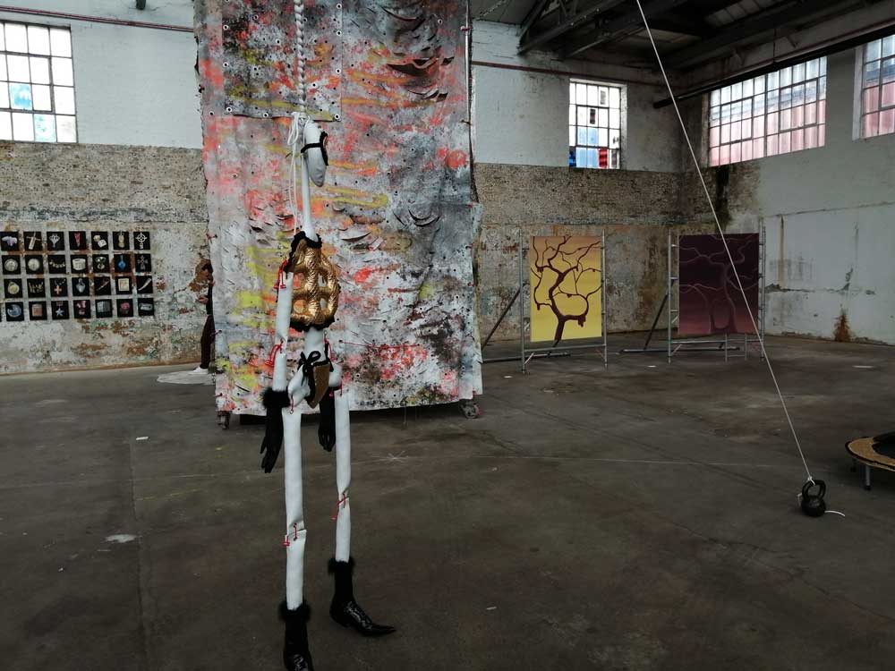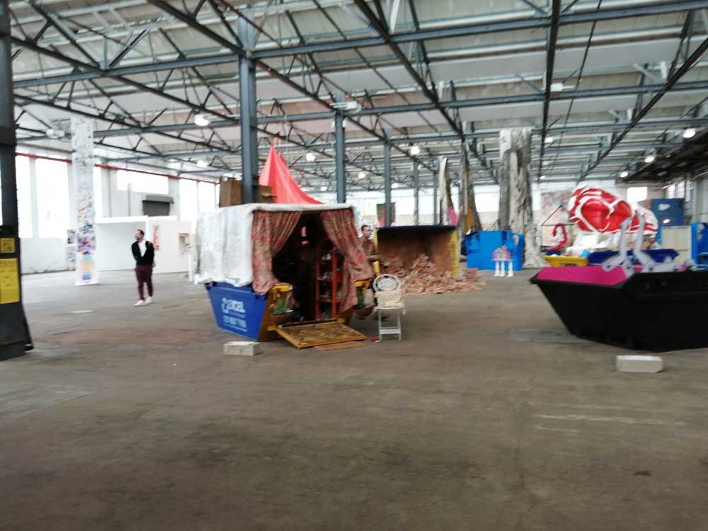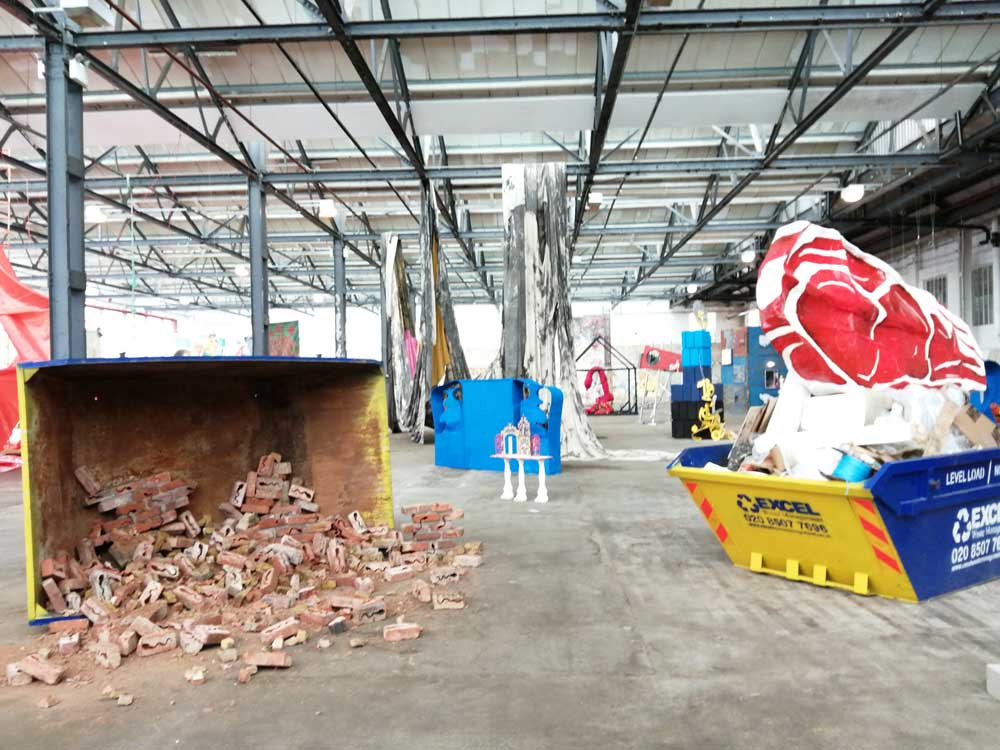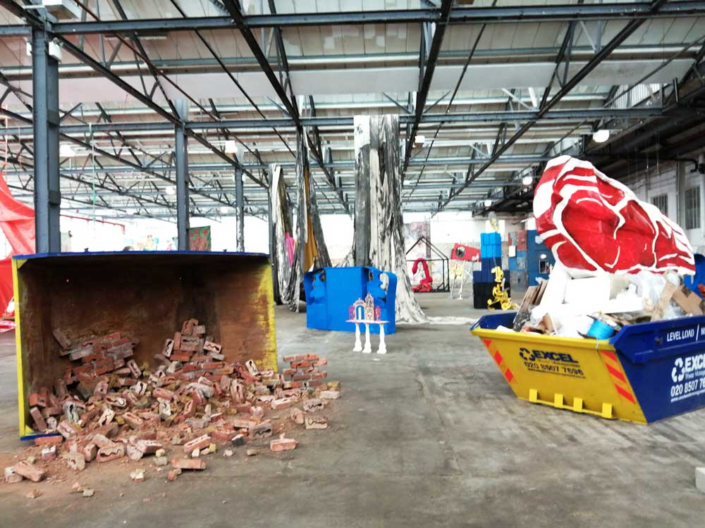 The big warehouse is an immediate rush of excitement, of pieces demanding “me first, come here”. Lucy Gregory is kicking off in her skip, Paul Kingsley’s Ship of Fools, Luke Silva’s 48 Tomb Raider relic paintings up on the wall, actually that is all that’s really missing in this brilliant warehouse bit, more paintings on those beautiful walls (and artists names rather than just bloody QR codes). Delphian are as ambitious as ever and the Juliette Mahieux Bartoli piece hanging from the ceiling is gorgeous. Sarah Maple’s End of The Work sign looks bigger than ever in here – lots of big things here -and it is wrong of me to pick out names, there’s lots of people who deserve a mention – it is genuinely exciting in here, some of it is edgy, some of it maybe a little more polite then it needs to be, it is mostly brilliant, a triumph, a real challenge to what we go on to find at Frieze later in the afternoon. The space in this big warehouse is used well, the conversations between pieces, the sight-lines, everything the first two parts lacked, not that the art was bad in the first two parts but in here the whole thing comes together, the whole brings out the individual pieces, the room is alive, exciting, the art demands you react in a positive way. This is what can be done when artists come together, it has been kind of lacking in recent times, artists have felt disunited, galleries and curators a little too aloof, maybe all hope isn’t lost? he Factory Project, ignited by the warehouse, is a triumph of a show that you really should try and go to before it all goes. Right then, off to Frieze, stay tunes, next part along in a moment… (sw)