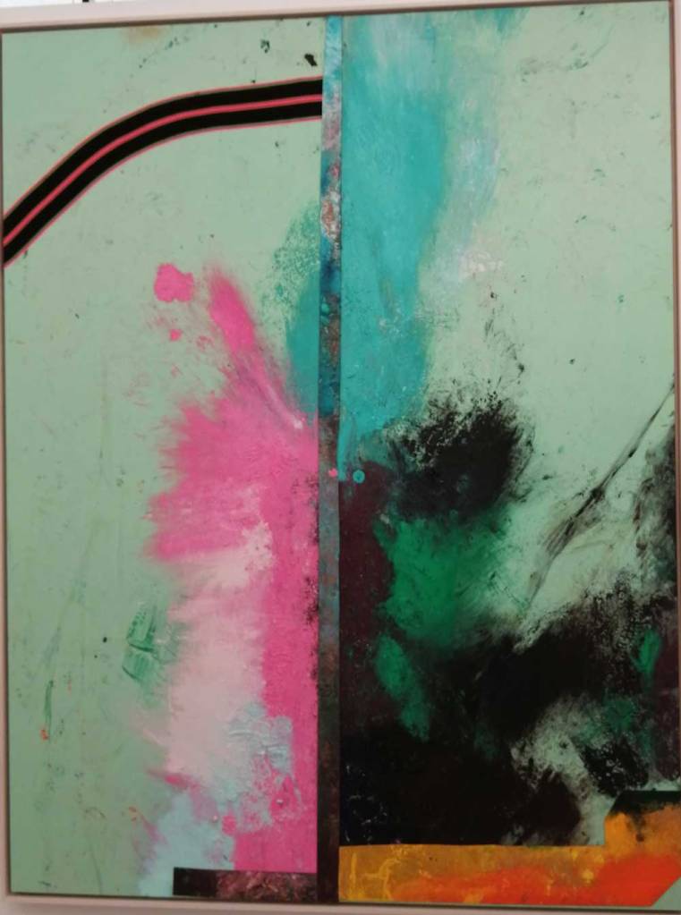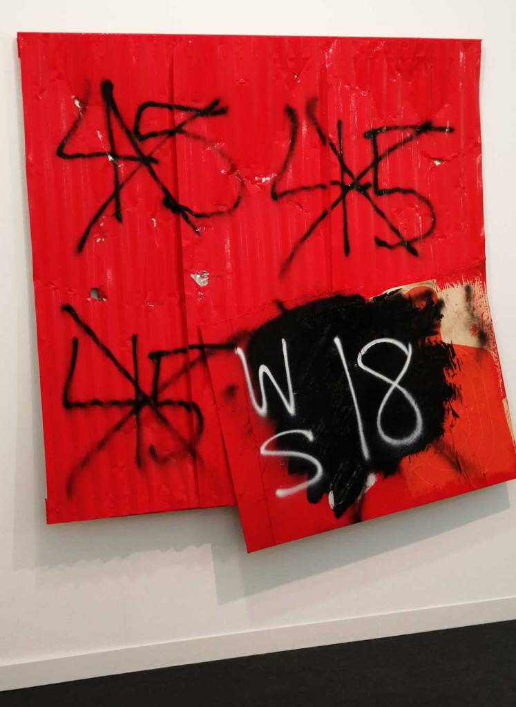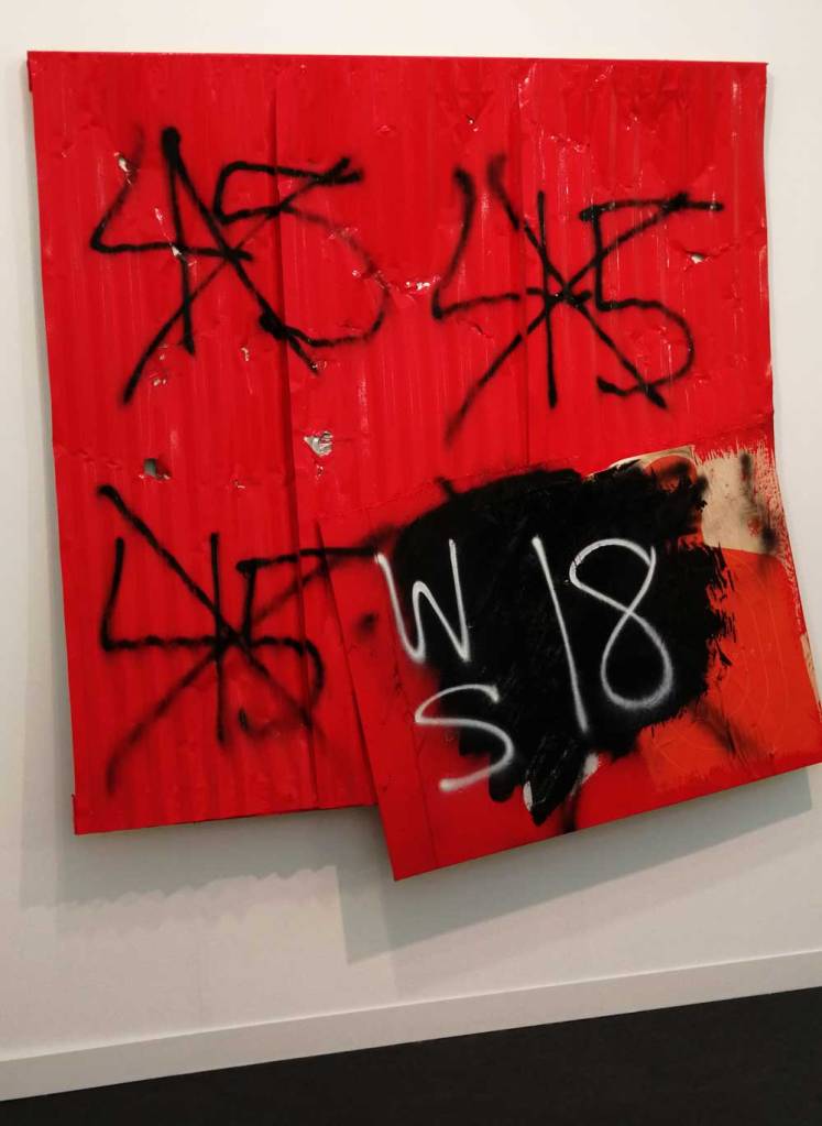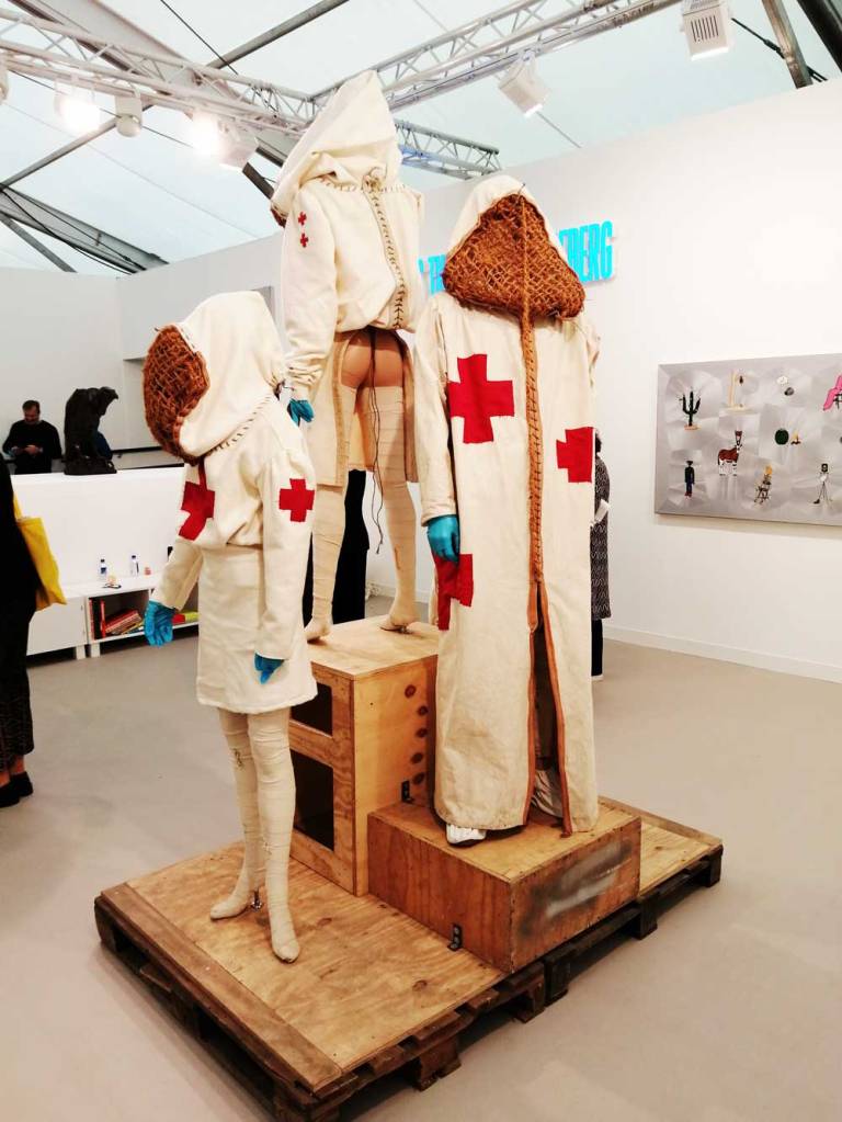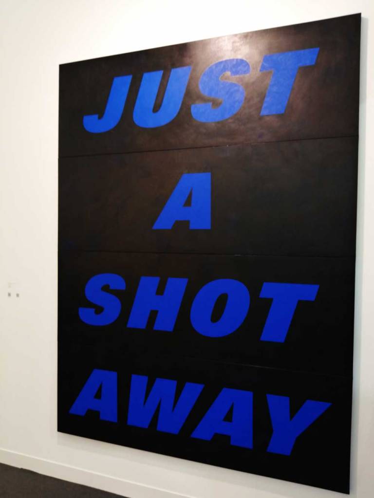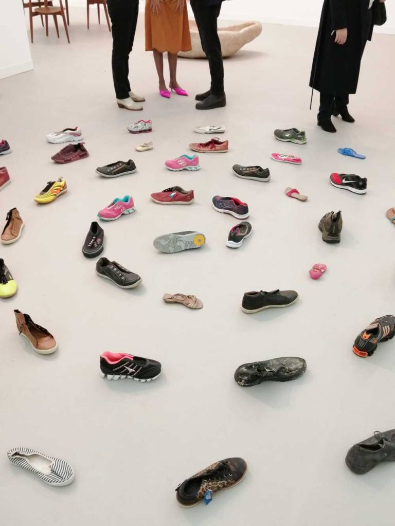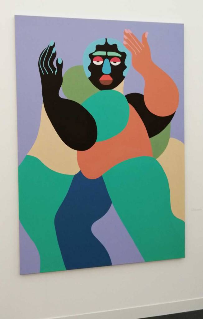 Yes, of course there’s good art, )there’s some bad art as well, I mean, a circle of old training shoes, didn’t we all do that in the first few weeks of art school and then cringe a couple of months later?) There are pieces that are worth your time, those Shirley Villavicencio Pizango paintings presented by Ginsberg Galleria (Lima, Peru), those Josh Faught textile pieces shown Kendall Koppe Gallery, Glasgow, rather liked Leanne Ross and that Me Time piece from the same gallery, and that big Hend Samir painting – Gypsum Gallery (Cairo), Liverpool sculptor Jonathan Owen was fun, Awol Erizku‘s Déjà Vu just needed a Tox 21 or a 10 Foot adding to it, some of those Pippy Houldsworth Gallery paintings and no, I’m pretty sure I didn’t see everything – yes I did see some very good art, yes, there was (more than) one or two exciting pieces, that very big Justin Caguiat piece, those Sabine Moritz paintings, nothing revolutionary, but I did enjoy them and those pieces from Mexico City’s OMR Galleria did make me think of Julia Maddison’s work – I do need to say it again, I never really see anything in here that’s better than what I find in the back street spaces of East London or Peckham or the artist-led shows that are getting harder and harder to put on.