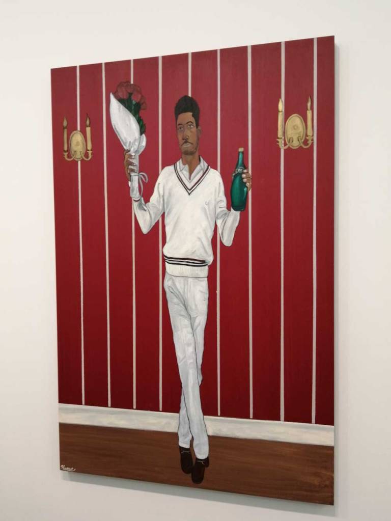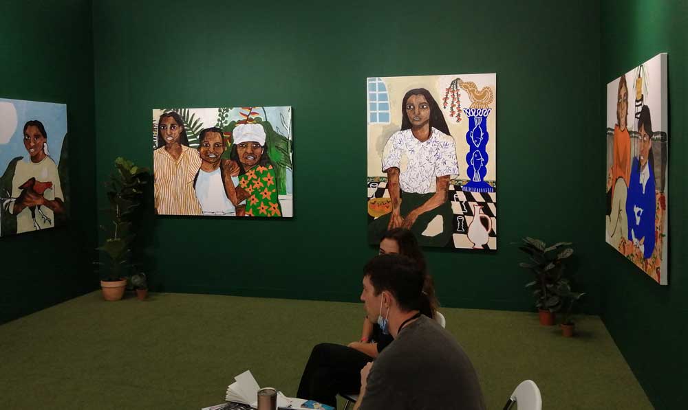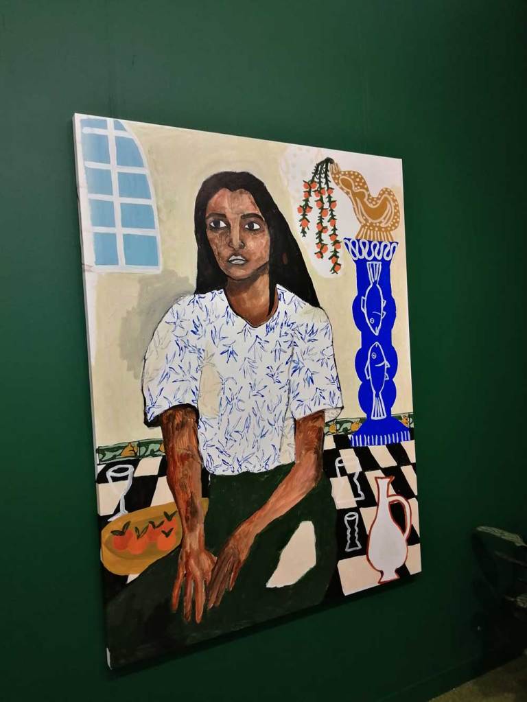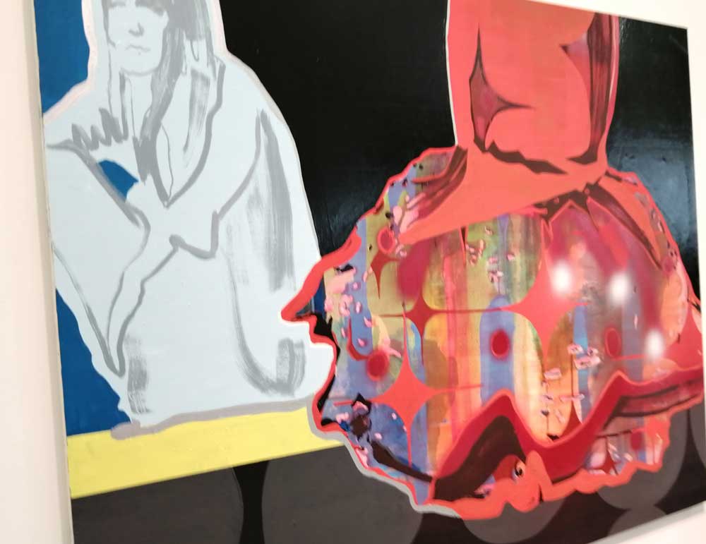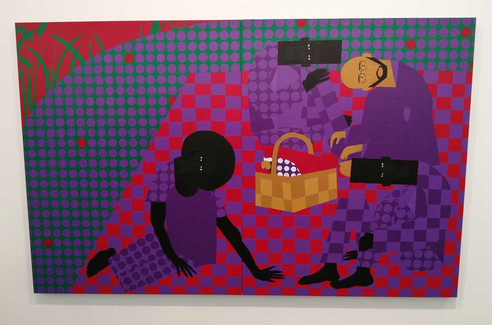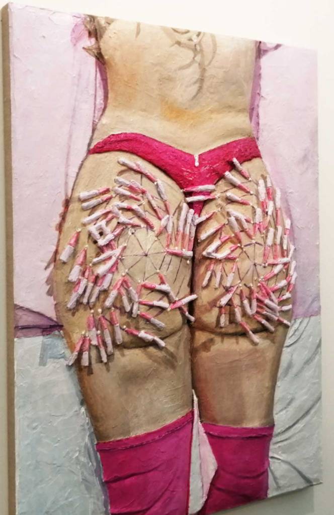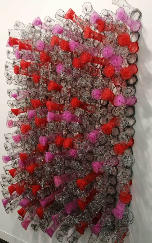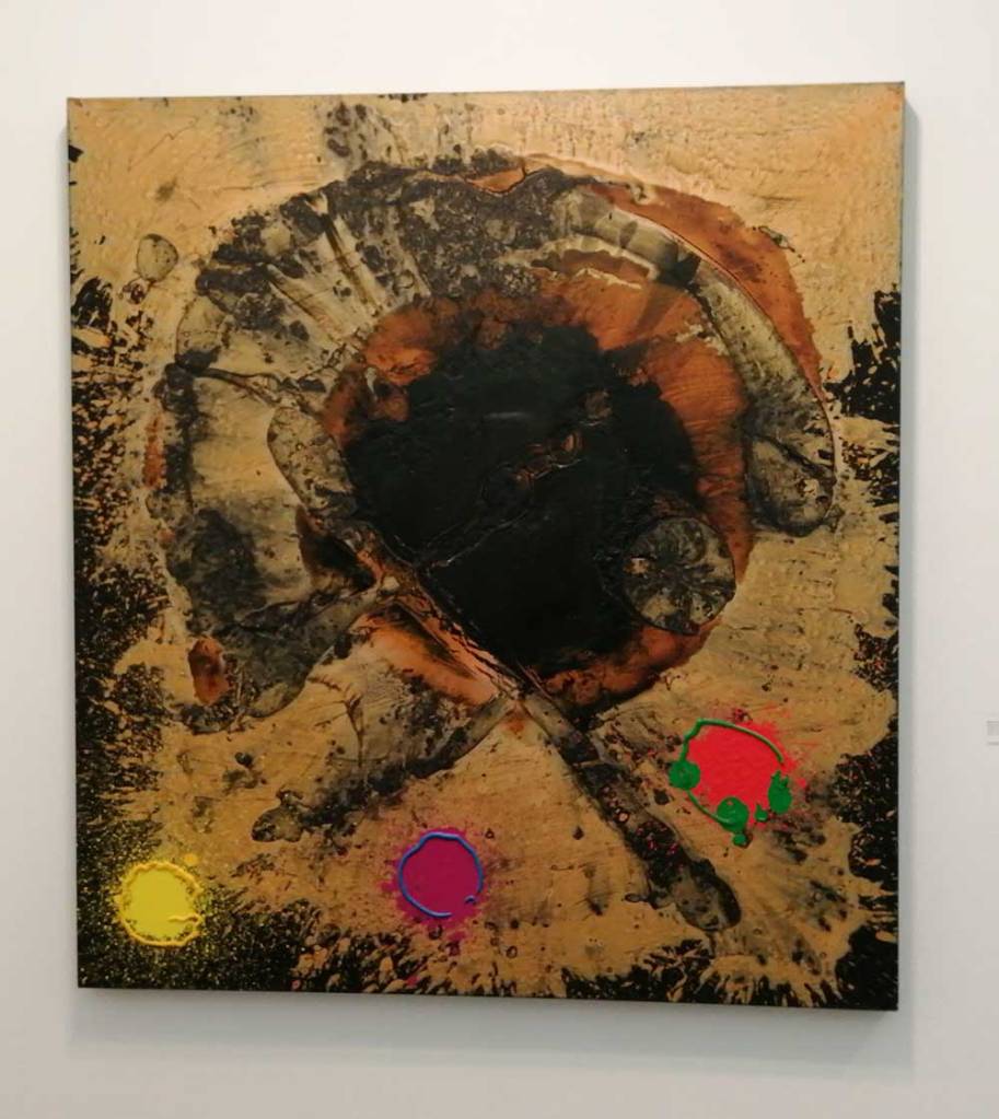Yes, of course there’s good art, )there’s some bad art as well, I mean, a circle of old training shoes, didn’t we all do that in the first few weeks of art school and then cringe a couple of months later?) There are pieces that are worth your time, those Shirley Villavicencio Pizango paintings presented by Ginsberg Galleria (Lima, Peru), those Josh Faught textile pieces shown Kendall Koppe Gallery, Glasgow, rather liked Leanne Ross and that Me Time piece from the same gallery, and that big Hend Samir painting – Gypsum Gallery (Cairo), Liverpool sculptor Jonathan Owen was fun, Awol Erizku‘s Déjà Vu just needed a Tox 21 or a 10 Foot adding to it, some of those Pippy Houldsworth Gallery paintings and no, I’m pretty sure I didn’t see everything – yes I did see some very good art, yes, there was (more than) one or two exciting pieces, that very big Justin Caguiat piece, those Sabine Moritz paintings, nothing revolutionary, but I did enjoy them and those pieces from Mexico City’s OMR Galleria did make me think of Julia Maddison’s work – I do need to say it again, I never really see anything in here that’s better than what I find in the back street spaces of East London or Peckham or the artist-led shows that are getting harder and harder to put on.