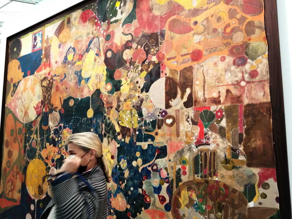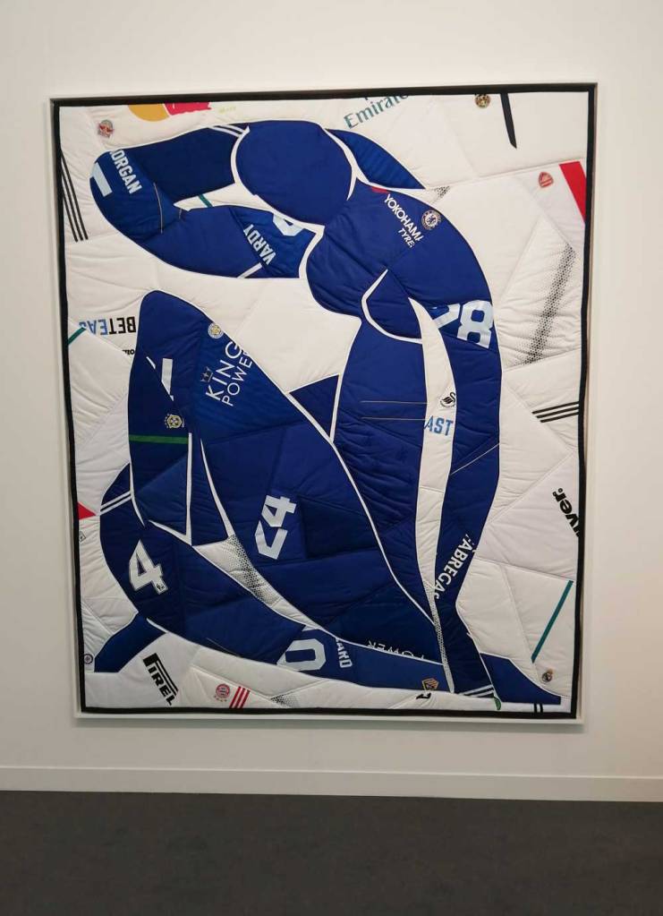 There’s an artwork in here made up of football shirts, a piece by Hank Willis Thomas called Blue Nude (2021), a rather clever piece, I like it, fun piece, could be a different colour maybe, but I do like it, it is something different – “is that a Chelsea kit?” asked the overdressed expensively-smelling woman standing right next to me, “well there are a couple of Chelsea shirts in there and that’s a Leicester City shirt and there’s an Arsenal away shirt and that looks like Madrid”, a fun piece actually, Jamie Vardy will probably buy it to put in his footballer’s mansion, “that’s all a bit last year, I’m following Newcastle now, what colour do they play in?” asks perfumed woman. Who does buy this art? Indeed who pays these ticket prices to get in here on the first day? Yeah, I’ve got a damn press pass, no, I can’t afford the entry price, I’m on a freebie, but who does buy in? Who are these people?