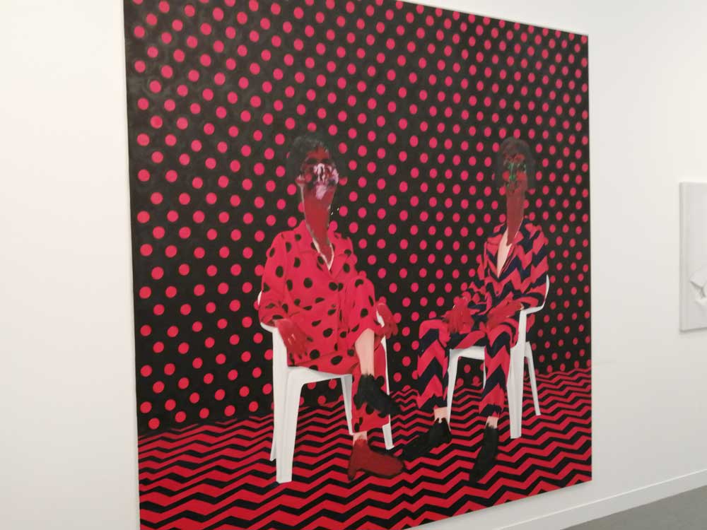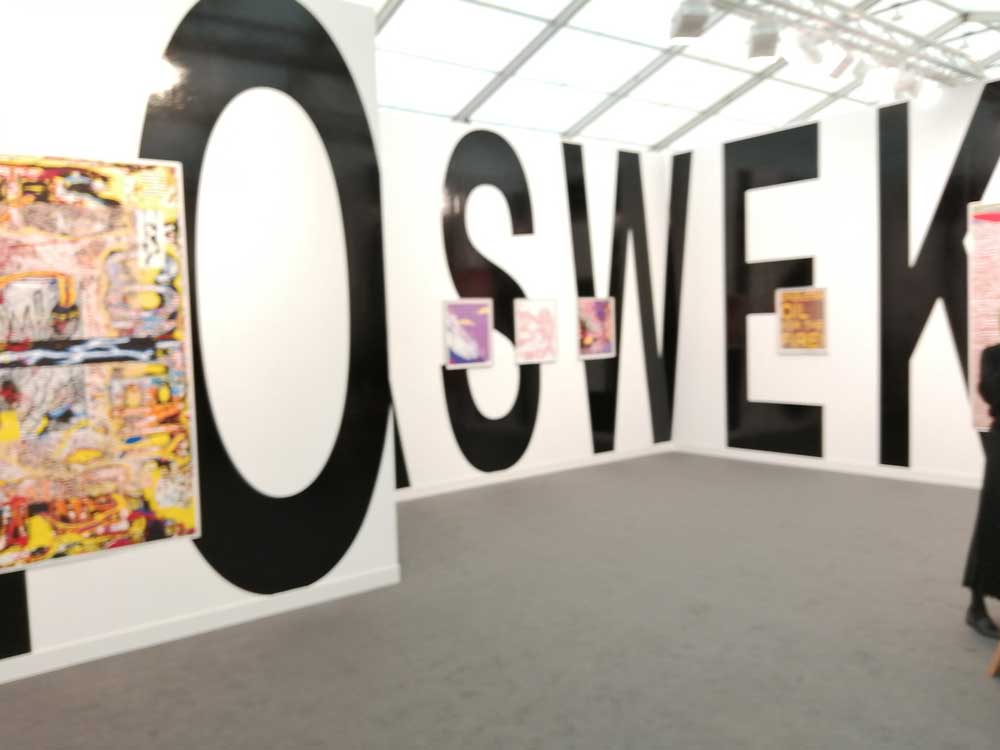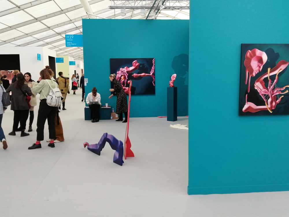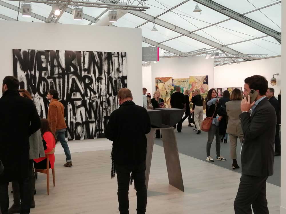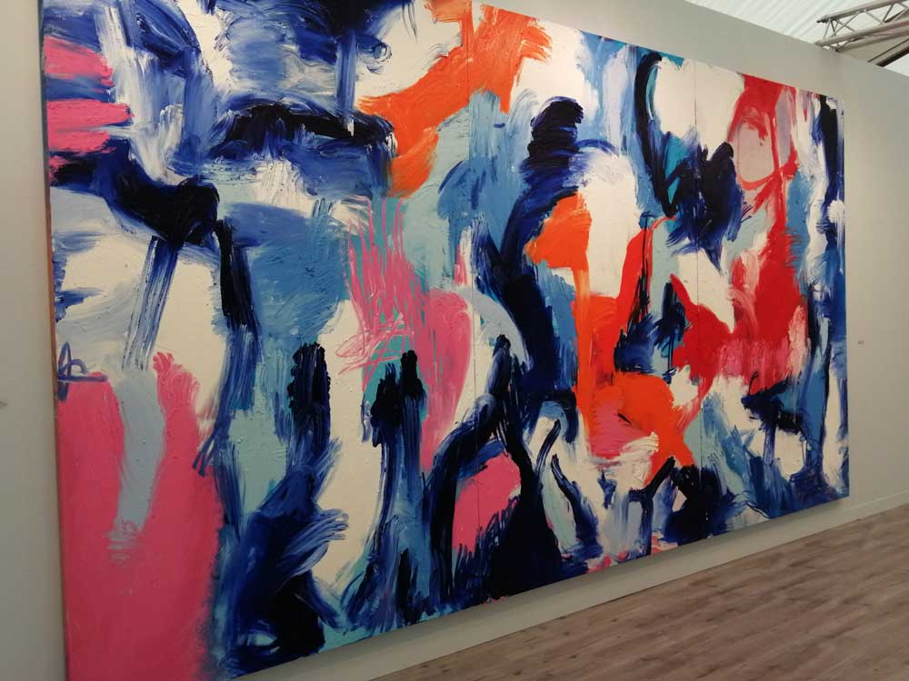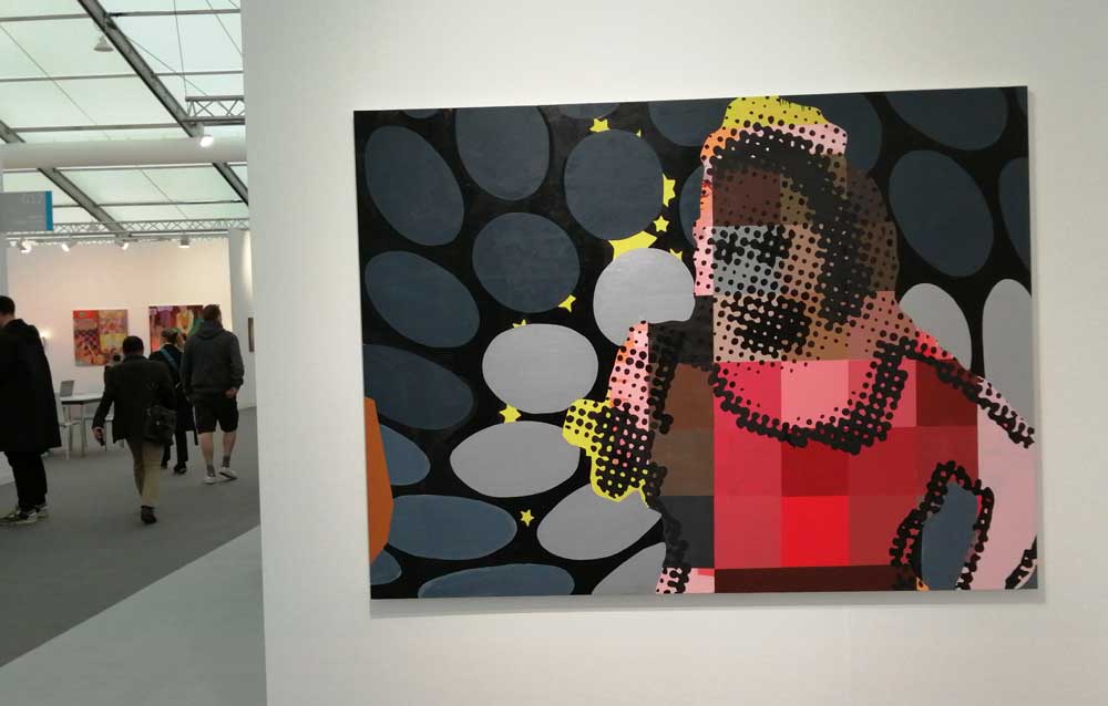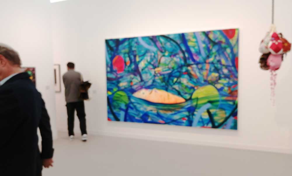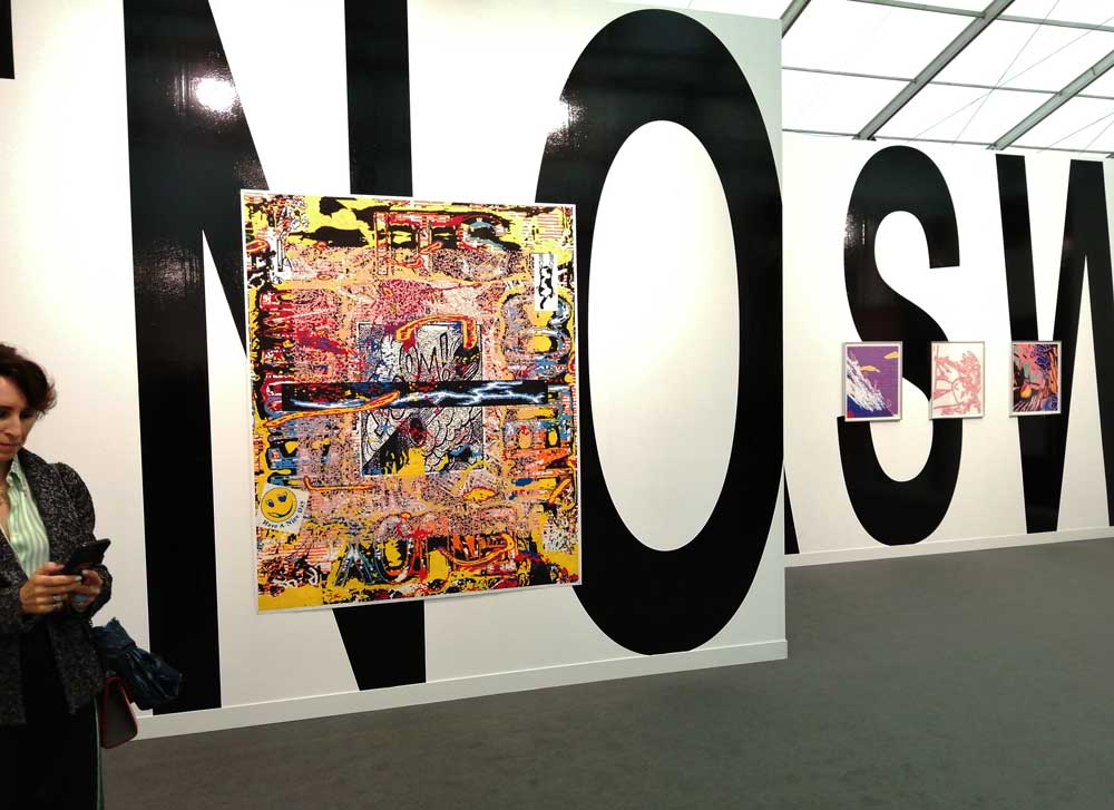 You’re bombarded with it all, paintings to the left, paintings to the right, lines and lines of politely hung gallery booths, dozens and dozens of clean cut galleries from London, Tokyo, New York, Berlin, South Africa, India, Mexico, Margate, Glasgow, hours of them, days of them, no way can you see it all, an endless like of booths and all trying to grab your eye and then when they do giving you the eye and assessing your buying power, check out your shoes, before dismissing you and burying there noses in their laptops again. So much art, way too much art, It all meshes together as one big whole and the one big whole (hole?) Does this year feel even more conservative than last time?
