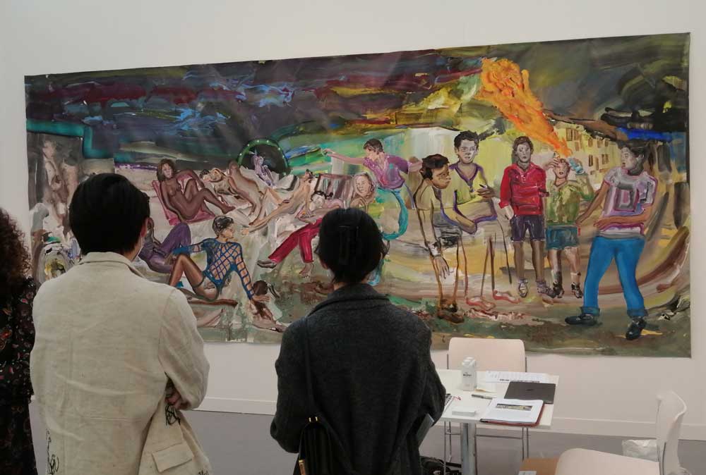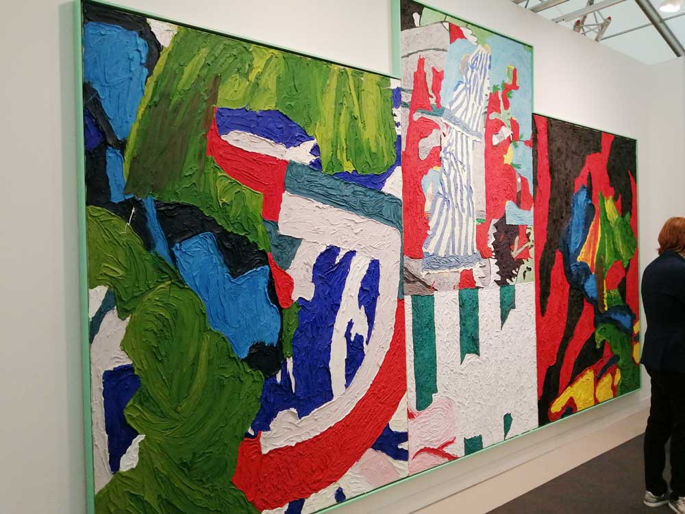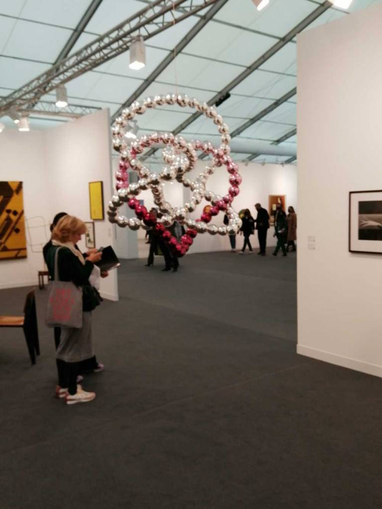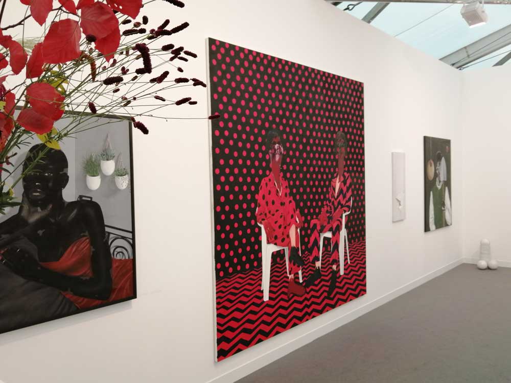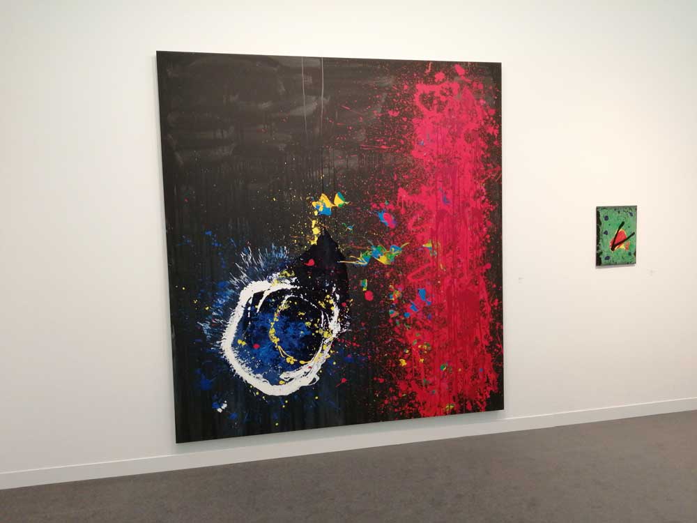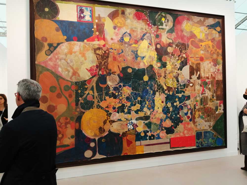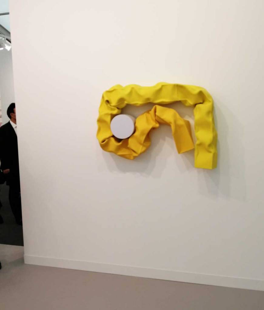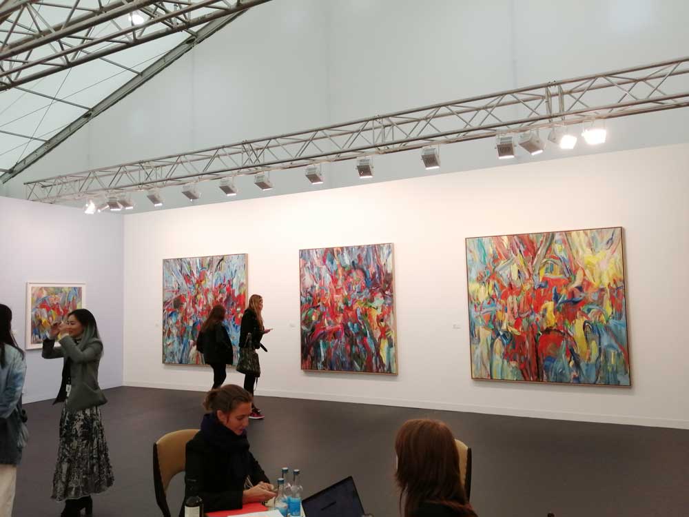 You’re bombarded with it all, paintings to the left, paintings to the right, lines and lines of politely hung gallery booths, dozens and dozens of clean cut galleries from London, Tokyo, New York, Berlin, South Africa, India, Mexico, Margate, Glasgow, hours of them, days of them, no way can you see it all, an endless like of booths and all trying to grab your eye and then when they do giving you the eye and assessing your buying power, check out your shoes, before dismissing you and burying there noses in their laptops again. So much art, way too much art, It all meshes together as one big whole and the one big whole (hole?) Does this year feel even more conservative than last time?