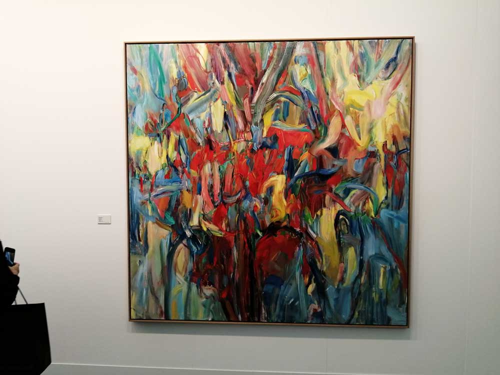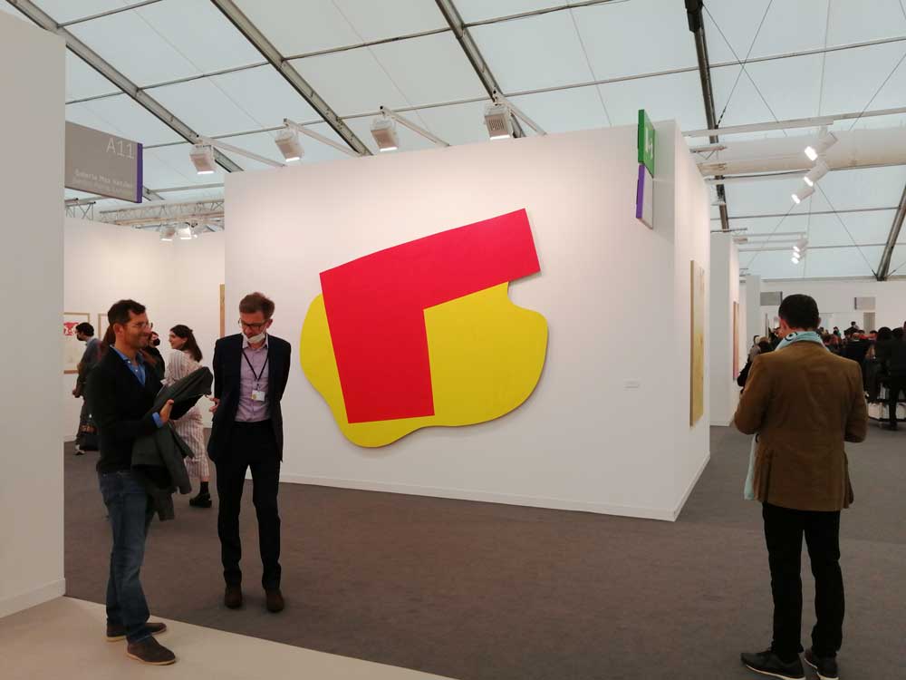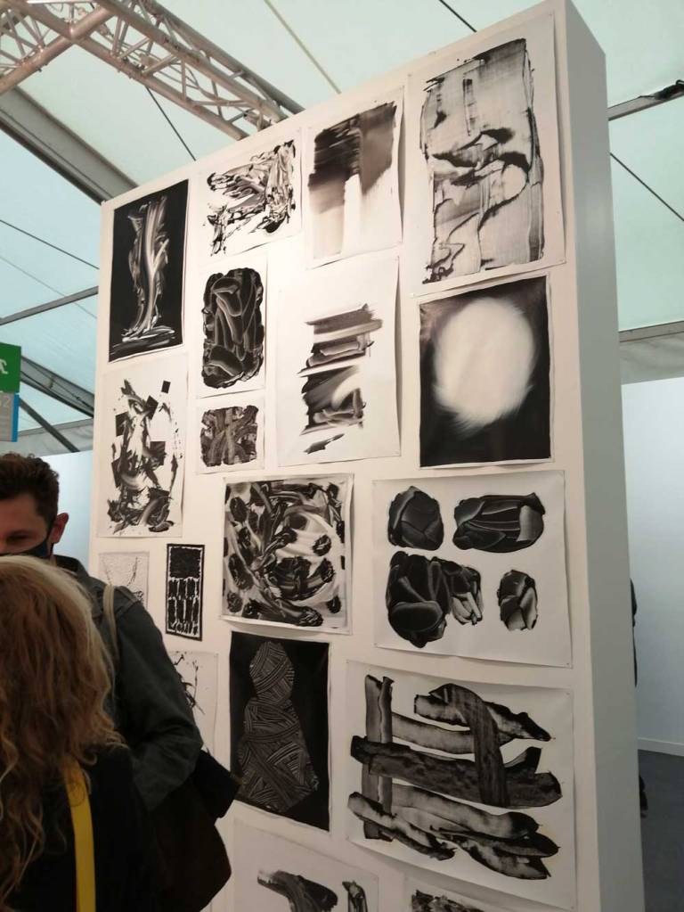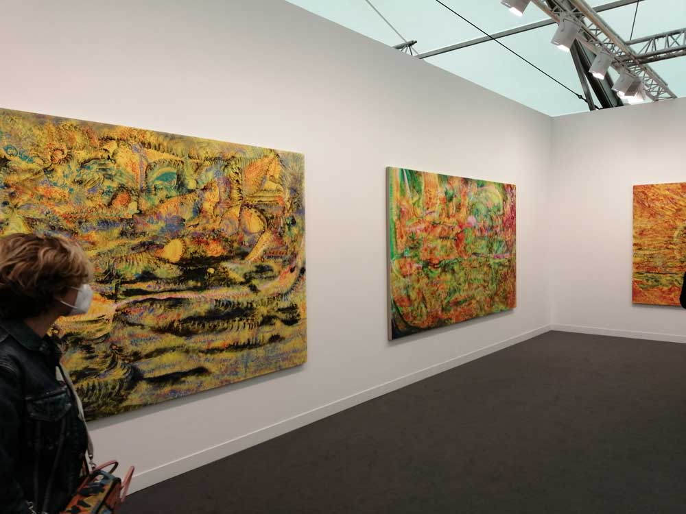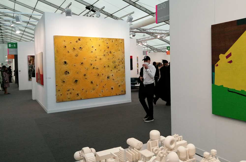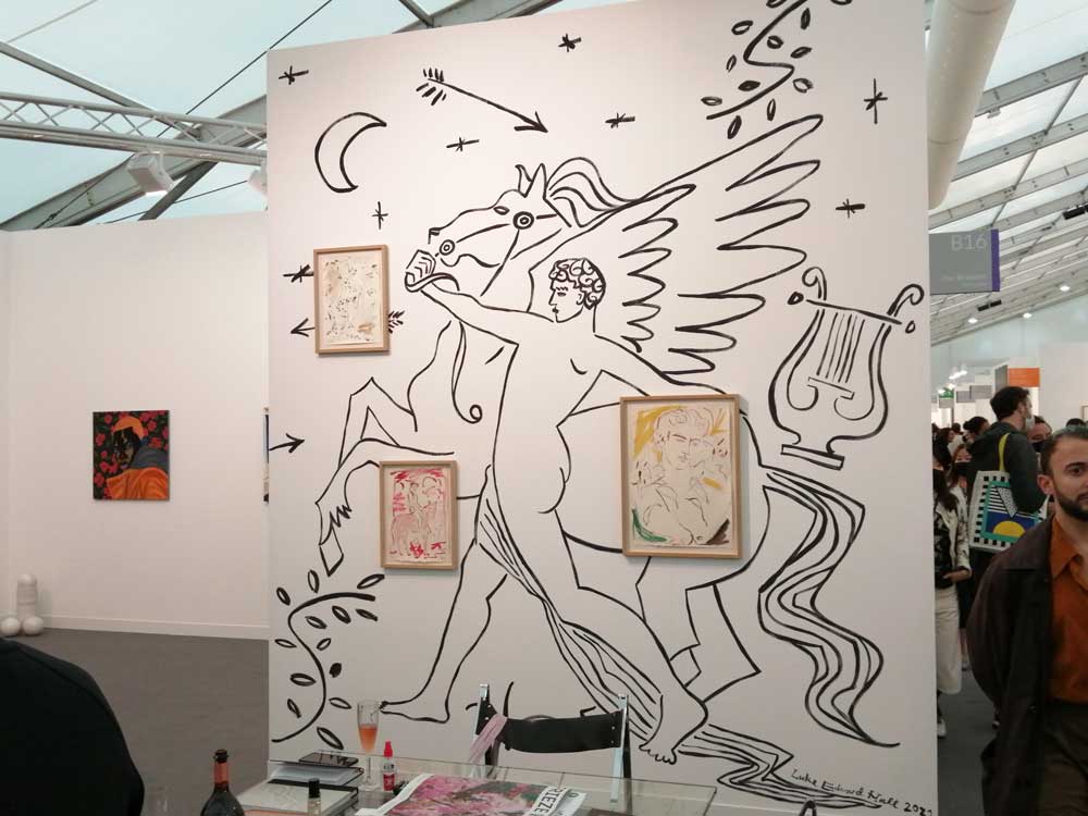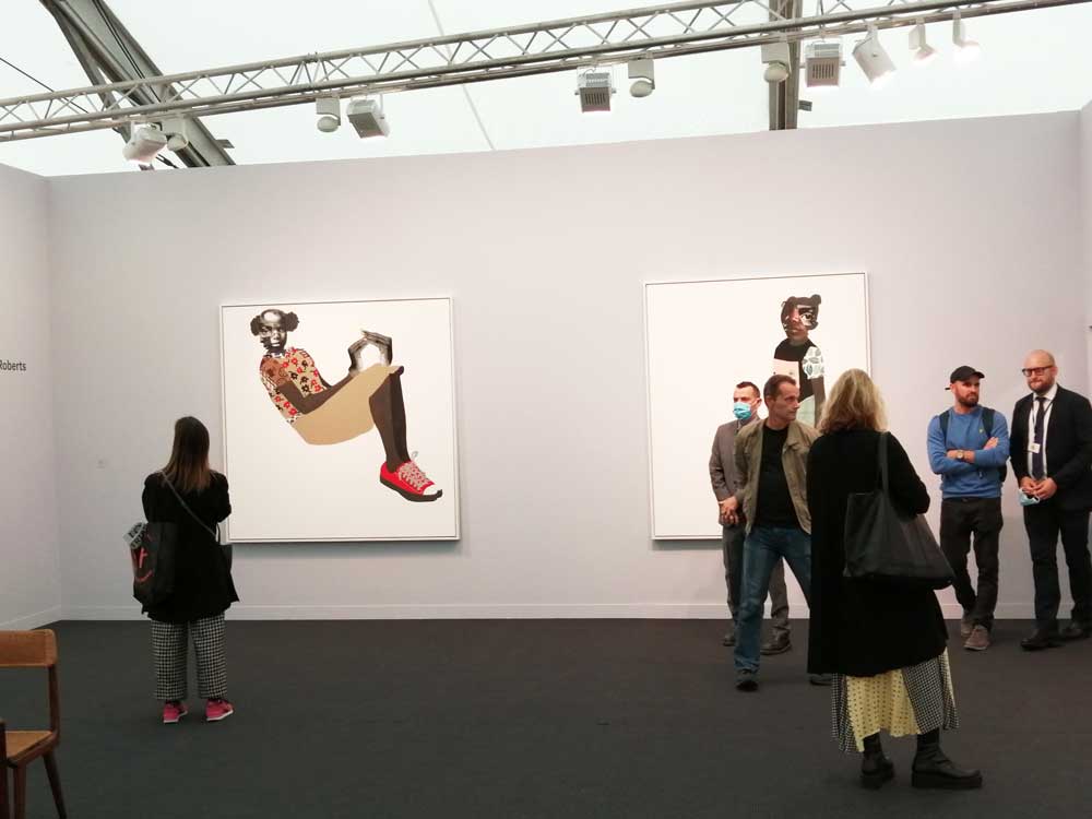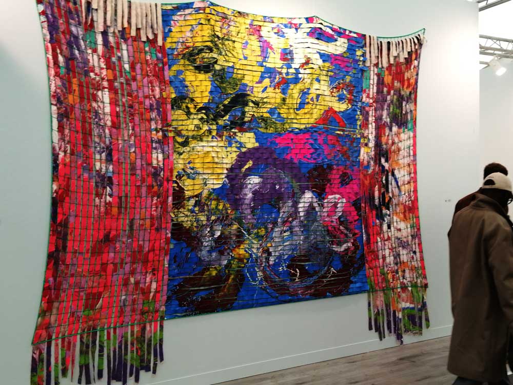 You’re bombarded with it all, paintings to the left, paintings to the right, lines and lines of politely hung gallery booths, dozens and dozens of clean cut galleries from London, Tokyo, New York, Berlin, South Africa, India, Mexico, Margate, Glasgow, hours of them, days of them, no way can you see it all, an endless like of booths and all trying to grab your eye and then when they do giving you the eye and assessing your buying power, check out your shoes, before dismissing you and burying there noses in their laptops again. So much art, way too much art, It all meshes together as one big whole and the one big whole (hole?) Does this year feel even more conservative than last time?