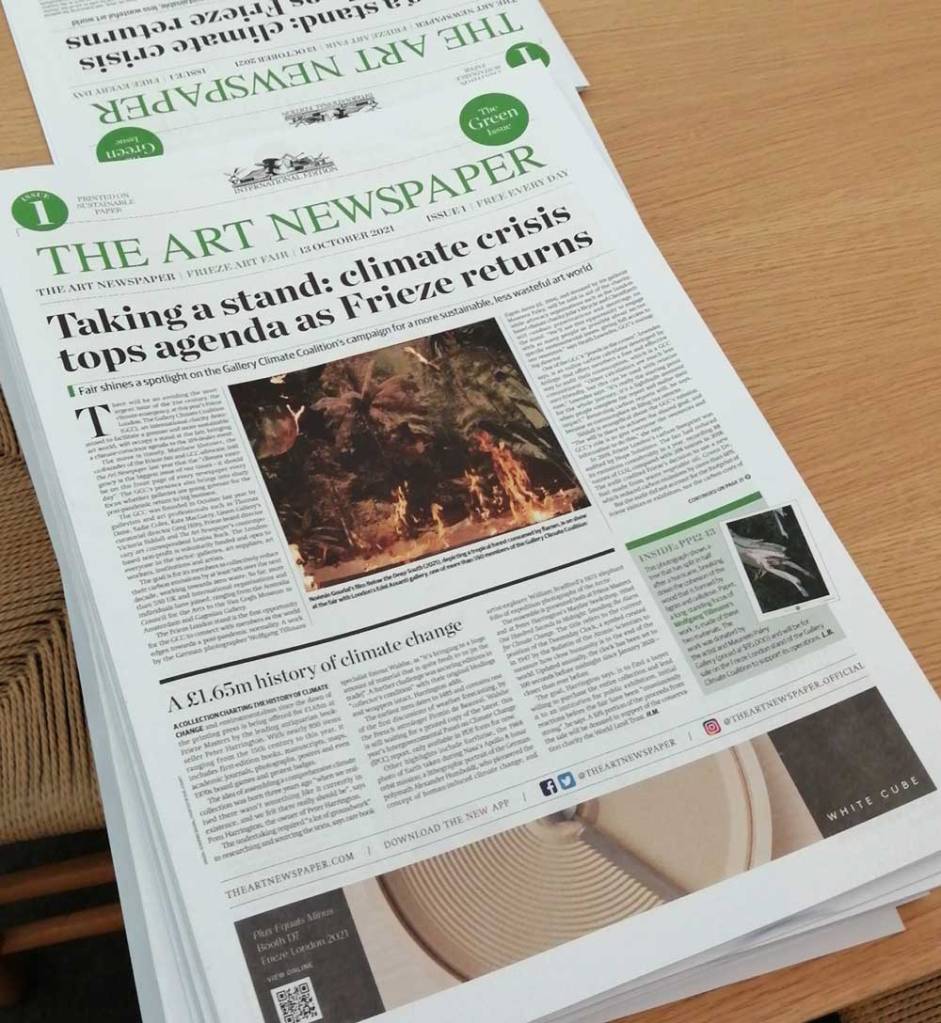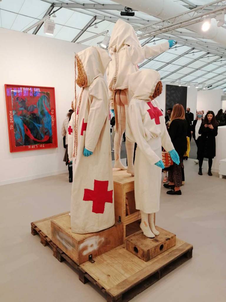 Fours hours in an stuck in the corner being mostly ignored and lacking any kind of visual stimulation to entice you over is a Platform Earth booth, apparently Frieze have given them some free space so they can tell us the art world is addressing the climate change crisis and that most of the galleries here have signed some offsetting agreement that means their conscious is clear, if feel like very quiet tokenism and artwashing the issue away, it feels like bulshit frankly – “Climate crisis tops agenda as Frieze returns” trumpets The Art Newspaper – crap, there’s not a single piece of work or a single gallery aside from this not very engaging visually underwhelming booth tucked to the side and being ignored my most people. Where is the art? Where is the challenge? Where are the visual statements? Why aren’t the galleries questioning themselves? Where are the pieces that question these globe-trotting galleries and these collectors who fly around the world to these giant fairs? Why the fuck is the elephant not in the room? No Arts Newspaper, the Climate crisis clearly does not top the agenda in here! At best there’s a tiny bit of polite tokenism tucked out of the way in the corner. “oh but things are slowly getting better” says the woman on the stall thrusting another copy of The Arts Newspaper at me as some kind of proof, no it damn well isn’t! But hey, I’m alright Jack, my my million dollar dotty spotty Hirst piss-take is holding up well in the market and my art investor says I should try and but another if I’m allowed to, if the gallery will let me. Nah, none of this is right – but we already knew that, we’ve known that for years, less right then ever now though. Yes, there is some good art in here, one or two really great pieces, Deborah Roberts was the “wow”, but no, this does not feel right, it is so easy to get carried away with the excitement, the fun of the fair, and I do love art, I do adore a good painting, I’m a painter, it does excite and I do like to think that art, on the whole is a force for good, is a positive thing, but but but… (sw)