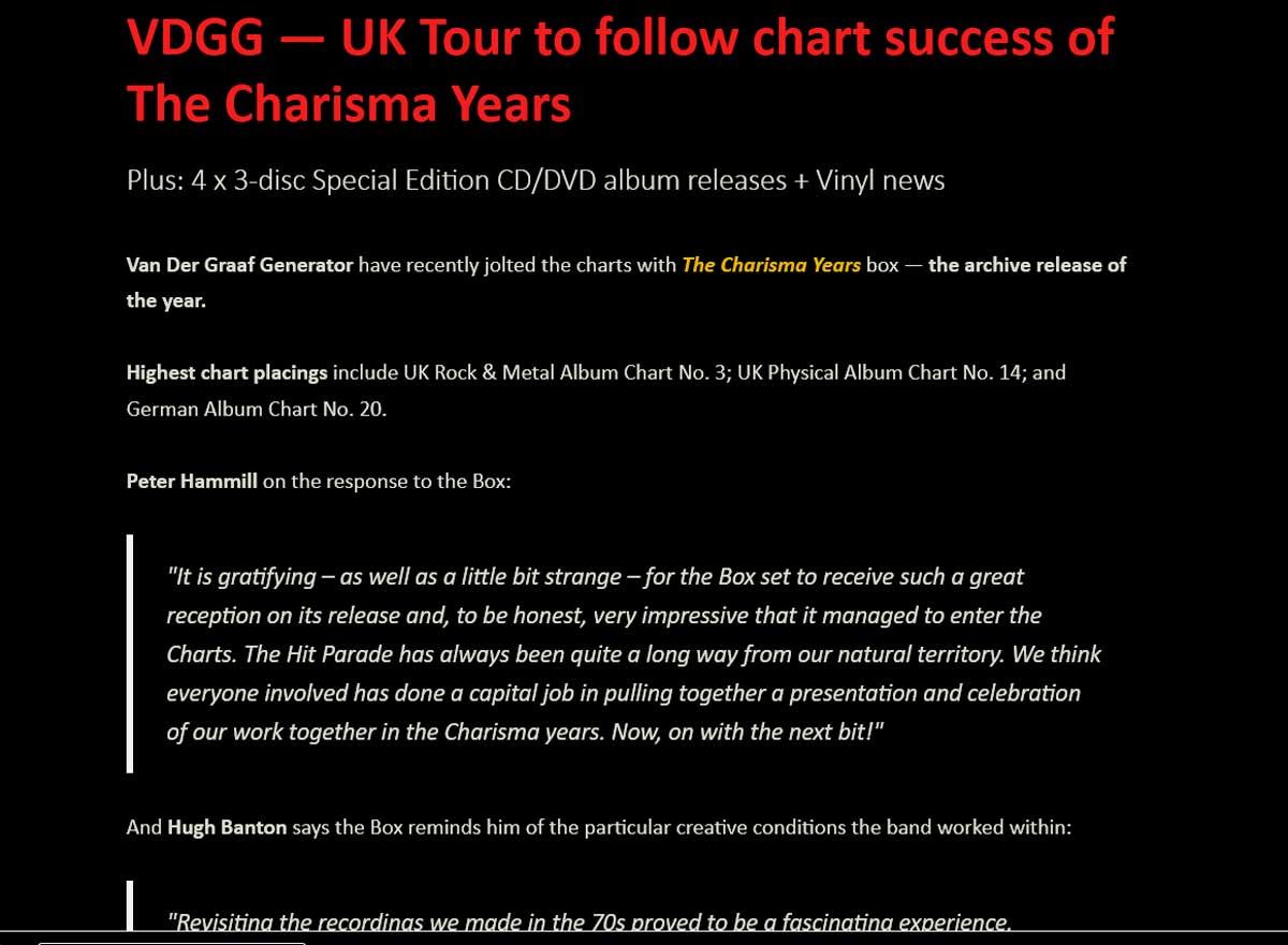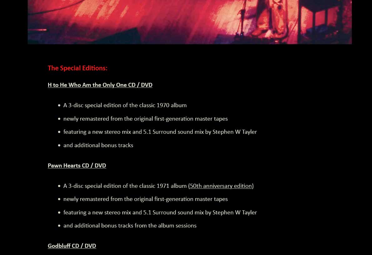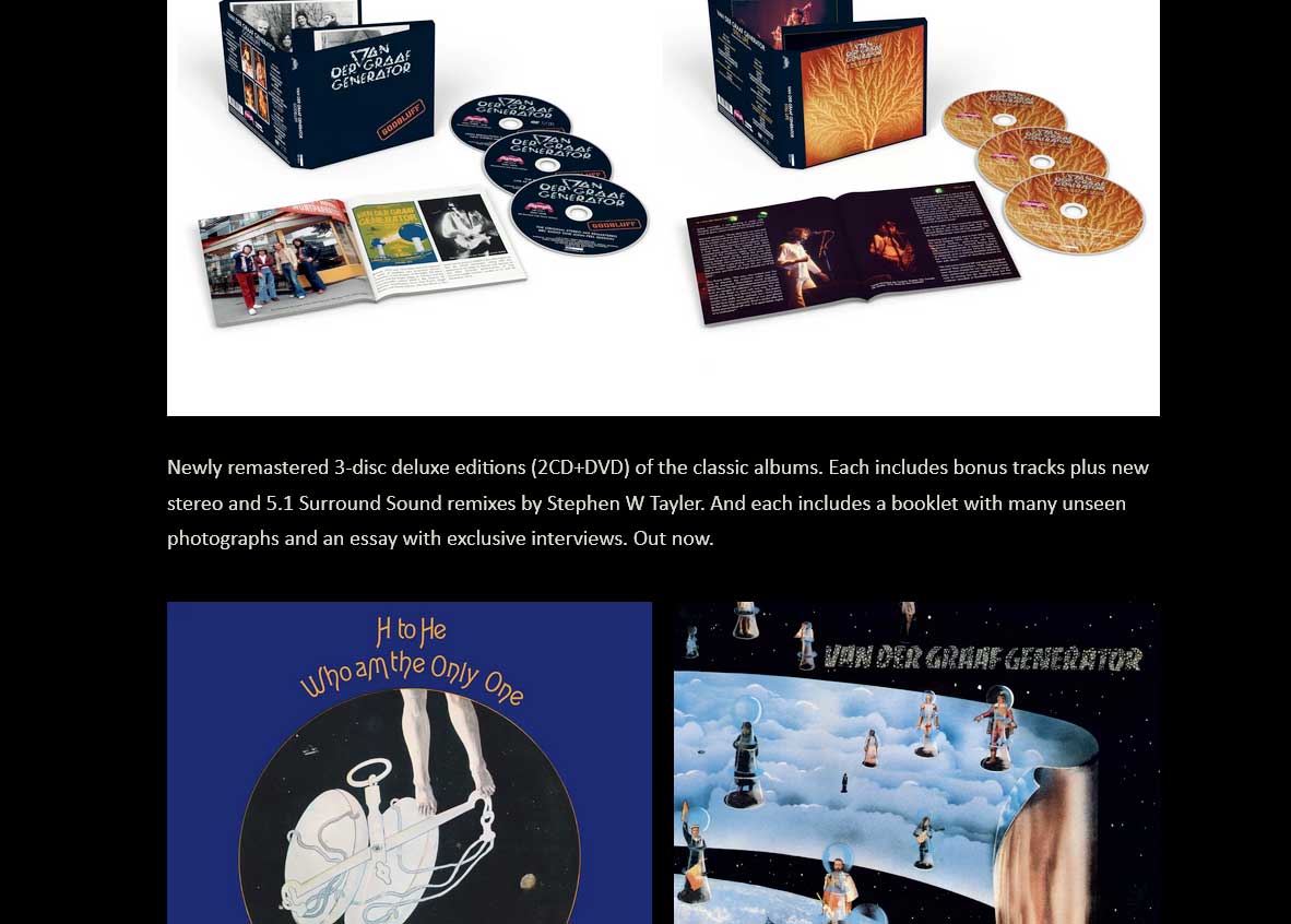 This is such a rich body of work, these are rich albums, and they are very much albums, each one a body of work, these are vital albums and even if you do have them already these new mixes are essential but then if you already know the band then you already know all this and if you haven’t already bought the recent box set then you’ve already rushed out to get these four new versions of these four classic proper very real albums. It was, as I already explained, Pawn Hearts that dragged me in, but it could really be any of these albums – it is hopeless I know, but onward I must go, and try to make a start. They were music visionaries, boundary pushers, they were beautiful, they were savage, they still are this body of albums made between 1970 and 76 (alongside a fifth – World Record) and in between or alongside a batch of equally excellent Peter Hammill solo albums, the whole body of work is special, the never just took the easy route, the Son of Pawn Hearts route as they put it themselves in the excellent sleeve nots that come with each of these releases. Oh look, i could gush on and on (and on), you’ll find plenty of gush if you go back through these fractured Organ pages, there’s such a depth to Van Der Graaf Generator, there’s so much to find in there, so so much (sw)