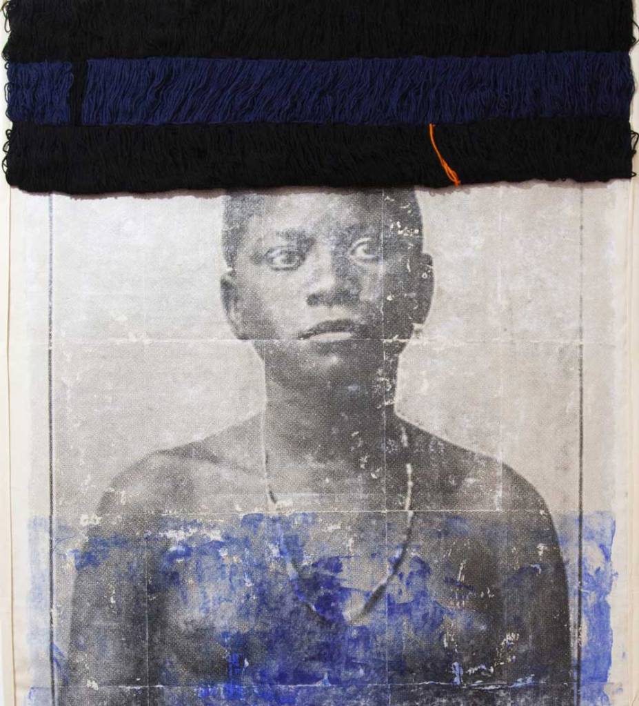 “Vibrant strips of fabric and thread are assembled into graphical textile compositions that hang alongside cracked monochromatic portraits and photographs of lush landscapes and stark architectural details printed onto cotton sheets. Angolan artist Januario Jano’s first solo exhibition with Kristin Hjellegjerde Gallery entitled Imbambas: Unsettled Feelings of Object & Self takes its departing point from the term imbambas (from the Kimbundu language) which refers to things such as furniture and luggage that have an intrinsic and uncanny relationship to the body and self. While the artworks are aesthetically diverse incorporating different materialities and contexts, they share a powerful physical presence that resonates through time and space to present a profound contemplation of the object’s role in the construction and reinforcement of cultural identity”.