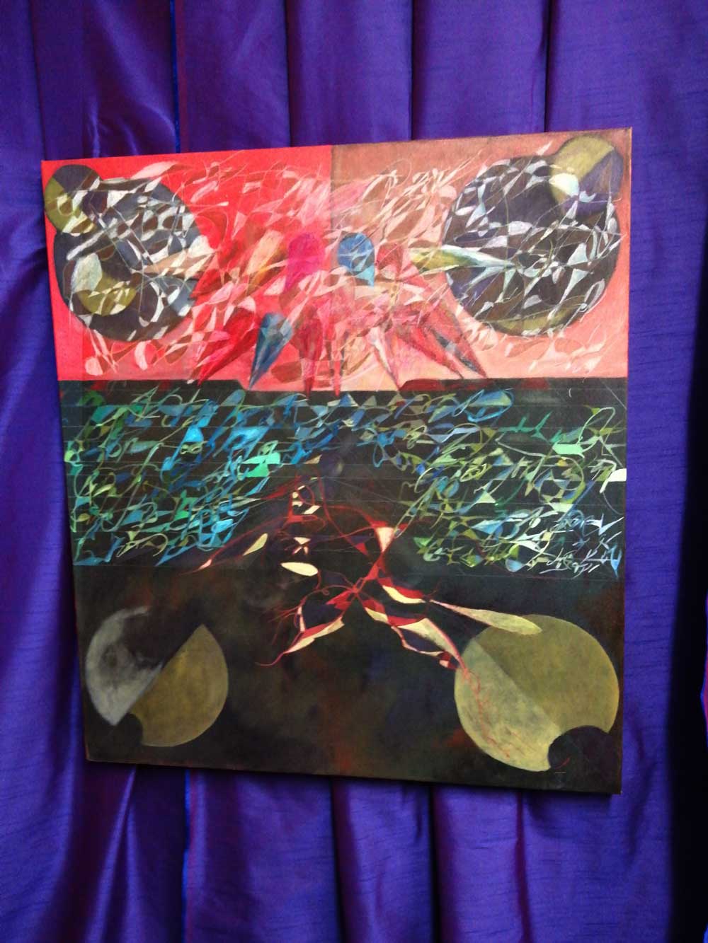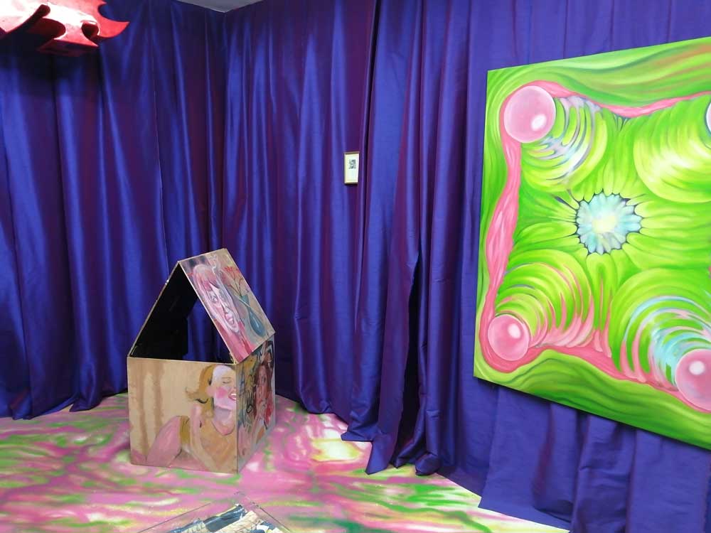 Nothing is labelled, there is no information, hard to believe all the listed artists were actually involved, there is;nt that much work in here – it did feel like an event though, the deep purple drapes, the sounds, the painted floor, the scatter gun approach to hanging, it felt good, it felt like fun, it felt serious, edgy, engaging, some of the actual art is maybe a little primative, it does all work though, as one whole thing it works. I Imagine the opening Friday night was quite a thing, in the cold light of a January Sunday it still feels good (I suspect the flowers look a lot fresher of Friday afternoon). You’ve missed it now (we did preview it last week), these things need documenting though, if an art show happens and no one documents it then did it really happen? A glorious mess of a show, and I mean that as a positive, I can’t claim to know anything of the artists involved, I hope we encounter Chloée Maugile and Laurie Barron and their curating again somewhere along the line, glad we made the effort on such a cold grey January day. Art excites. There are no links, we have nothing more to offer, it did happen though, it was almost a throwback, these things do still happen in East London. (sw)