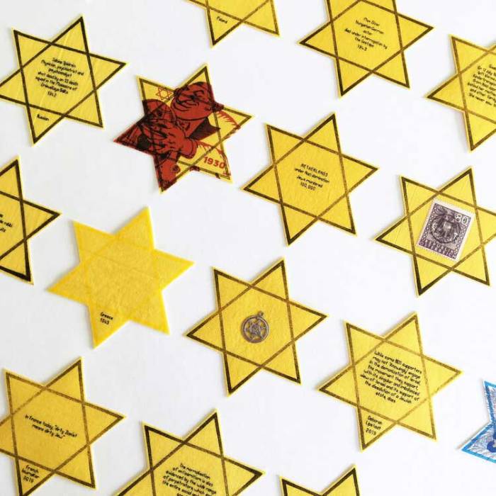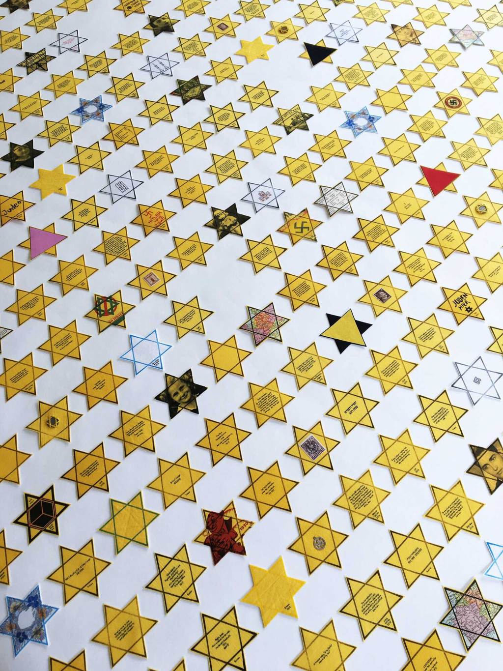 Star of David cloth badges, which were used in Europe to isolate and denigrate individuals because of their religion, have been replicated using dyed and hand printed cotton, the 600 individual stars each representing 10,000 Jewish people who died in the camps. Stars also represent others who were targeted because of their beliefs or sexuality. Each one has been painstakingly hand stitched or printed with historical and contemporary research as well as personal stories of those who survived the devastation”.