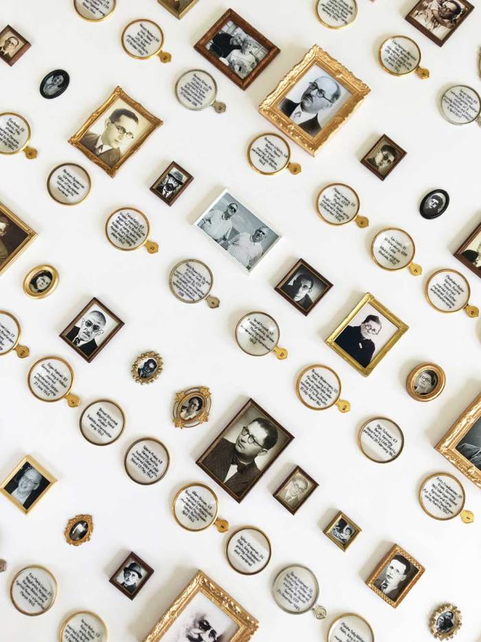 Selection details – Measurement: 126cm x 76cm x 1cm (dimensions variable) Process: Hand stitch Materials: Cotton, silk threads, 108 vintage ophthalmic lenses, 108 miniature picture frames, photographs
