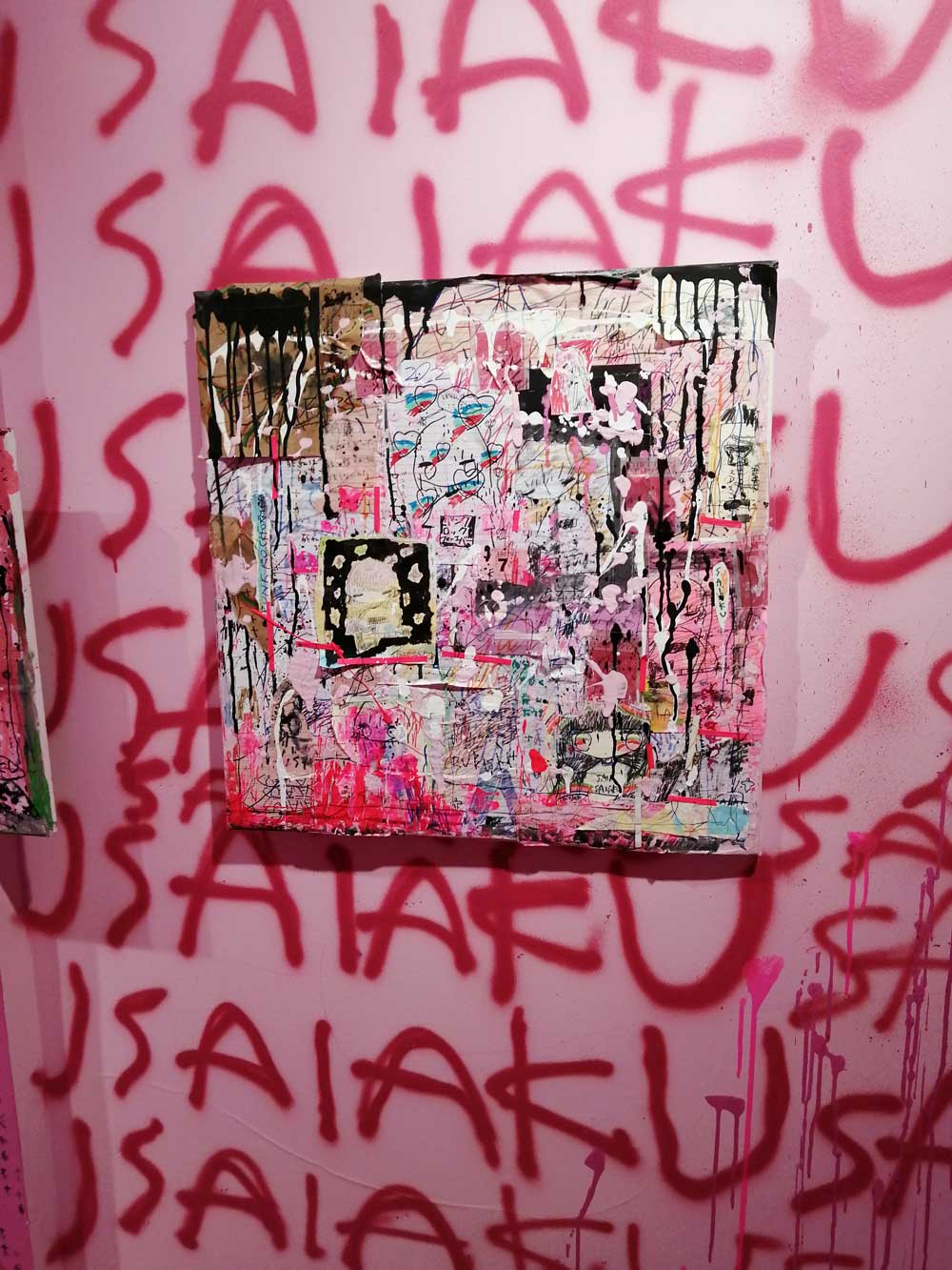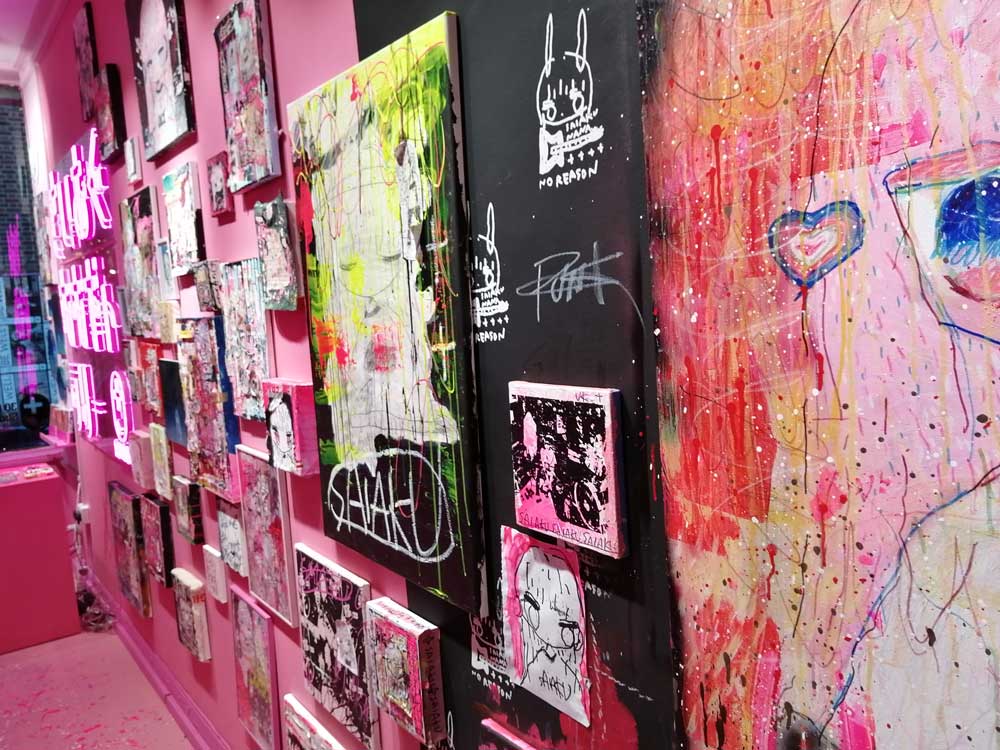 Never mind the numbers, this is exciting! SaiakuNana is sitting in the corner of a gloriously messy gallery that she’s set up herself in an empty shop – a throwback to when East London’s Redchurch Street was alive with art and artists doing their thing on their own terms. Redchurch Street has long since been lost to designer labels and gentrification, I have to confess I’ve walked passed Saiakunana’s space a number of times assuming it was just some fancy designer label clothes outlet or upmarket nail bar or over-priced coffee shop that wasn’t for the likes of me, I’d glanced at it, I’d admired the pink mess, but the fact that it was an art gallery (that had been there since the end of last year) hadn’t registered, you jsut don’t expect art on Redchurch Street any more.