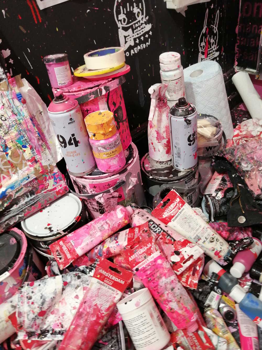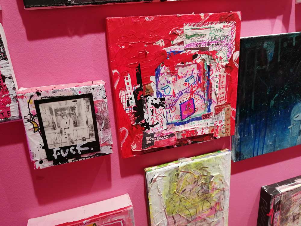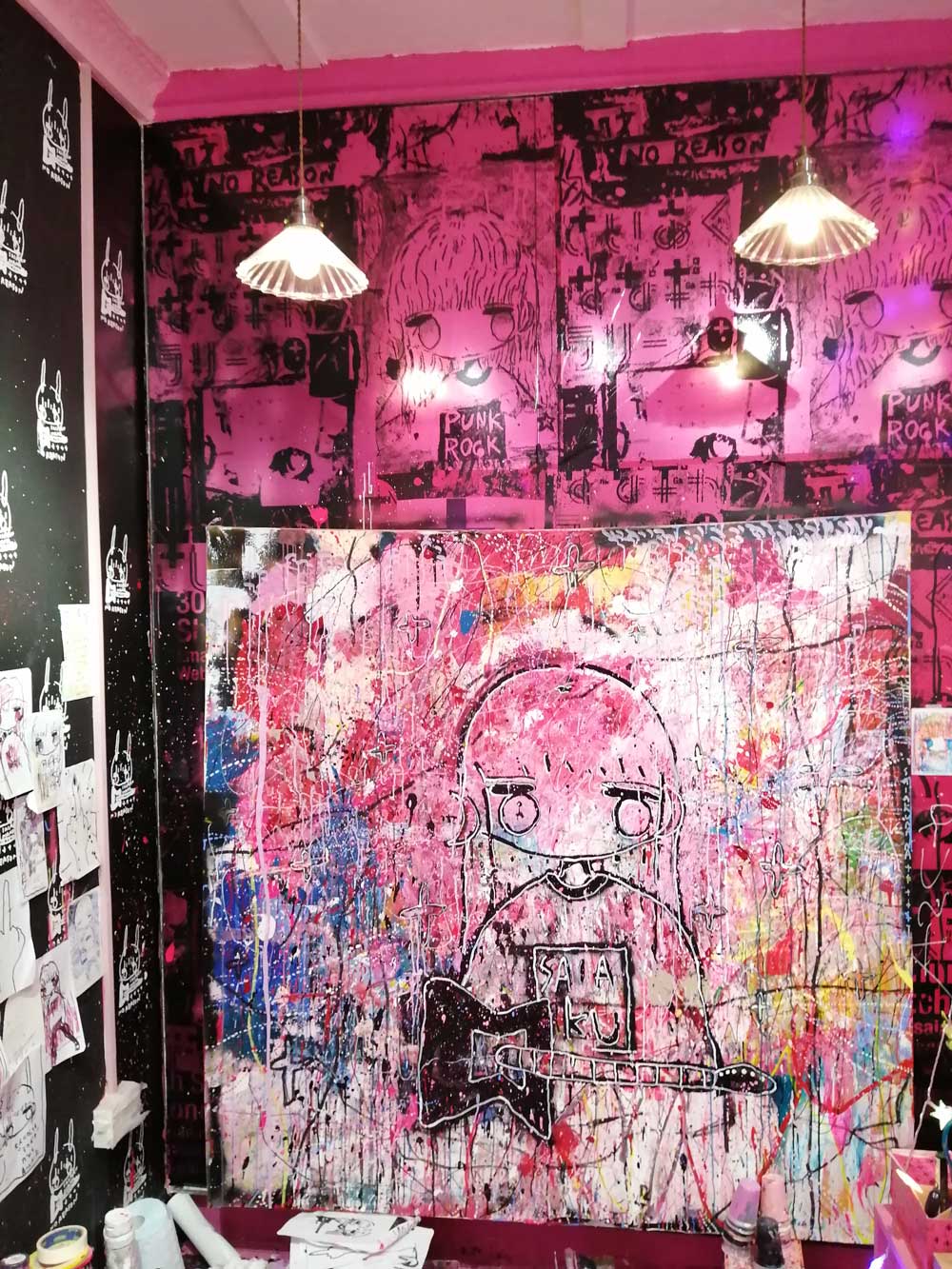 It looks and sounds brilliant both inside and out, SaiakuNana’s paint is everywhere, this is exciting, a glorious riot of punk rock, pink paint, spray cans, splattered shoes, her own music is playing, almost everything is pink, besides her hair, her hair is bright blue, she’s laughing her head off. There is very little order, there’s canvas paintings everywhere, they blend into the walls, I nearly said into the background but none of this is background, everything is jumping out. The floor is glorious, the walls are beautiful, the place is alive with splatter, with all kinds of wordery, imagery, with heart. Heart, the whole room, the walls, the floors , everything is alive with heart! I love it, I love the walls, I love the paint splattered guitar, I love the music, I love the flyers, the books, the paintings, the canvas pieces, the writing on the wall, I love it all. Things are very very are pink, the colour is loud, the mess is a glorious punk rock mess, I love the mess. She bills herself as a contemporary artist on her social media, she’s a painter, a musician and well, she says she’s there until Summer 2022, go see for yourself, go explore the photos gown there, there say dar more than words can, I love it! (sw)