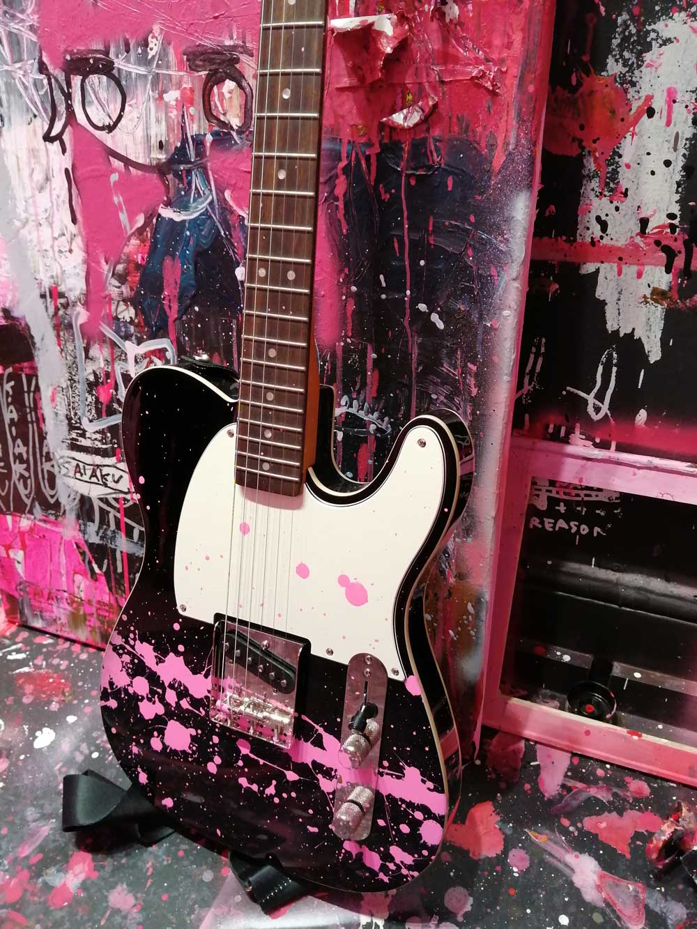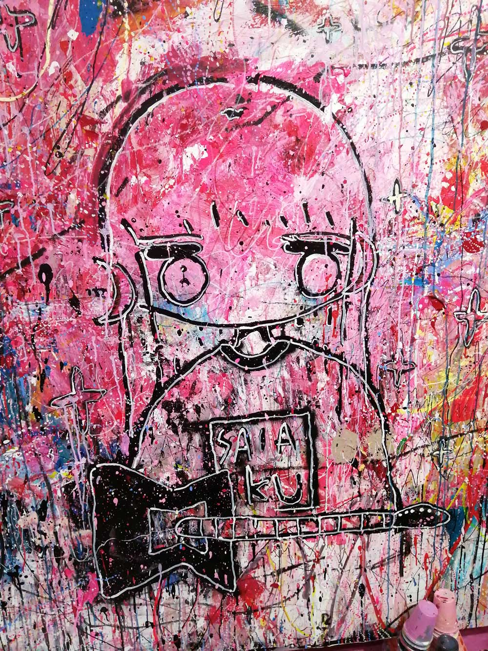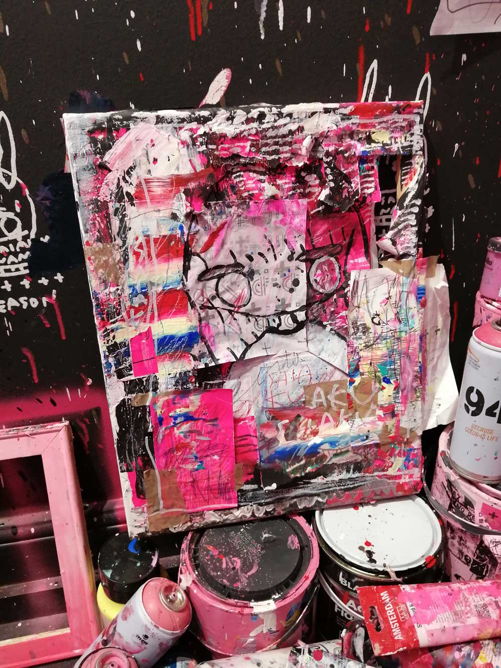It looks and sounds brilliant both inside and out, SaiakuNana’s paint is everywhere, this is exciting, a glorious riot of punk rock, pink paint, spray cans, splattered shoes, her own music is playing, almost everything is pink, besides her hair, her hair is bright blue, she’s laughing her head off. There is very little order, there’s canvas paintings everywhere, they blend into the walls, I nearly said into the background but none of this is background, everything is jumping out. The floor is glorious, the walls are beautiful, the place is alive with splatter, with all kinds of wordery, imagery, with heart. Heart, the whole room, the walls, the floors , everything is alive with heart! I love it, I love the walls, I love the paint splattered guitar, I love the music, I love the flyers, the books, the paintings, the canvas pieces, the writing on the wall, I love it all. Things are very very are pink, the colour is loud, the mess is a glorious punk rock mess, I love the mess. She bills herself as a contemporary artist on her social media, she’s a painter, a musician and well, she says she’s there until Summer 2022, go see for yourself, go explore the photos gown there, there say dar more than words can, I love it! (sw)